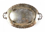 English Victorian oval silver plate etched and fluted tray with initials and grape design edge and handles.