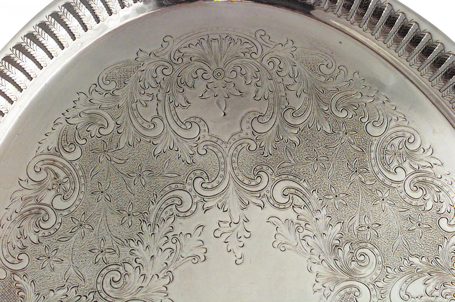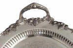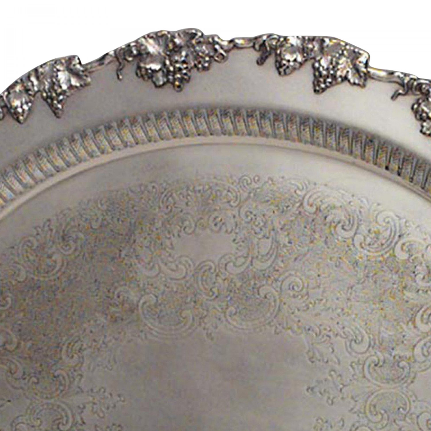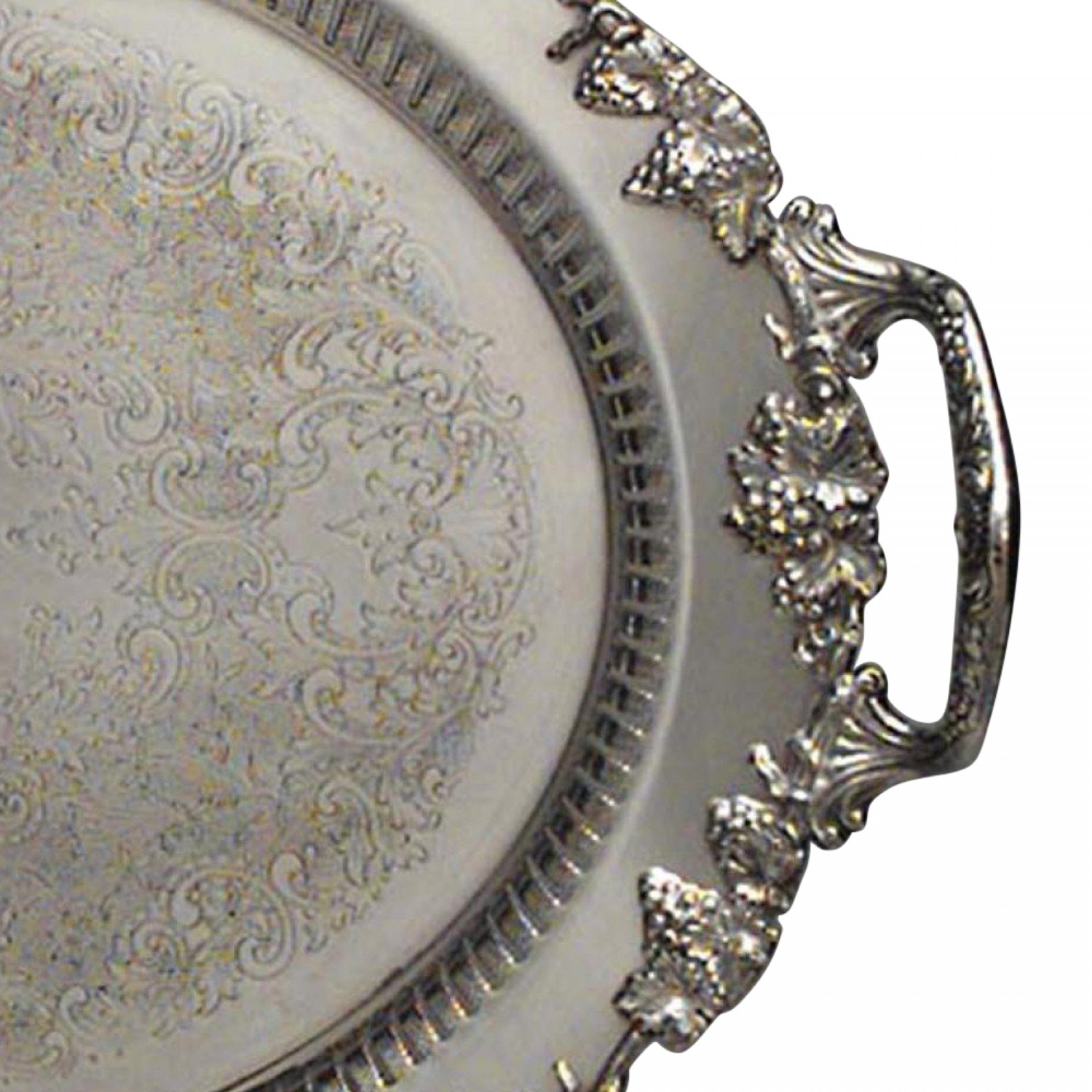 English Victorian oval silver plate tray with handles and grape design on edge with fluted filigree around etched floral center.