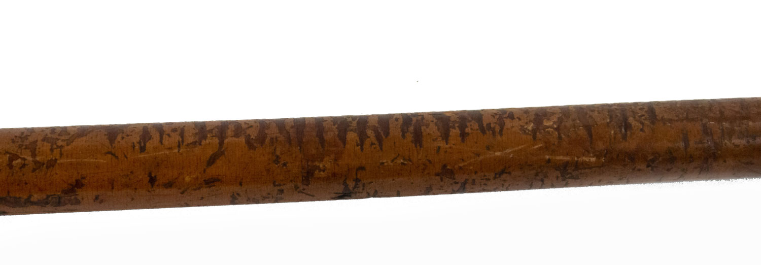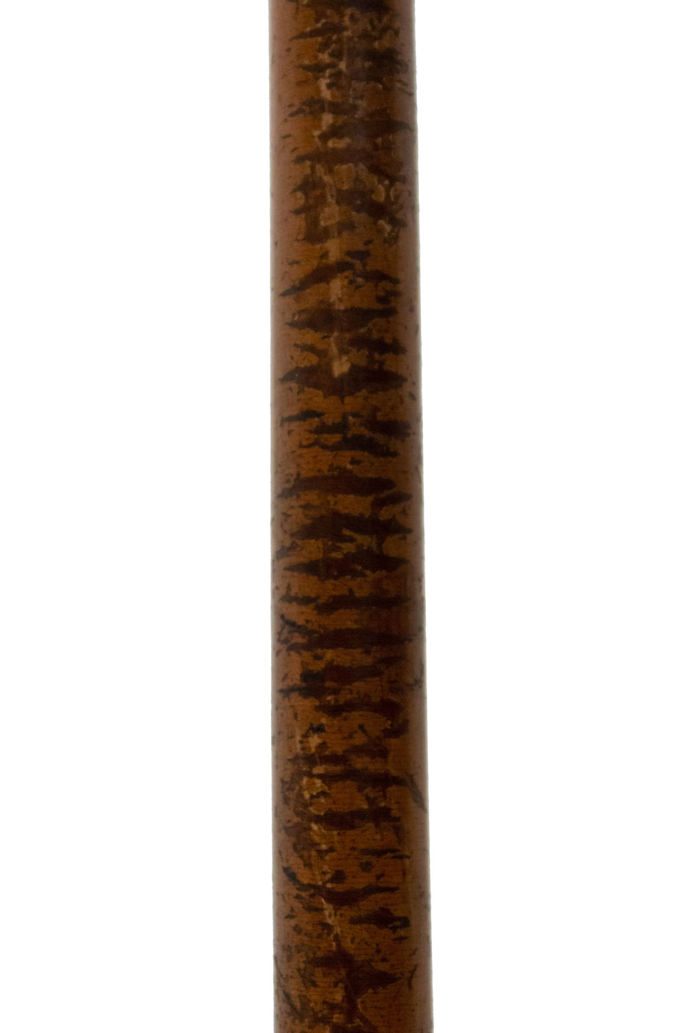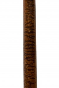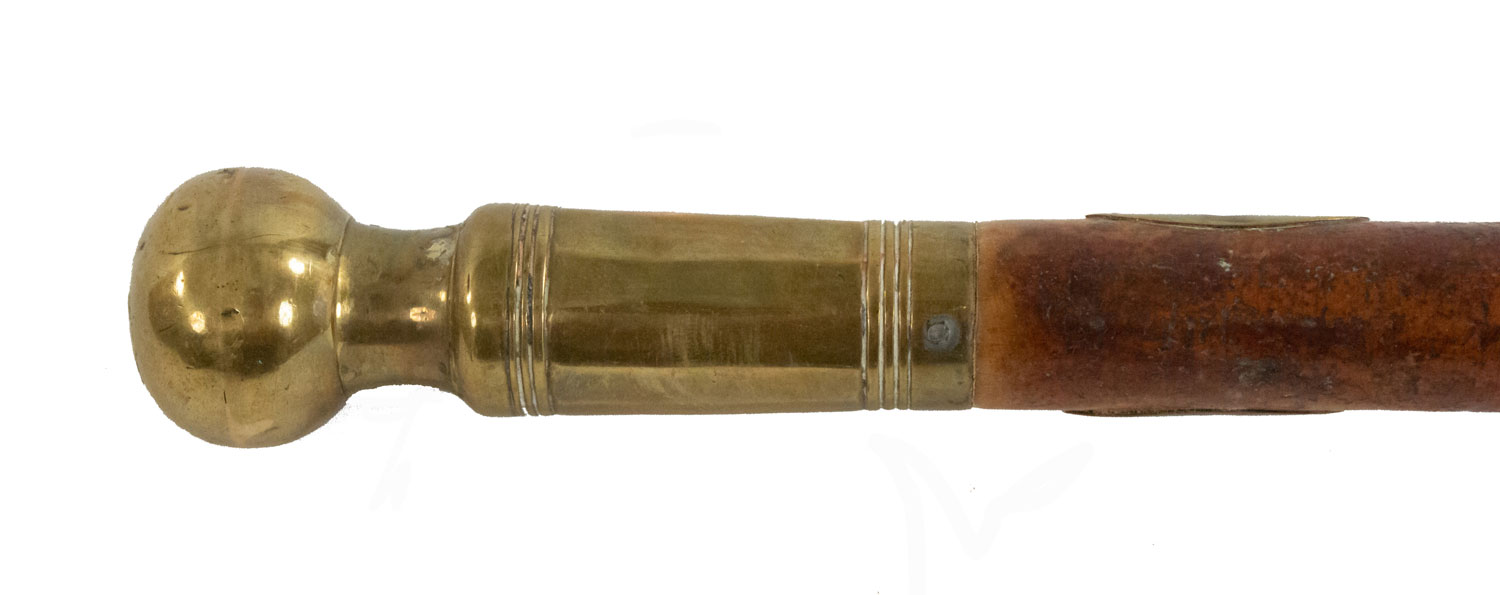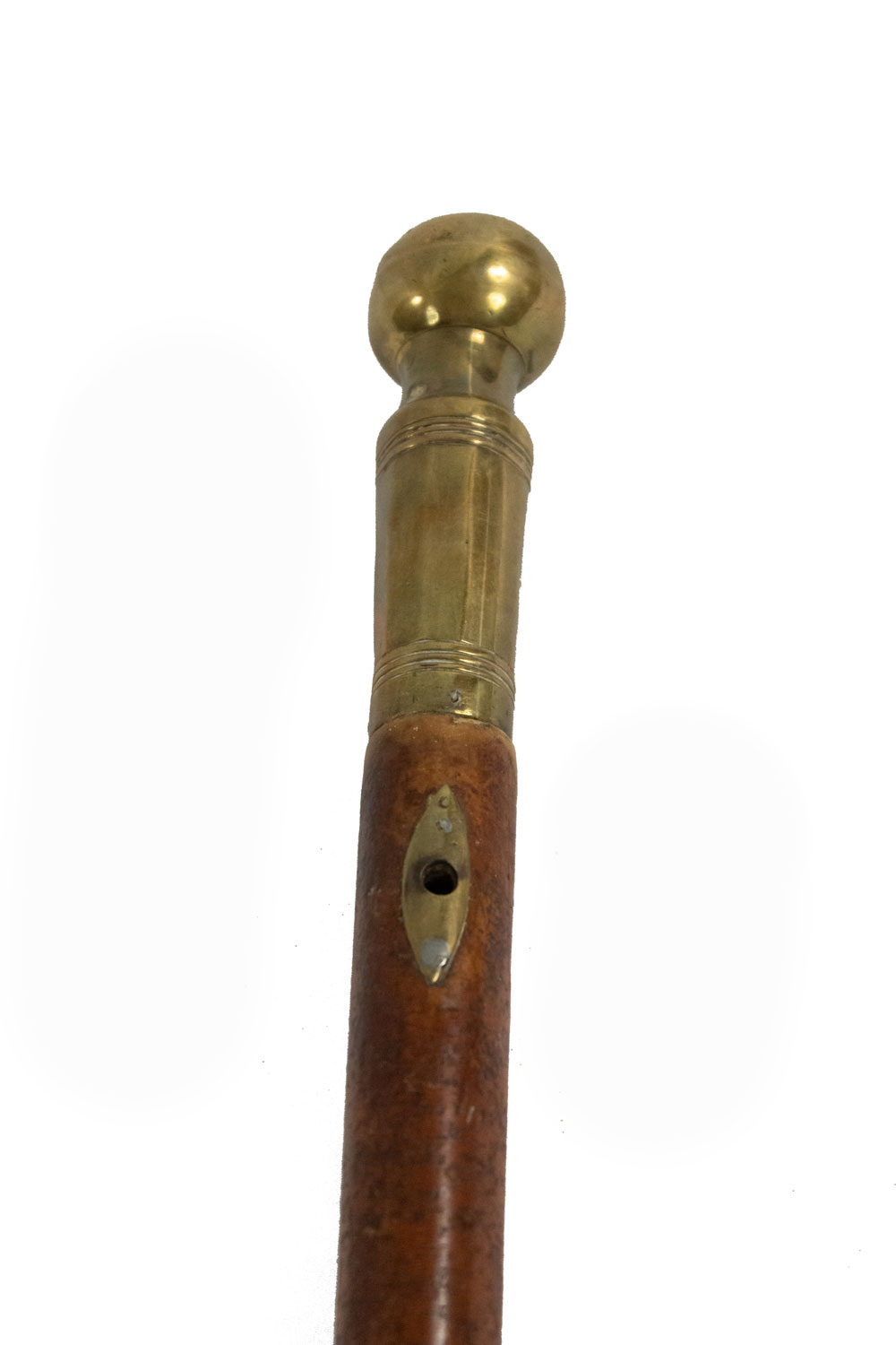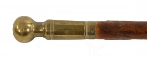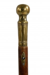English Victorian-style burl wood cane with large brass ball top and fluted sleeve.