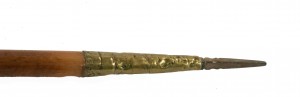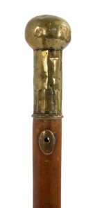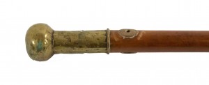 English Victorian-style wood cane with brass ball top handle and sleeve with oval hole.