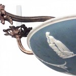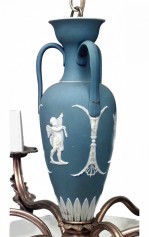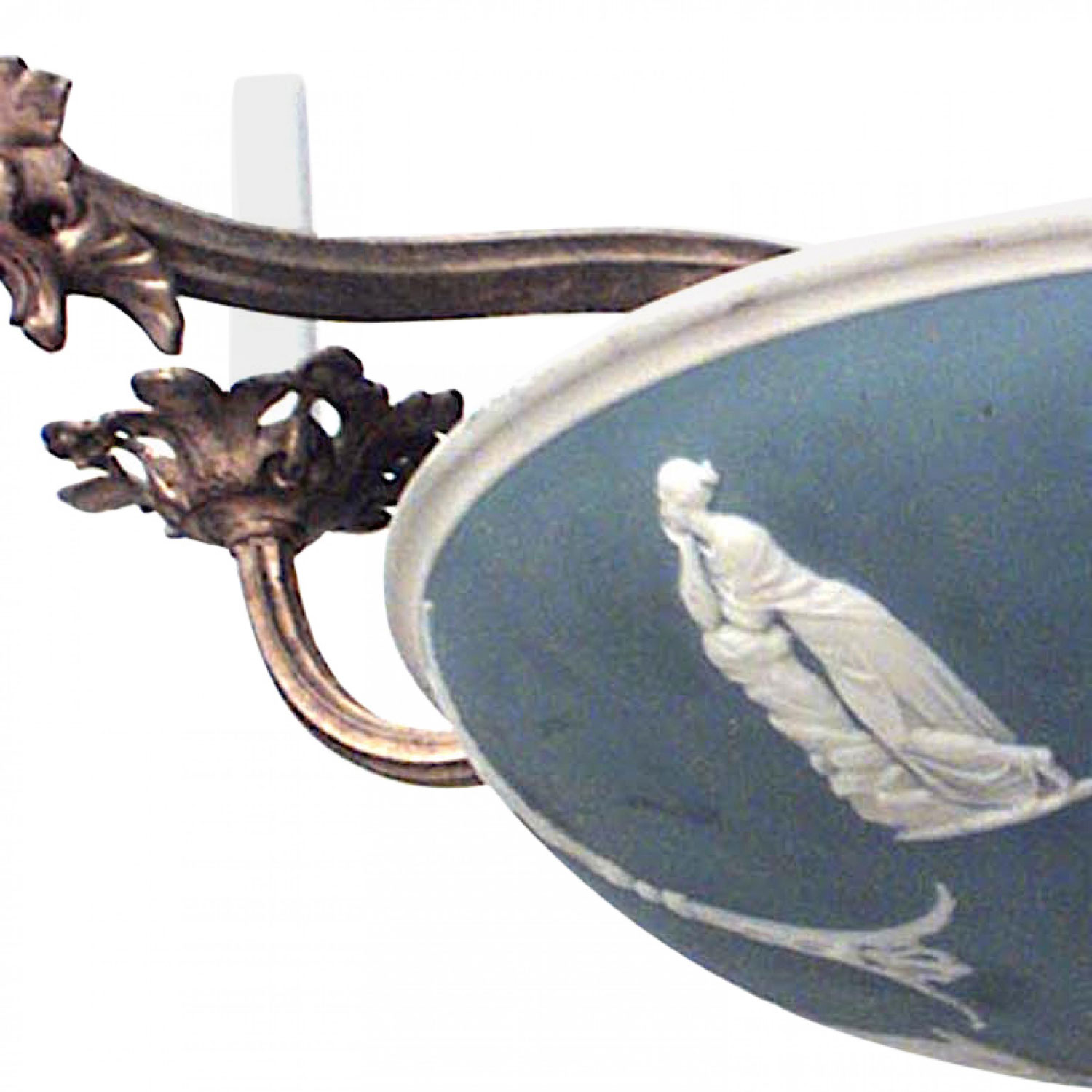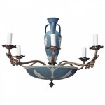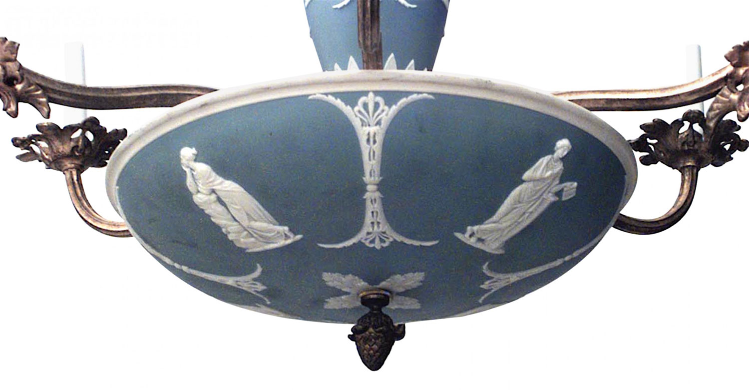 English Victorian bronze dore 6 arm chandelier with blue and white WEDGWOOD bowl and urn top..