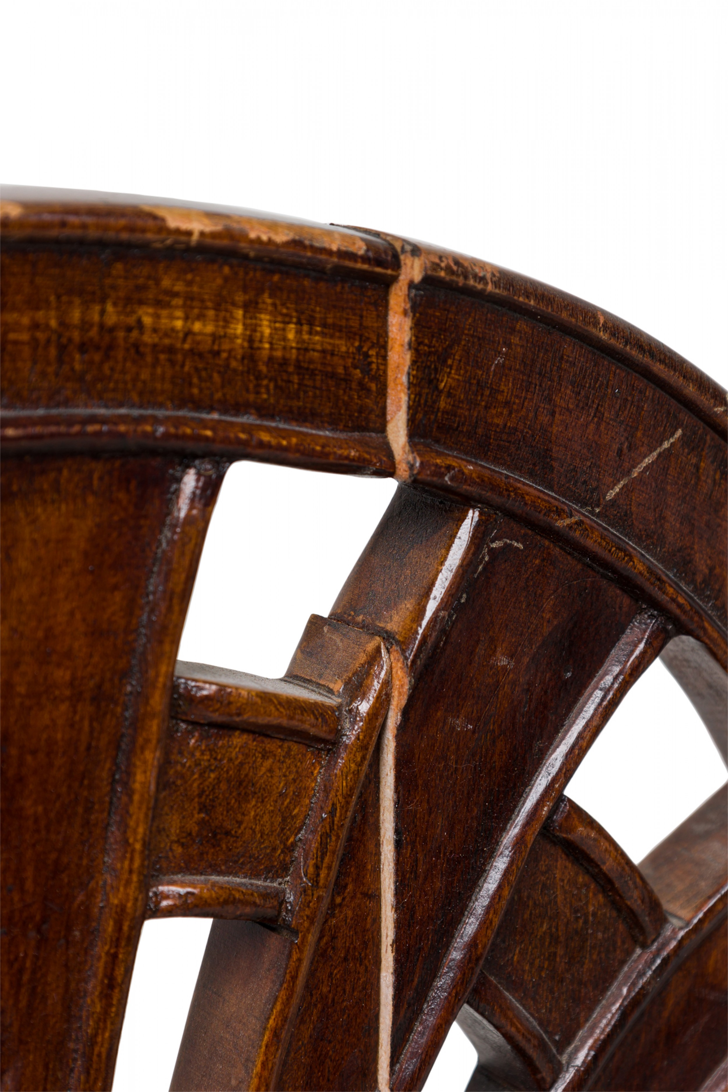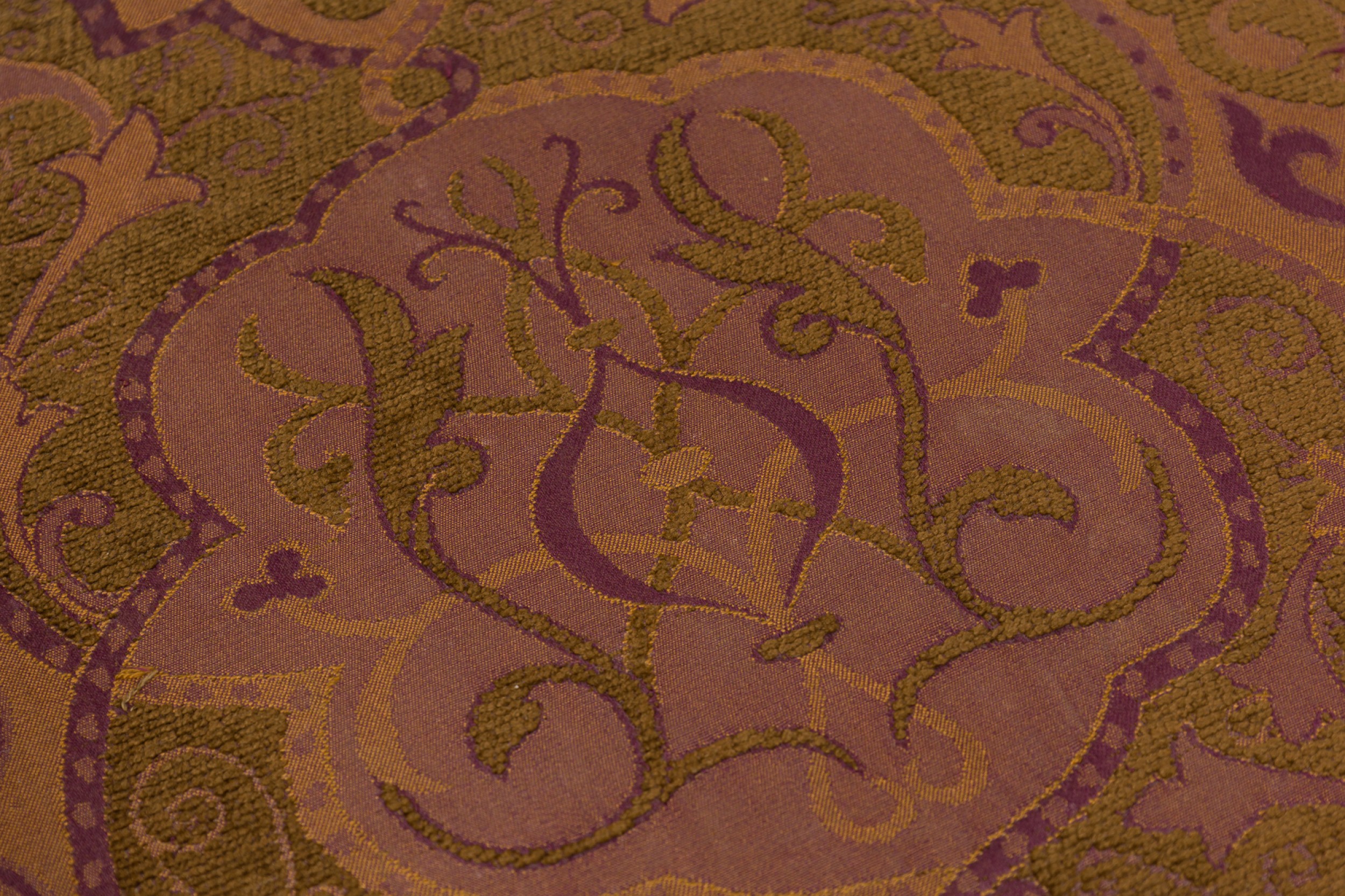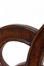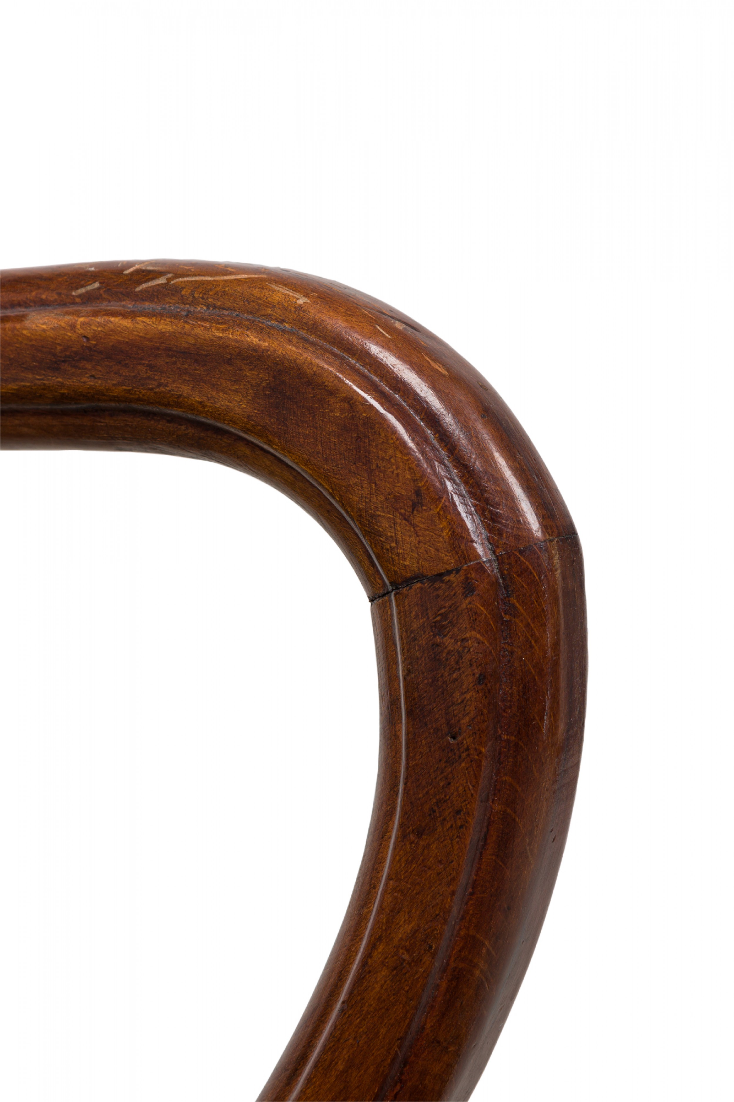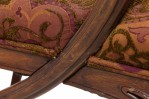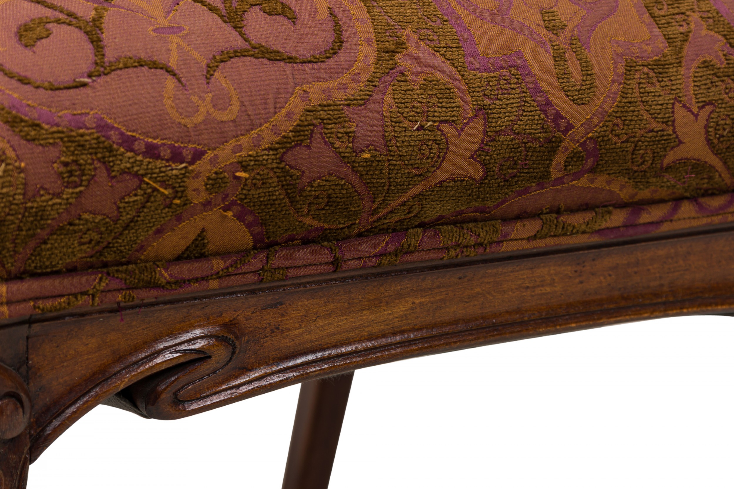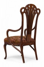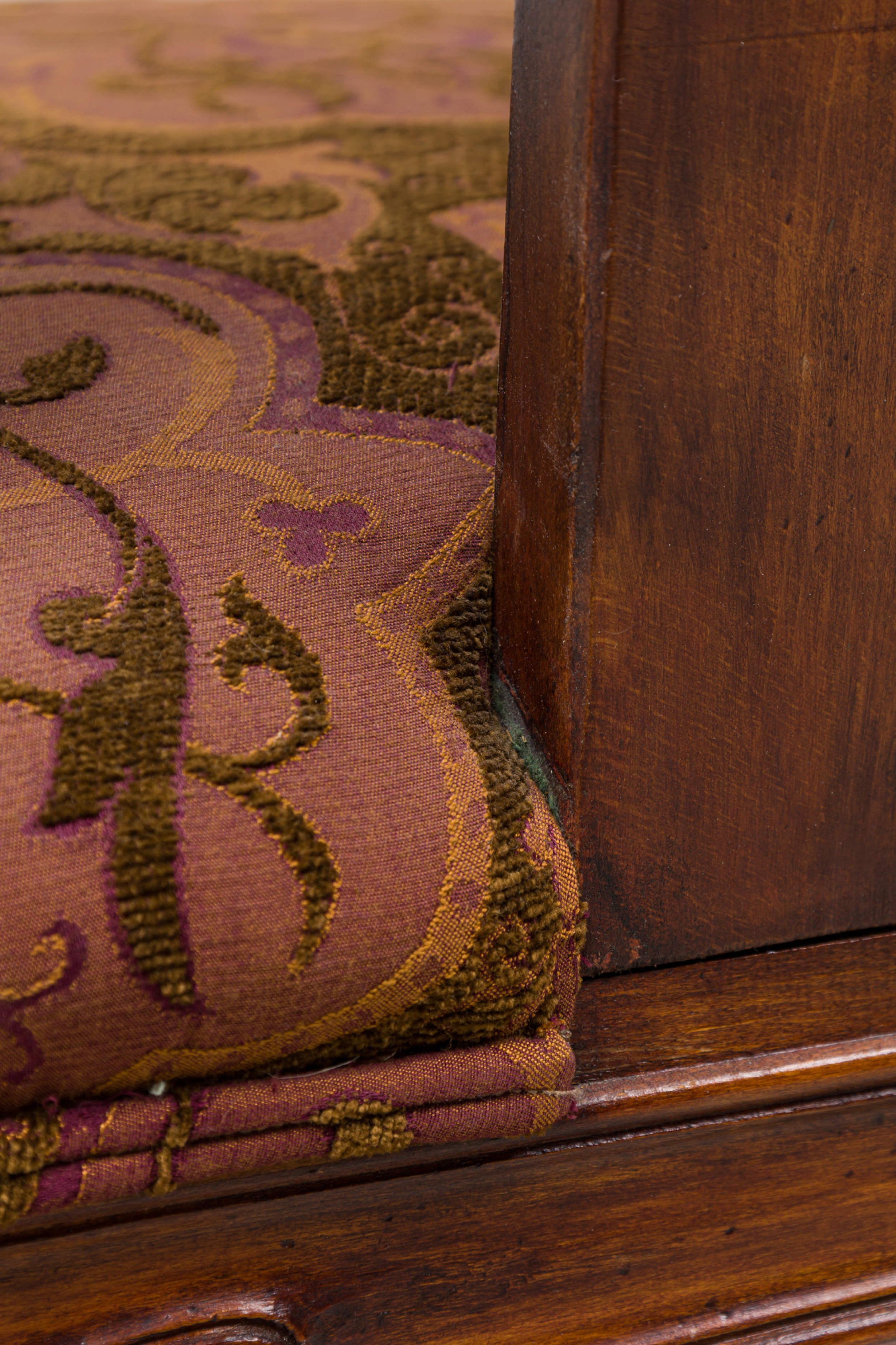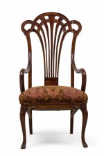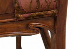 Style: Art Nouveau Materials & Techniques: Fabric, mahogany, upholstered, wood Category: Seating Condition: Wear to finish, separation of wood on left side of the backrest. Good; Wear consistent with age and use