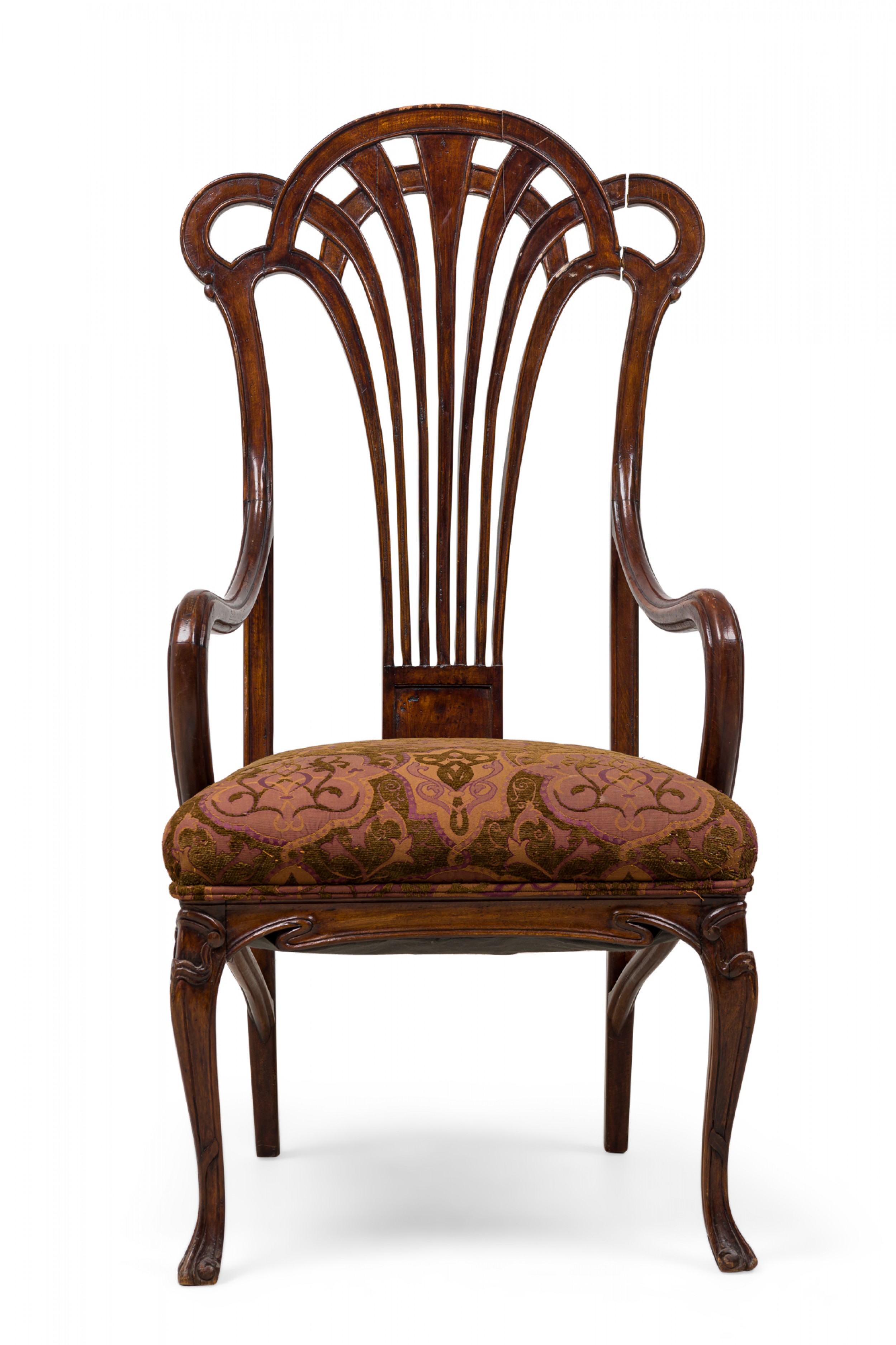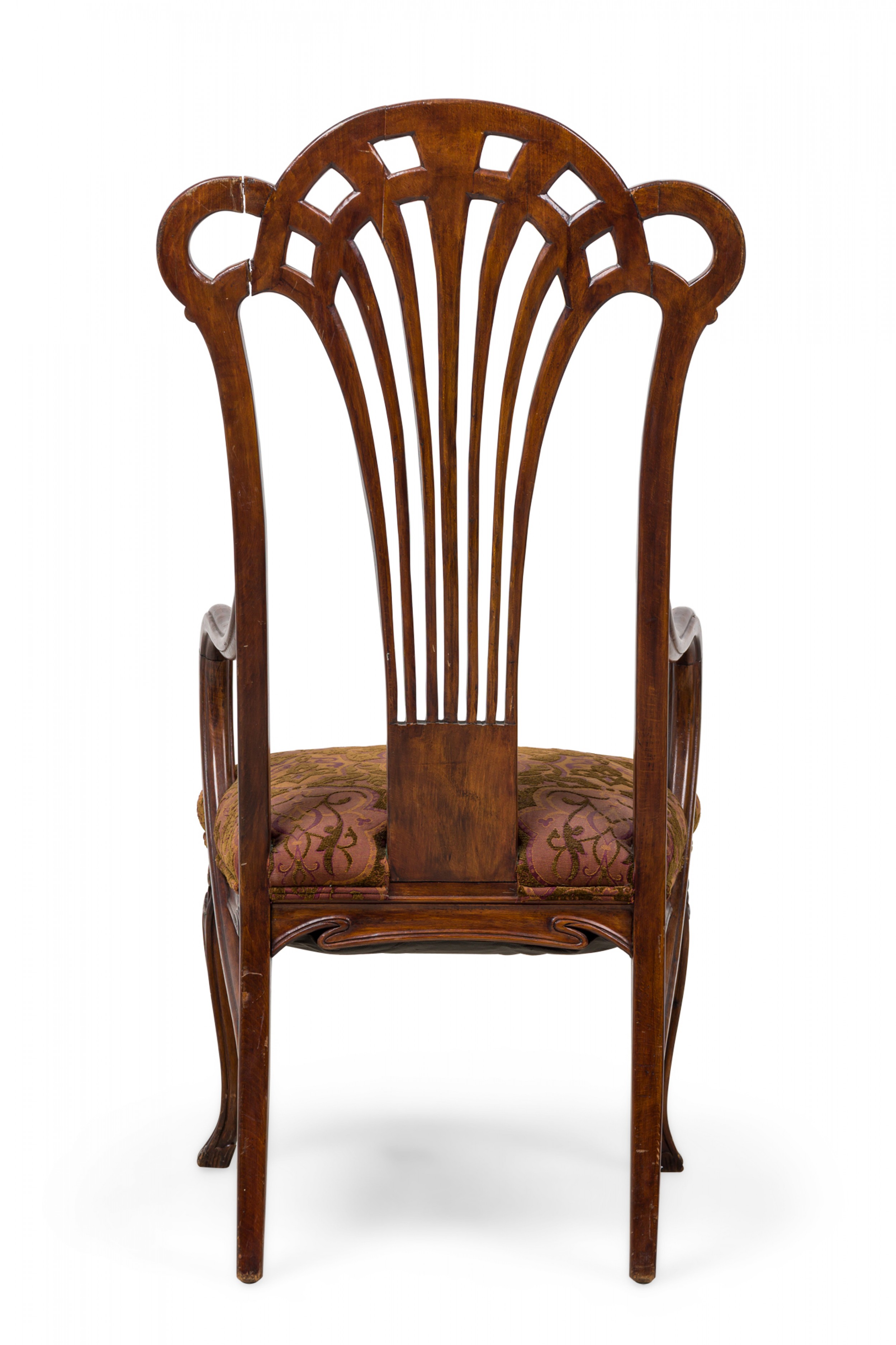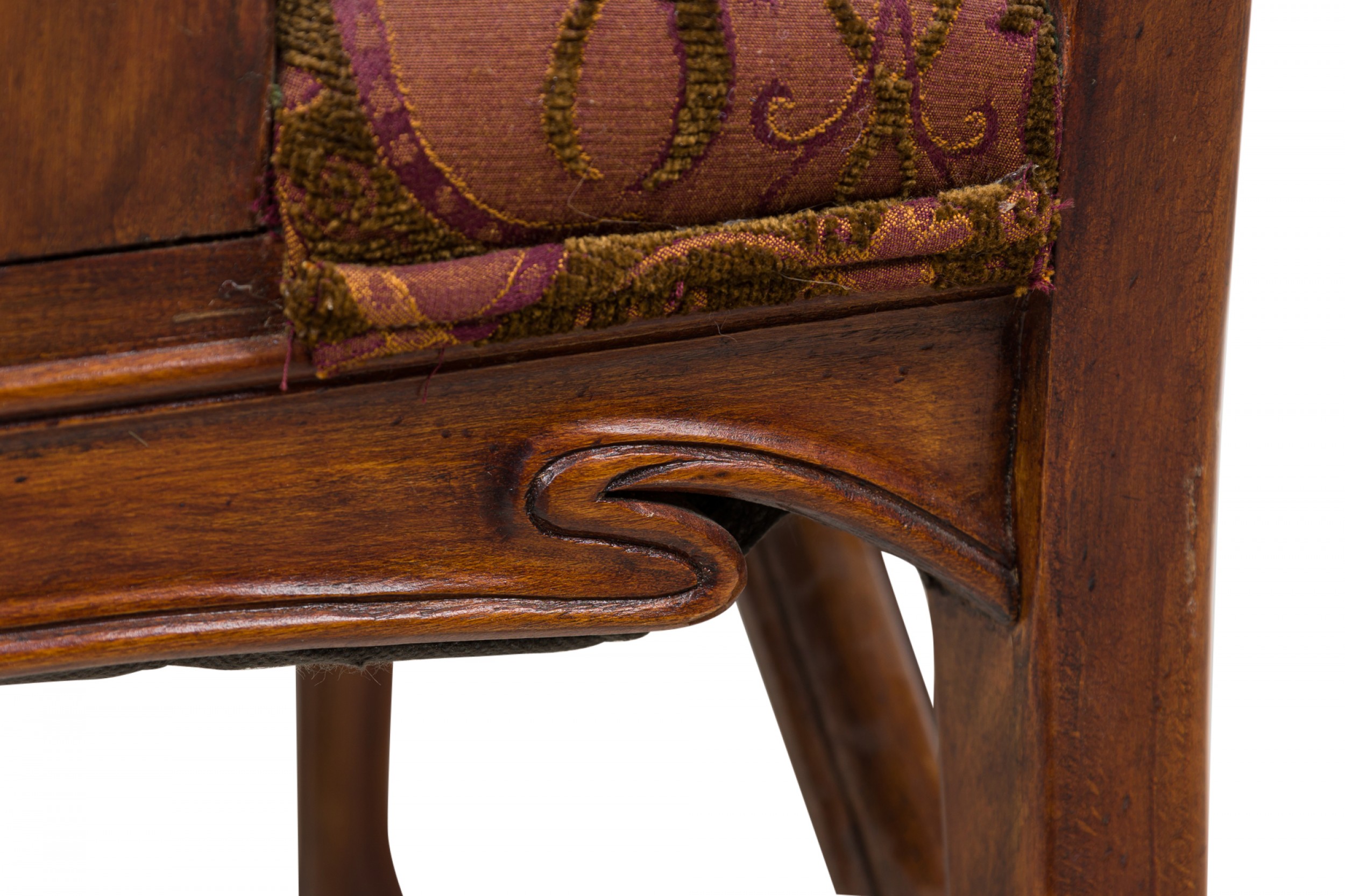 French Art Nouveau mahogany armchair with a pierced fan form high back connected to curved arms having a seat upholstered in a textured mauve scroll & foliate pattern with a carved decorative frieze and front cabriole legs and splayed back legs. (Att: EUGENE GAILLARD)
