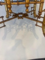 Faux Bamboo Aesthetic Movement (English 19th Century) gilt wood round stool/bench having a stretcher and lattice design between the legs with a needlepoint seat..