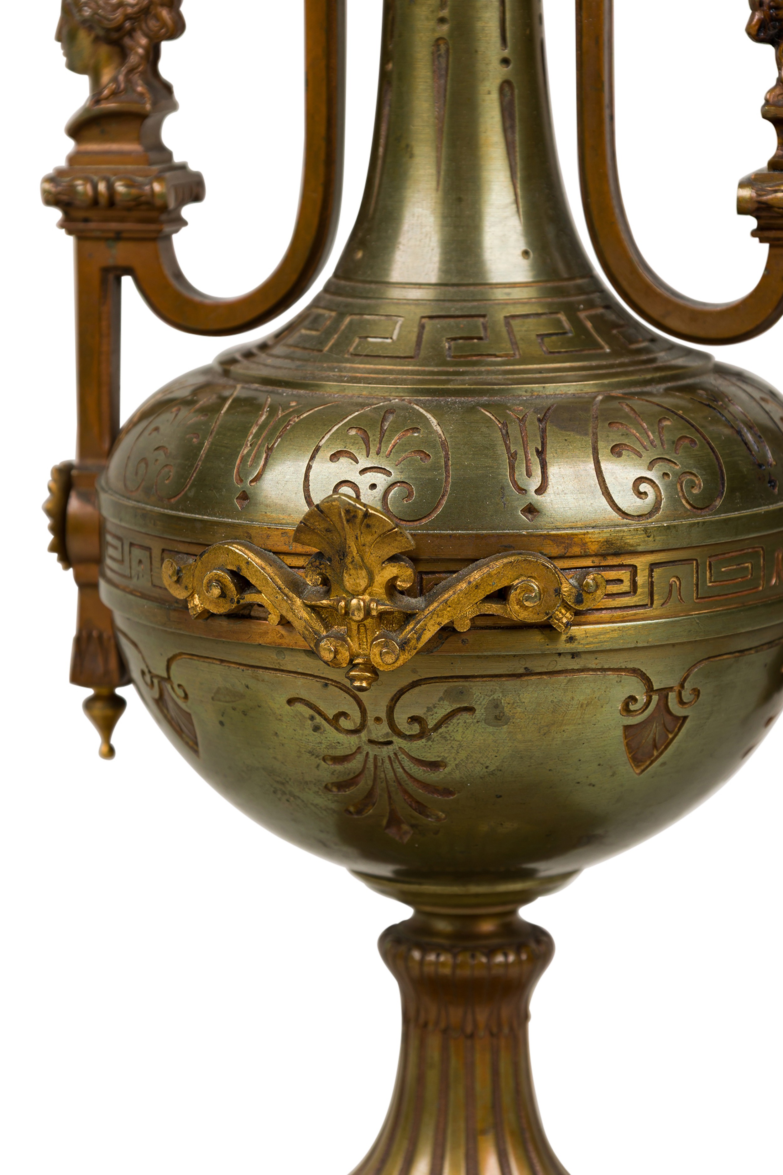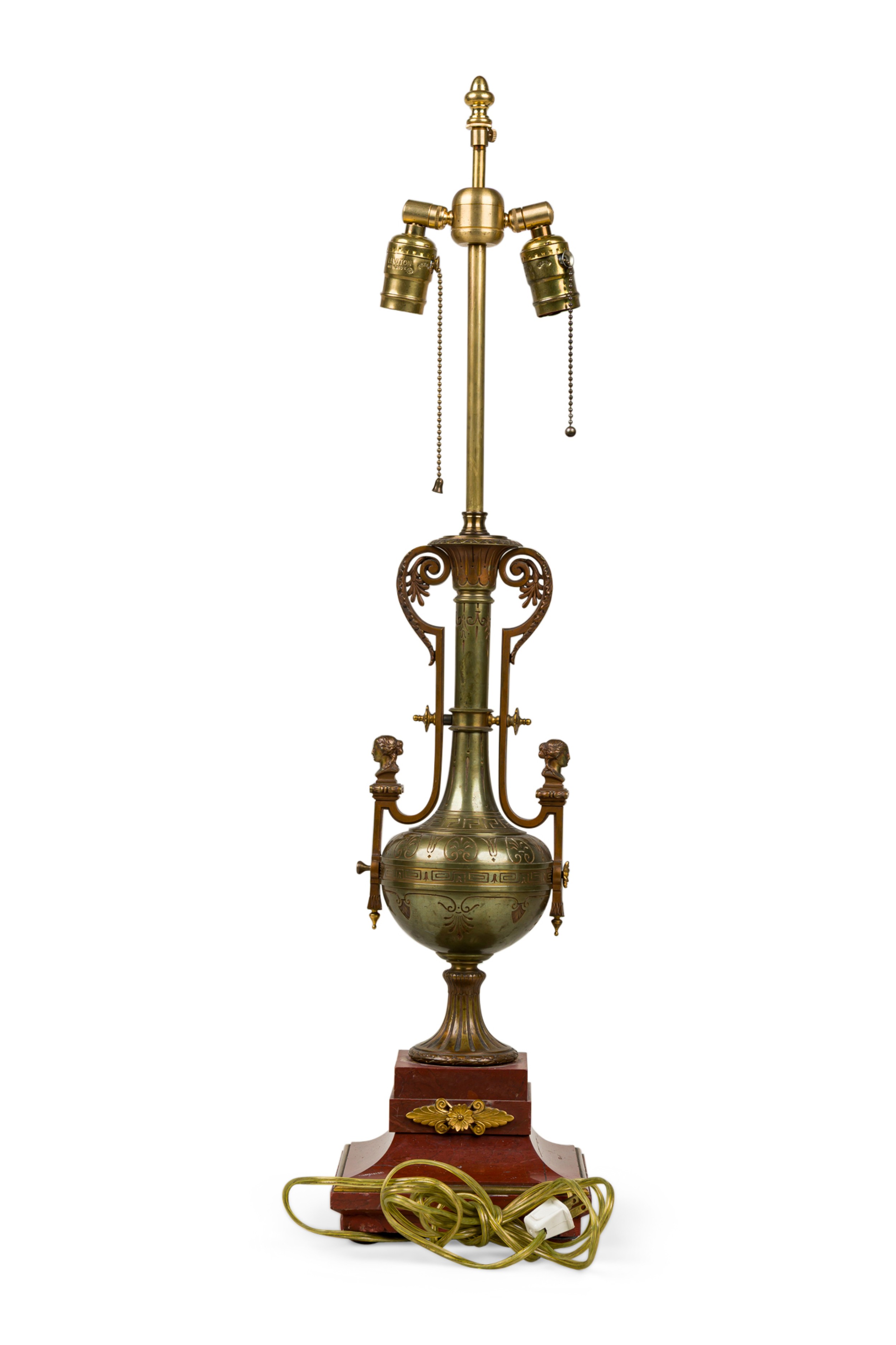 French Empire style table lamp with gilt trim and a silvered bronze finish urn form with 2 female heads resting on a rosso marble base over round feet (FERDINAND BARBEDIENNE)(Similar lamp; REG9081)