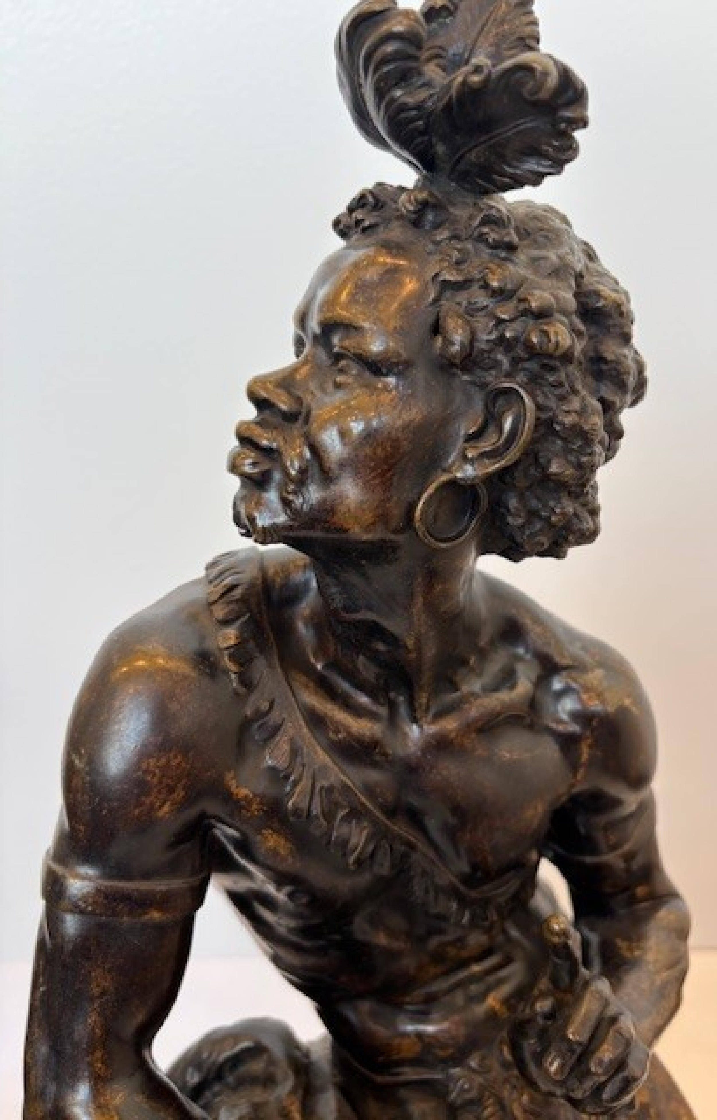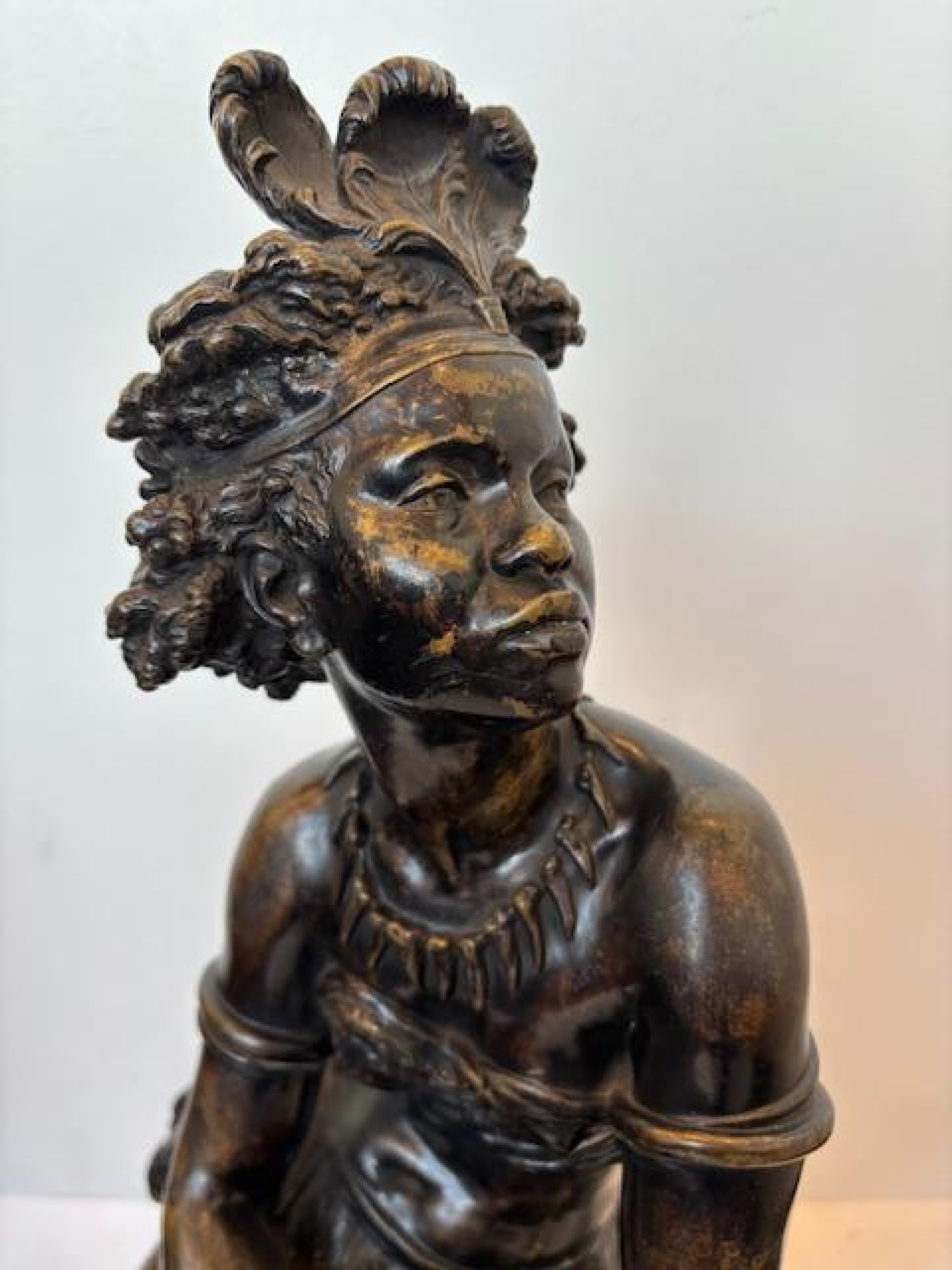 Pair of Moreau French Victorian bronze seated nubian figures with feathers in hair