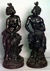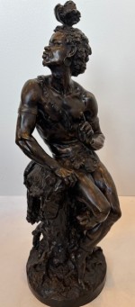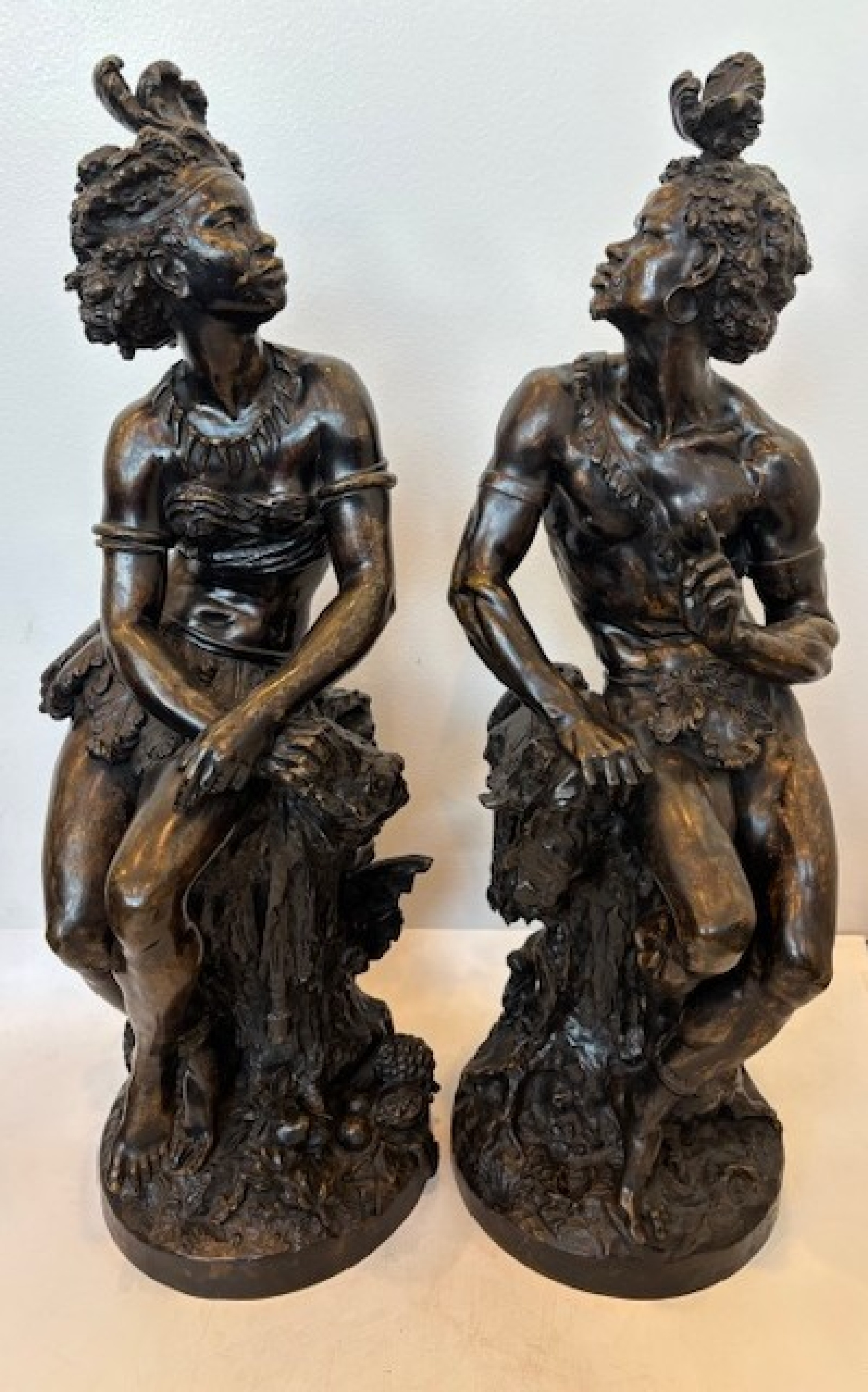 PAIR of French Victorian bronze nubian male and female figures with feathers in hair seated on a tree stump around a floral area (signed: MOREAU MATH. Sc. III; foundry mark: F. Barbediene et Romain; titled: "Young Aftrican Listening)) (PRICED AS PAIR).