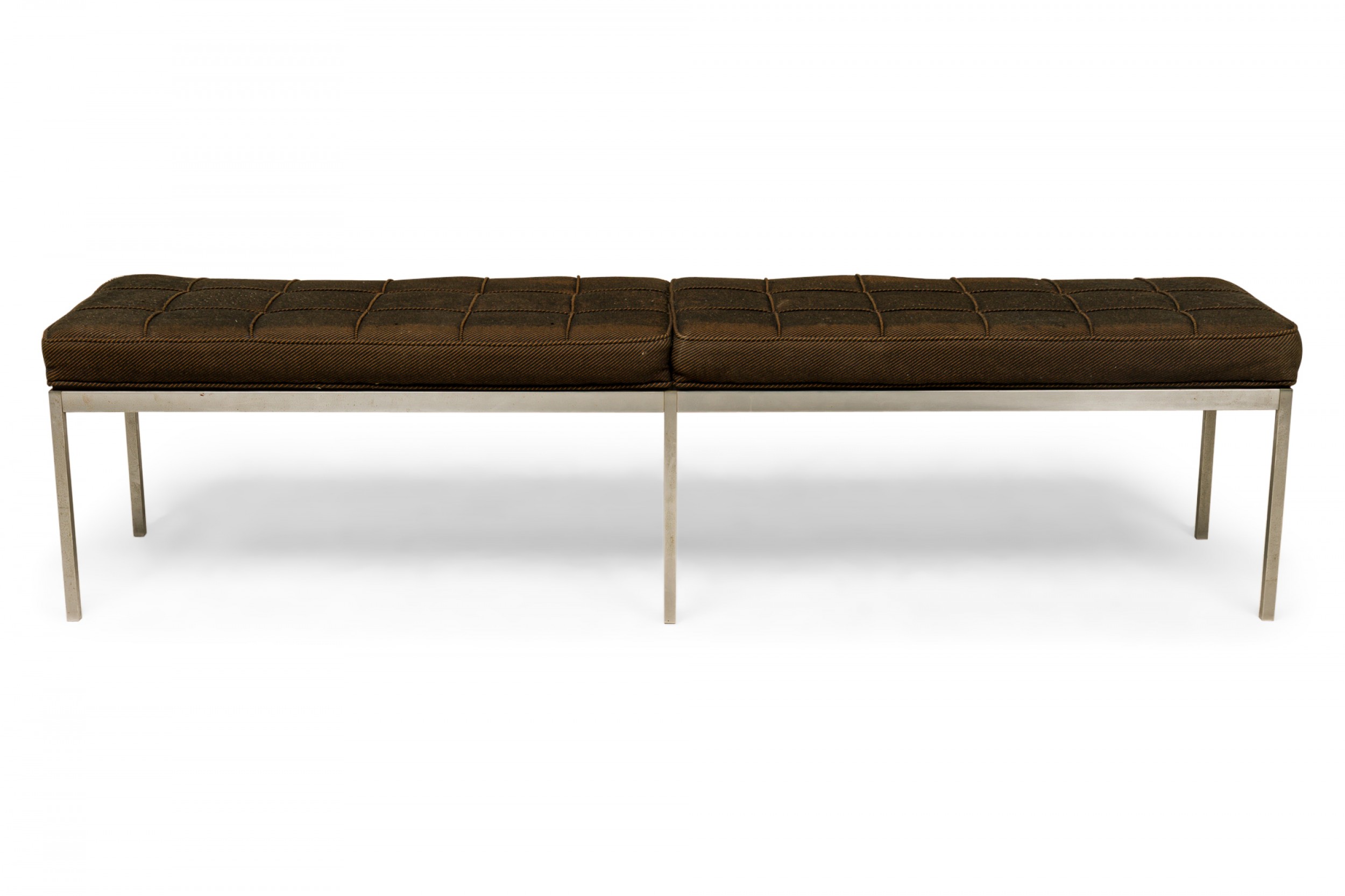 American Mid-Century rectangular museum bench with a brown fabric upholstered square channeled seat resting on a square chrome tube frame. (FLORENCE KNOLL FOR KNOLL INTERNATIONAL).
