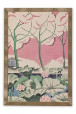 Post-Impressionism style abstract print of water lilies along a wooded riverbank with a small hut on the horizon against a pink clouded sky and framed with a fluted gold moulding (Smaller version: NWL8332).