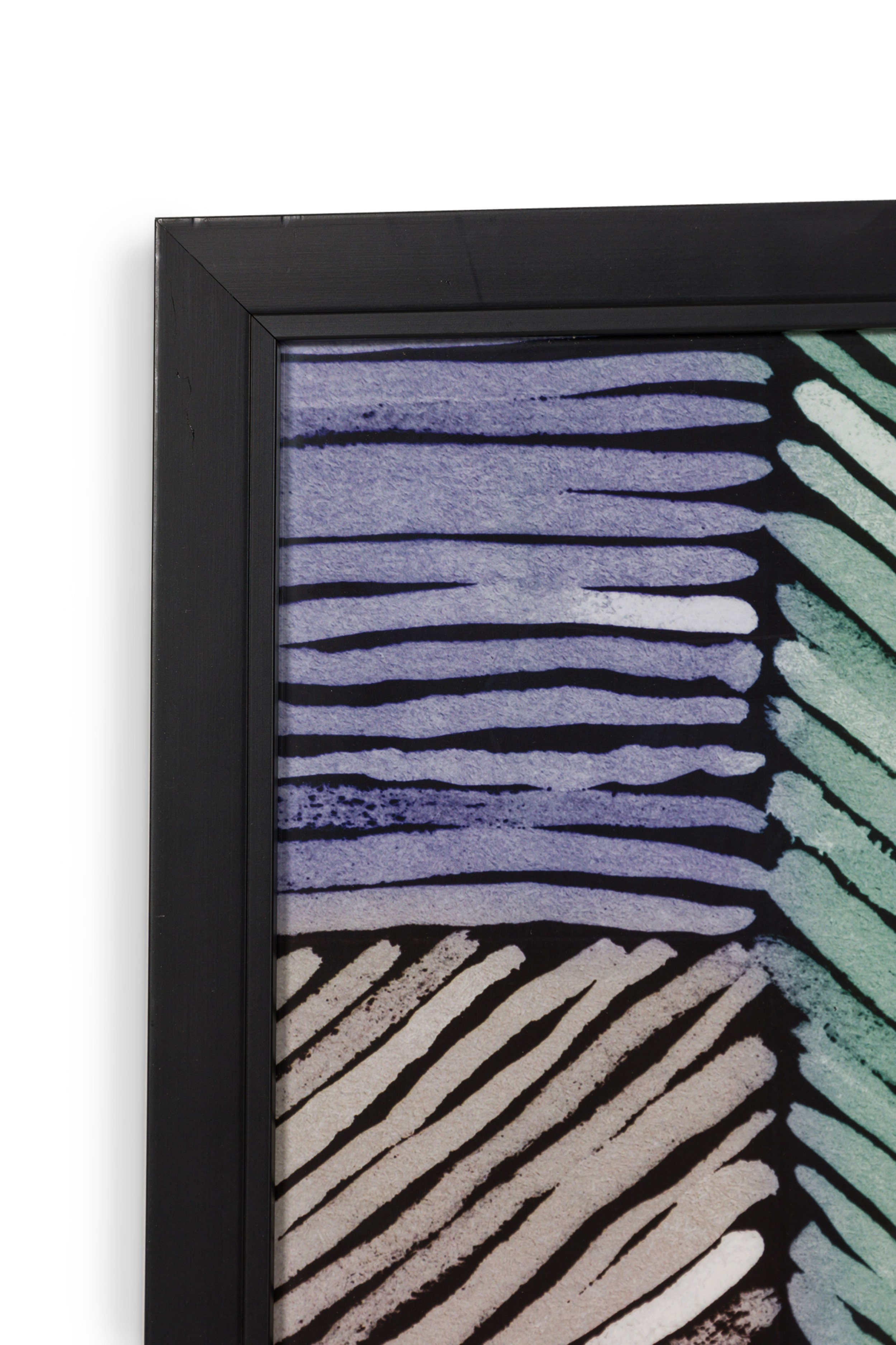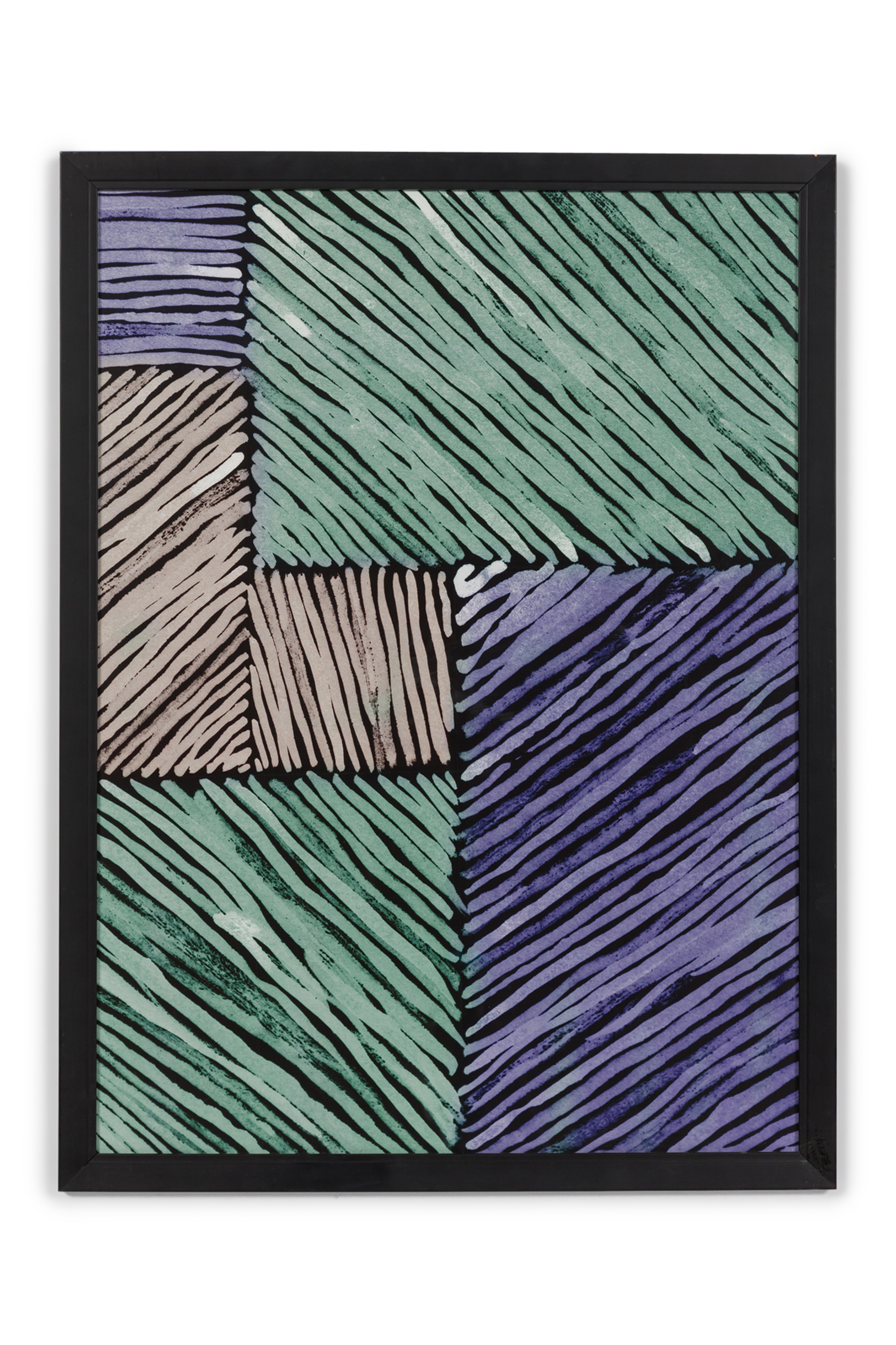 Framed print of an abstract painting composed of overlapping blocks of diagonal lines in green, lavender, and deep blue, rendered in a geometric pattern with expressionist brushwork in a black frame..