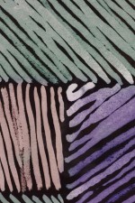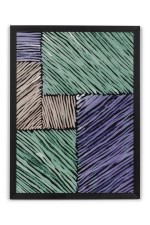 Framed print of an abstract painting composed of overlapping blocks of diagonal lines in green, lavender, and deep blue, rendered in a geometric pattern with expressionist brushwork in a black frame.