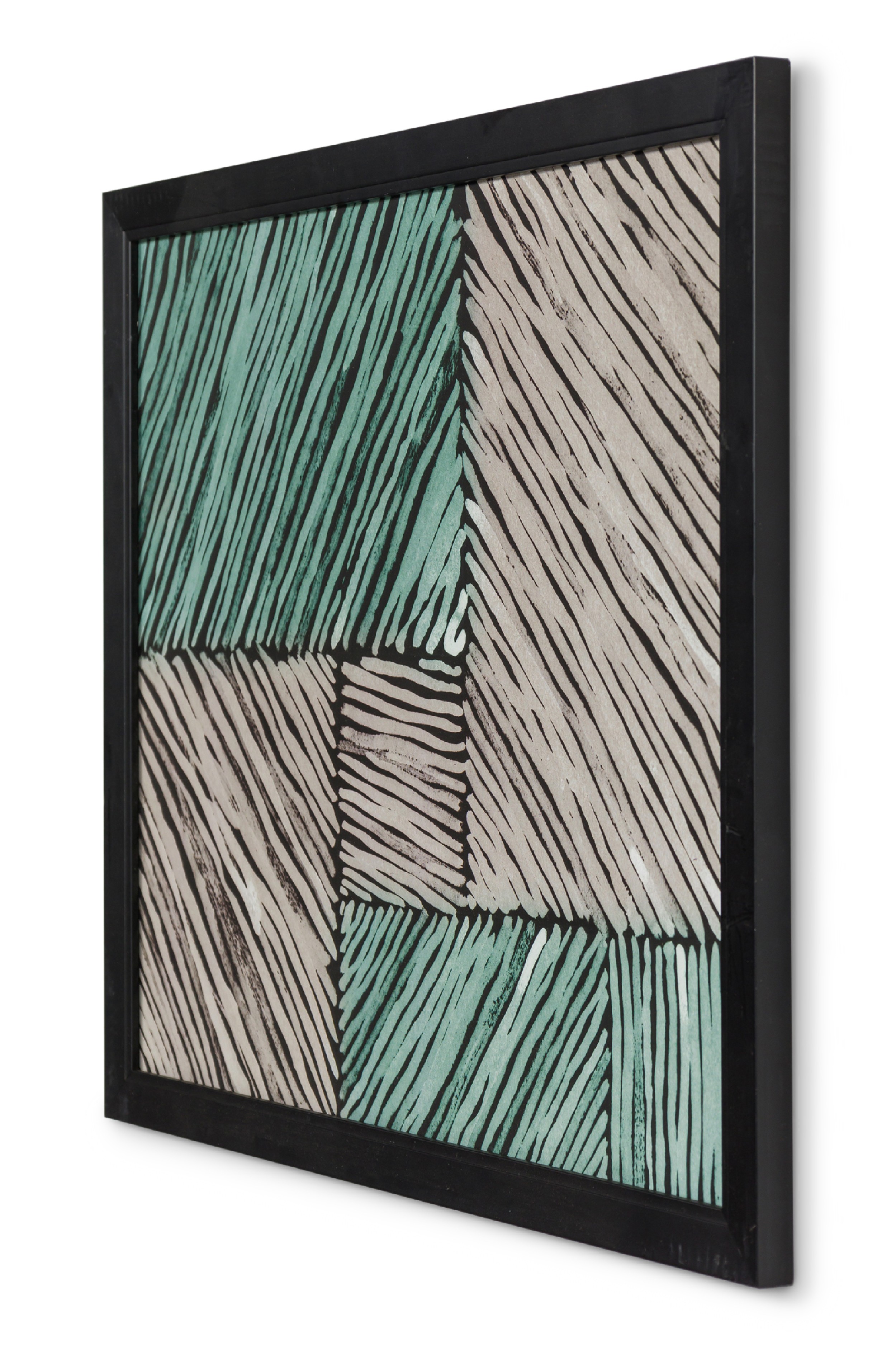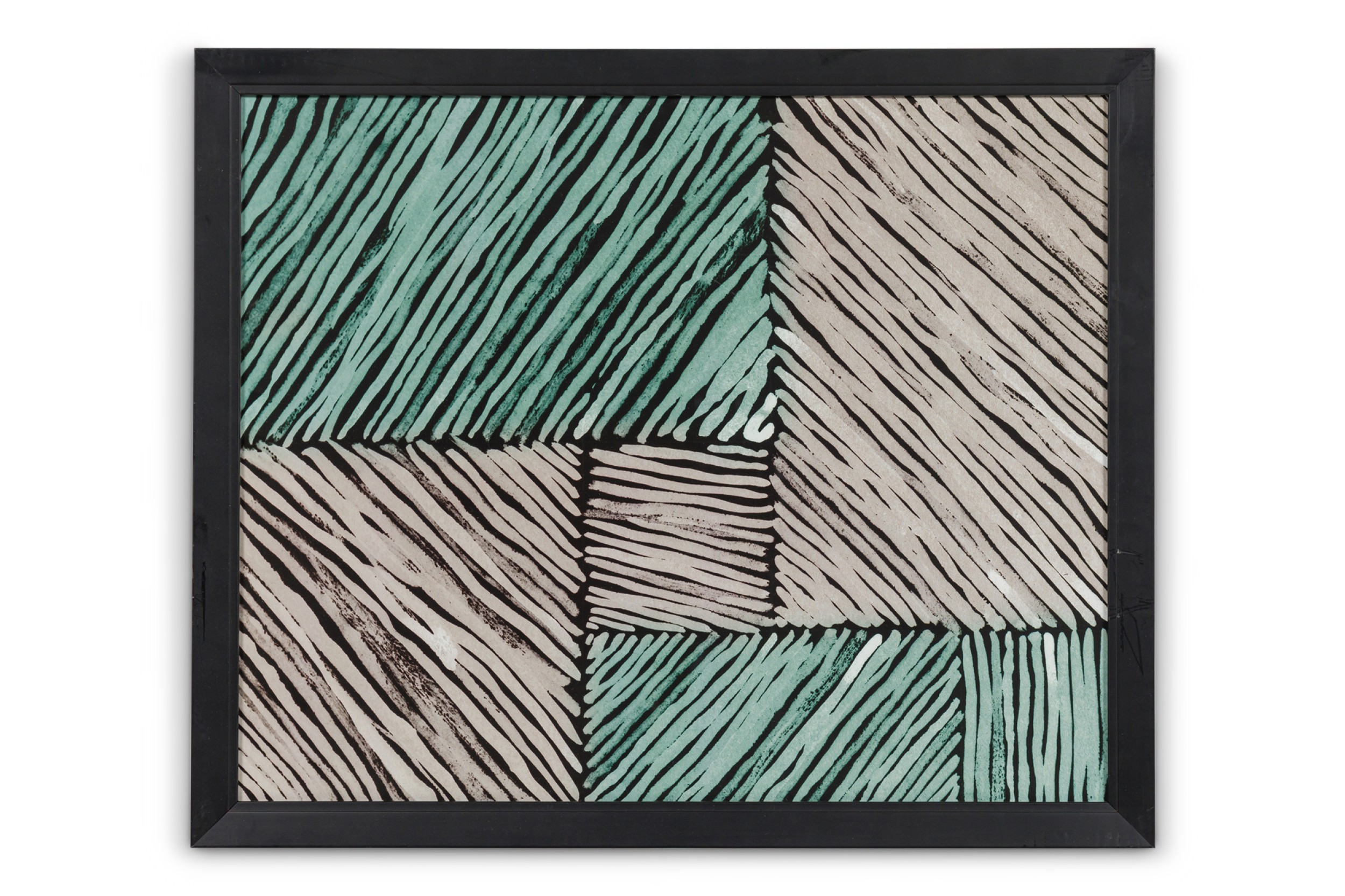 Framed print of an abstract painting composed of overlapping blocks of diagonal lines in green, lavender, and deep blue, rendered in a geometric pattern with expressionist brushwork in a black frame..