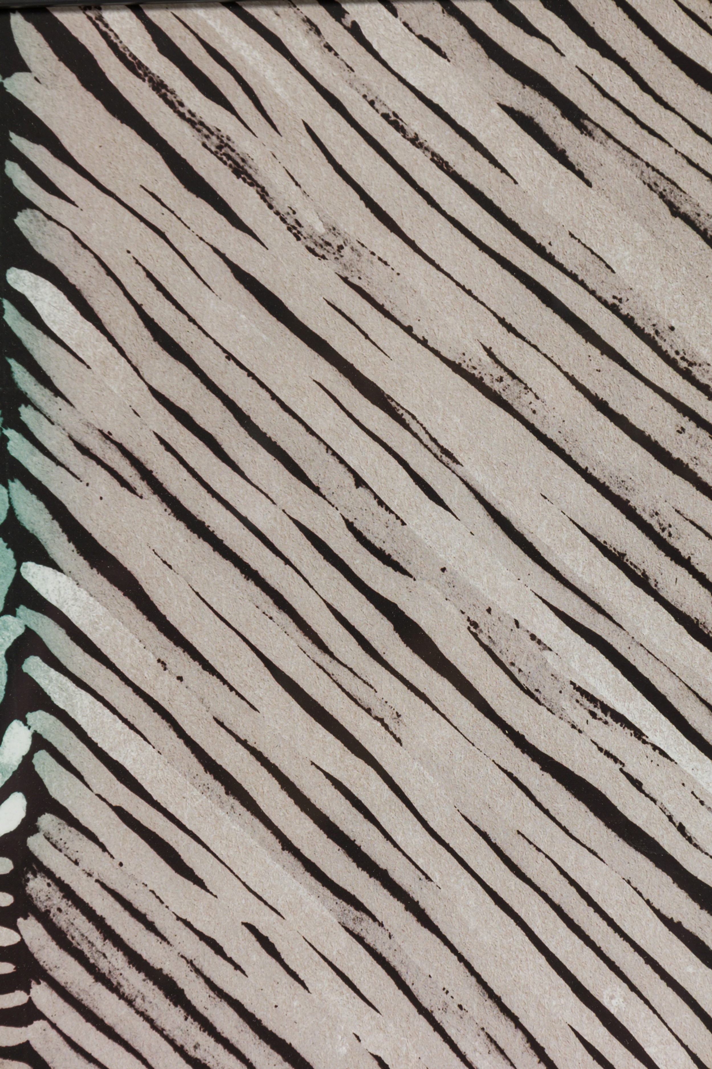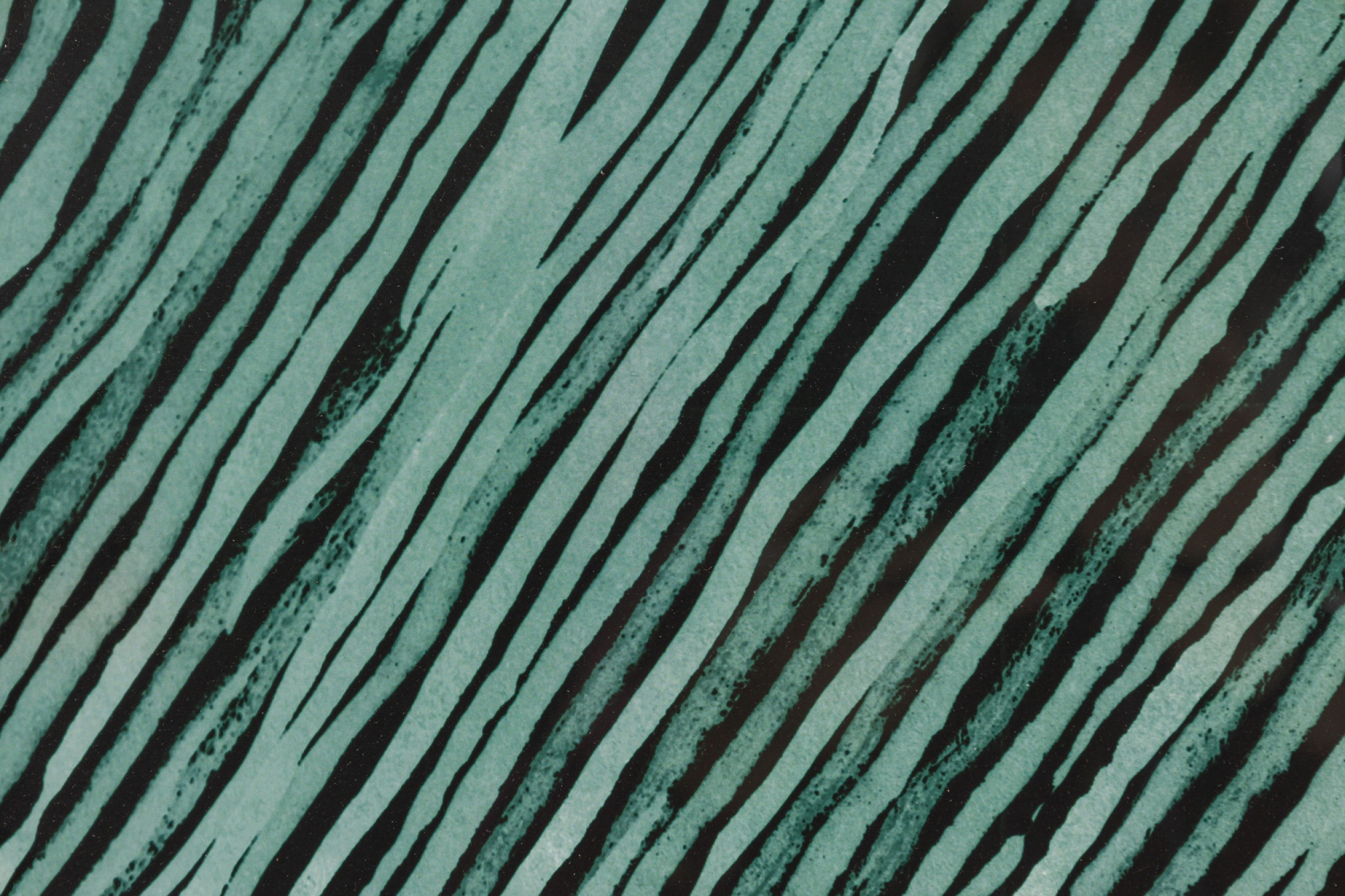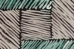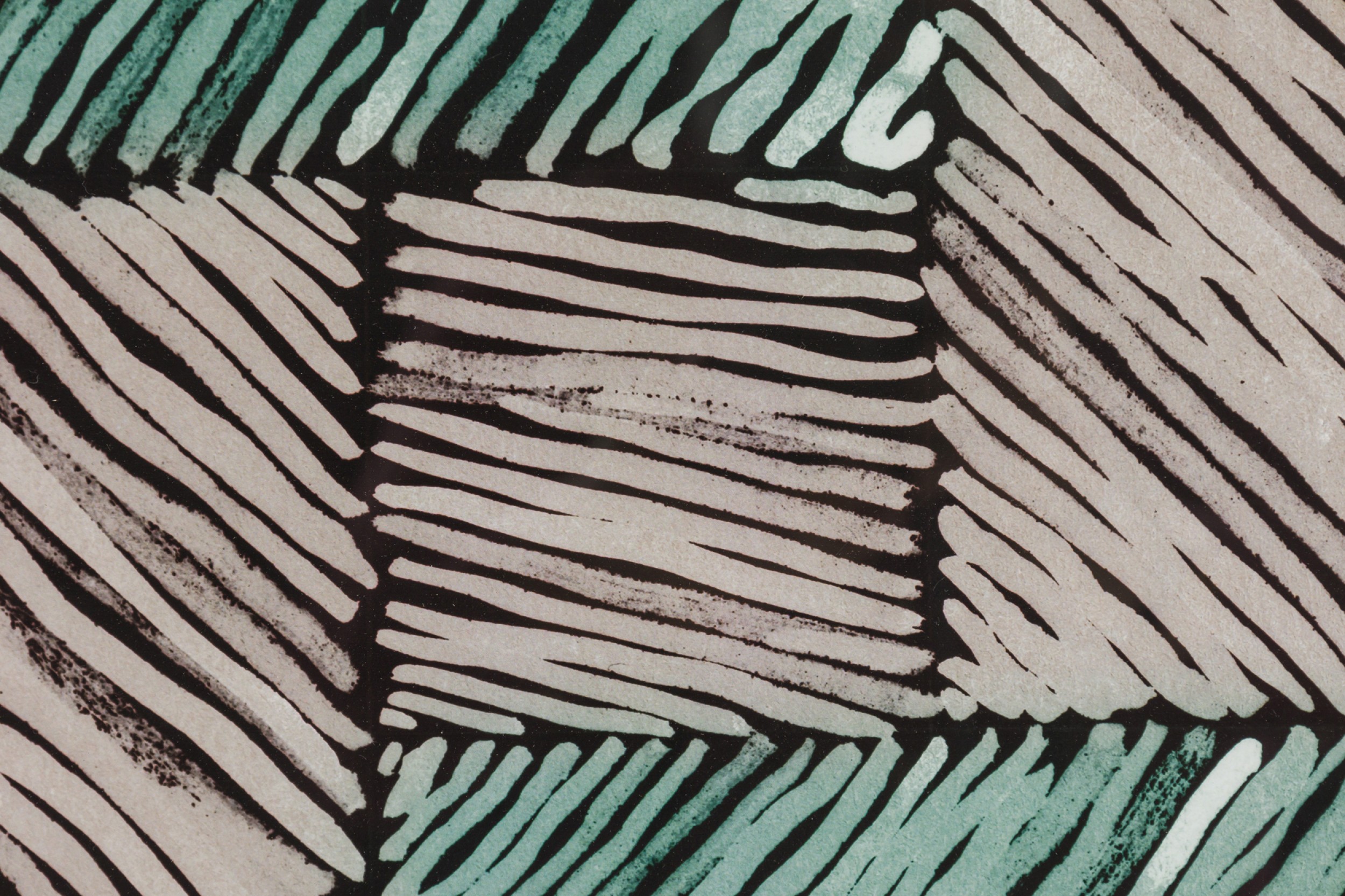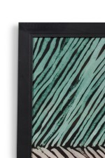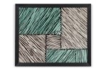 Framed print of an abstract painting composed of overlapping blocks of diagonal lines in green, lavender, and deep blue, rendered in a geometric pattern with expressionist brushwork in a black frame.