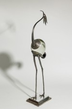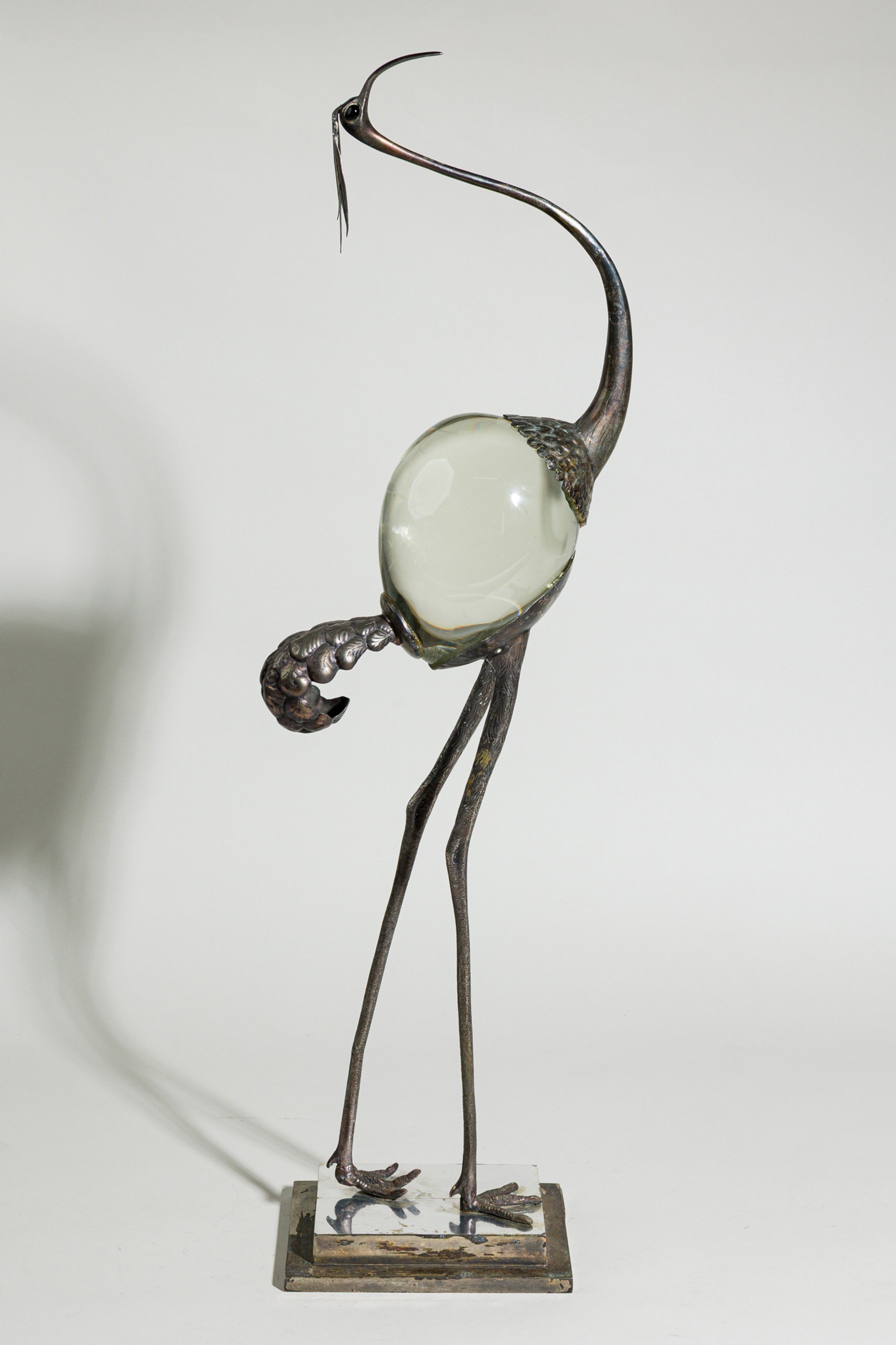 Italian Mid-Century SIlver Plate and Crystal Figure of a Crane standing on a rectangular base (FRANCO LAFINI)