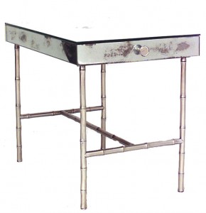 Style: Mid-Century Materials & Techniques: Brass, bamboo, mirrored Category: Tables Condition: Cracks in mirror