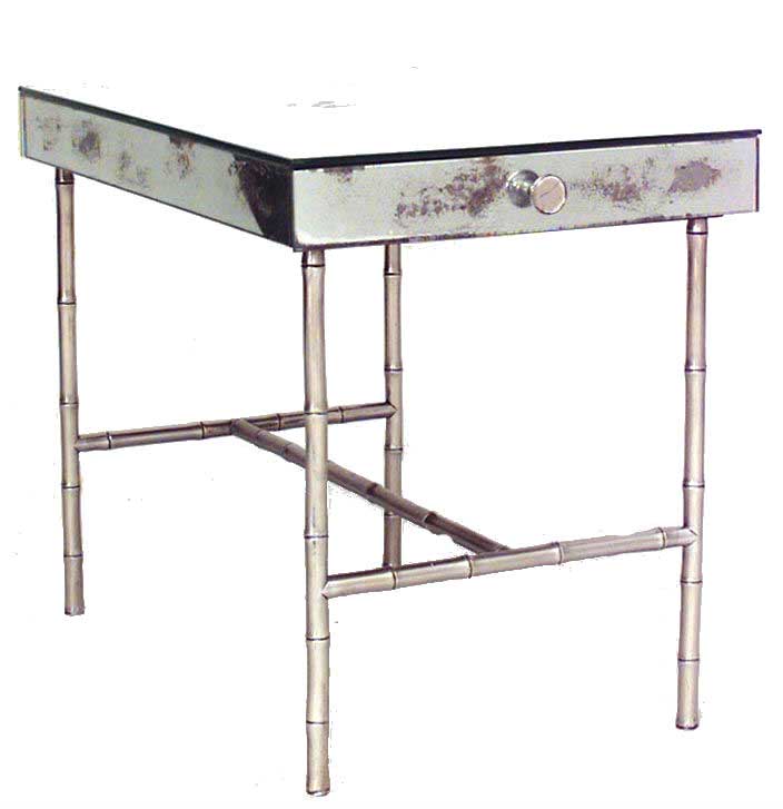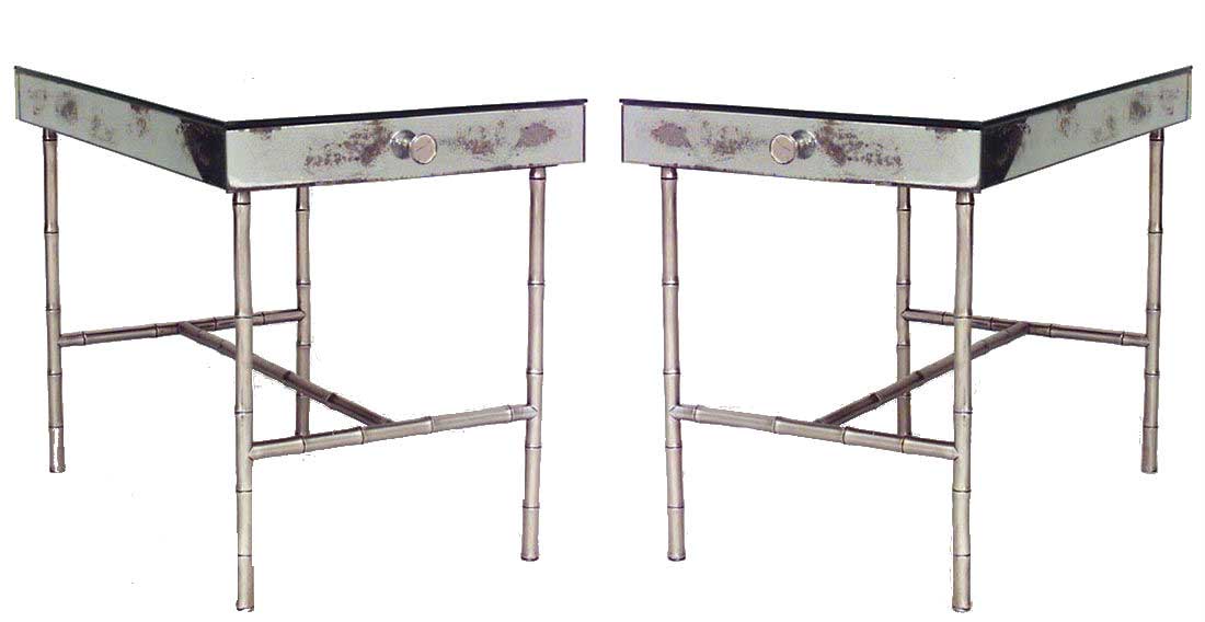 PAIR of French Mid-Century (1940s) mirrored low end tables with drawer and brass faux bamboo legs and stretcher. (PRICED AS PAIR).