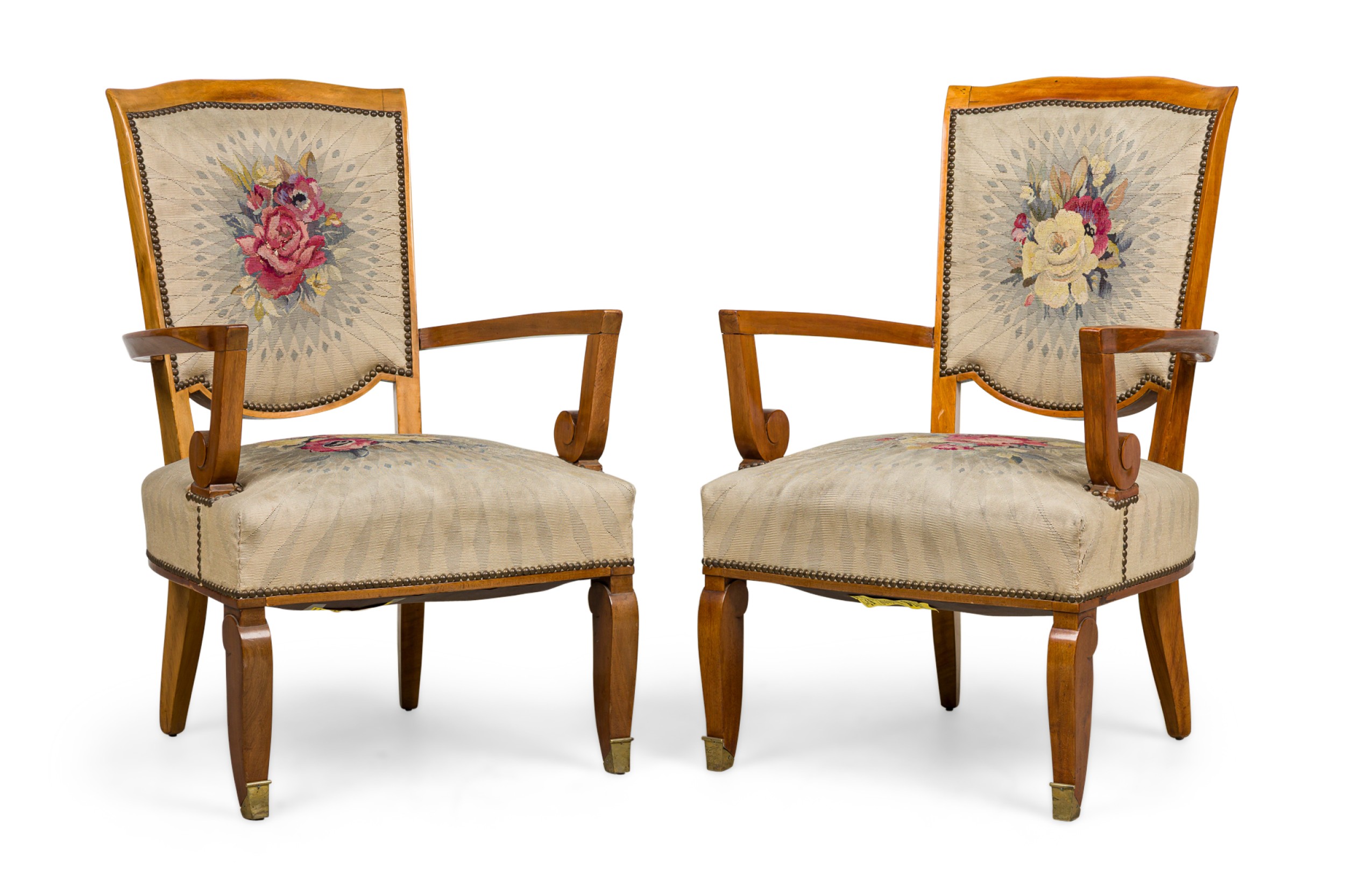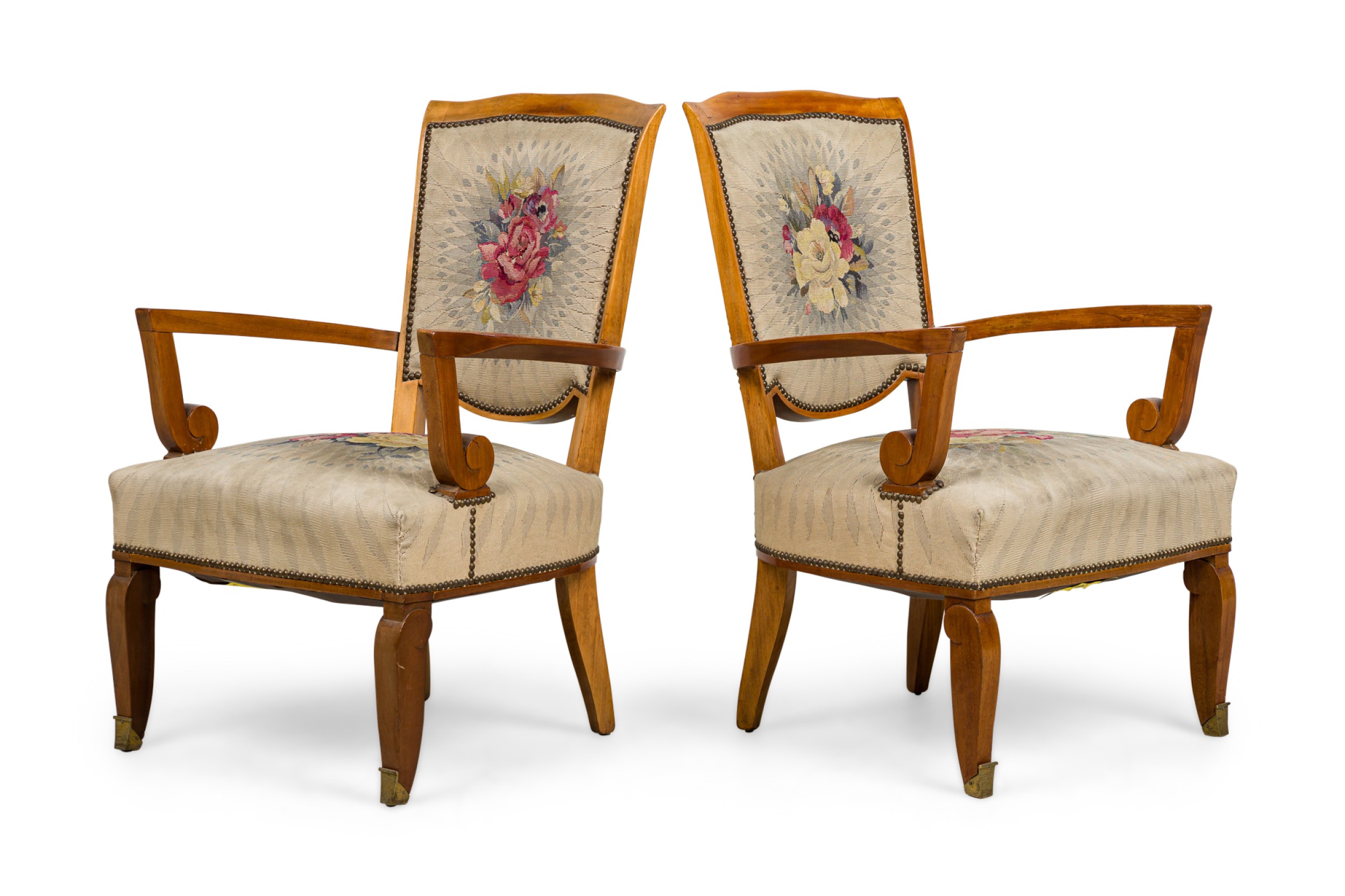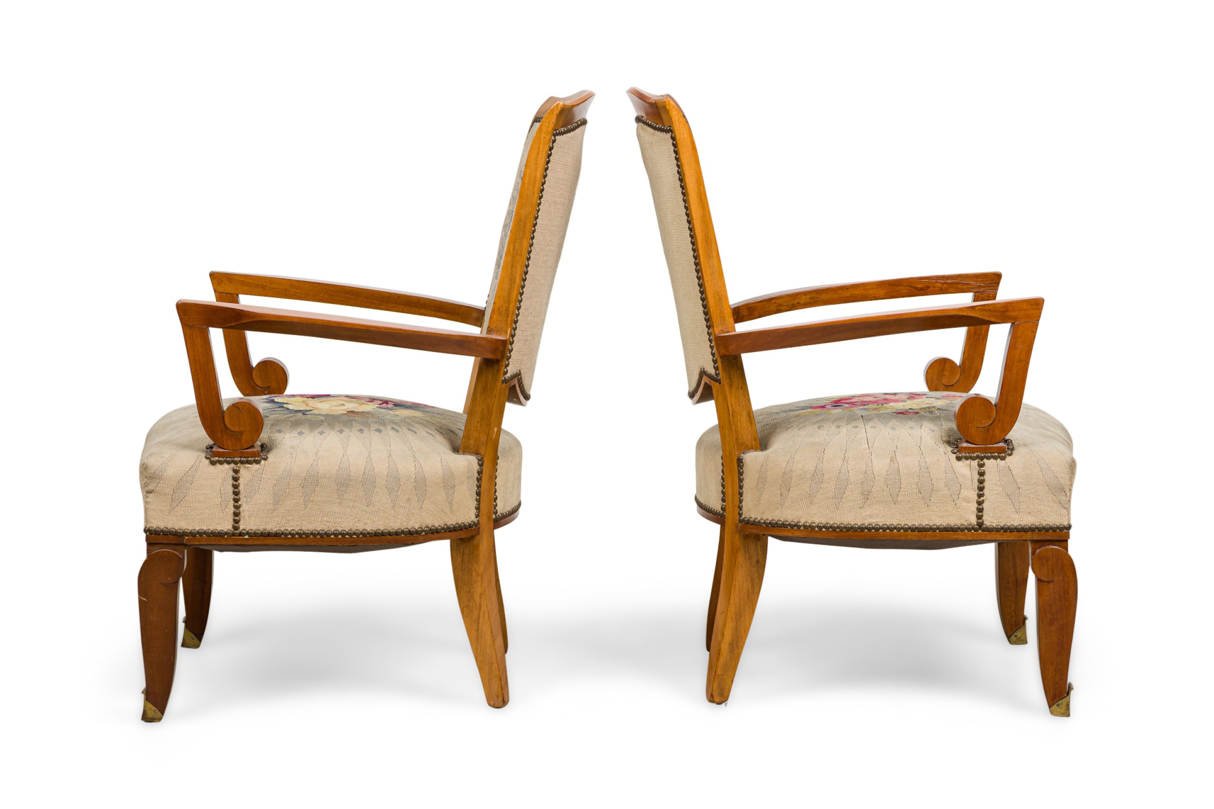 PAIR of French Art Deco mahogany open Armchairs with bronze feet and floral Aubusson upholstered seat and back. (att: JULES LELEU, Ile de France)