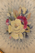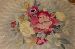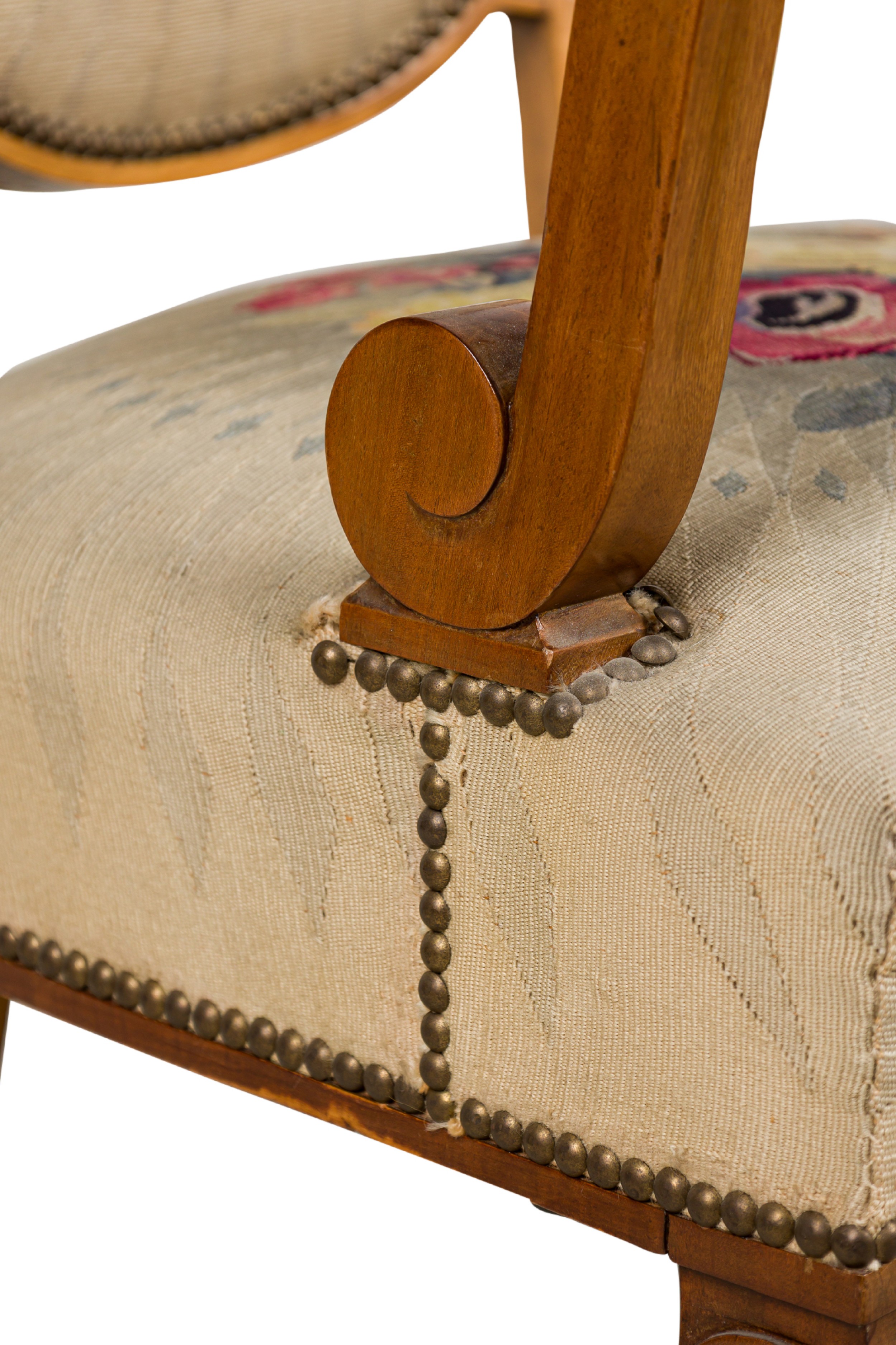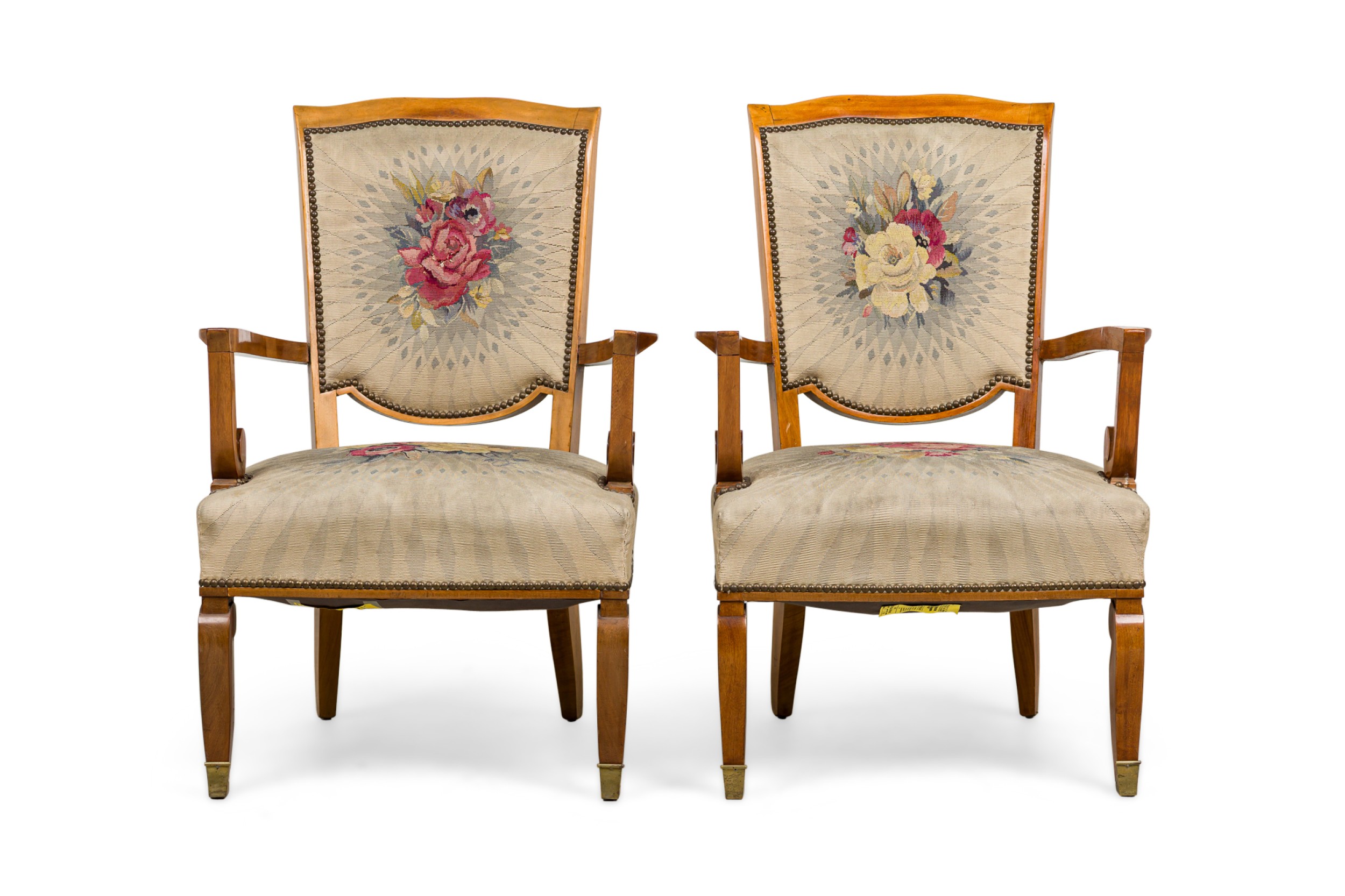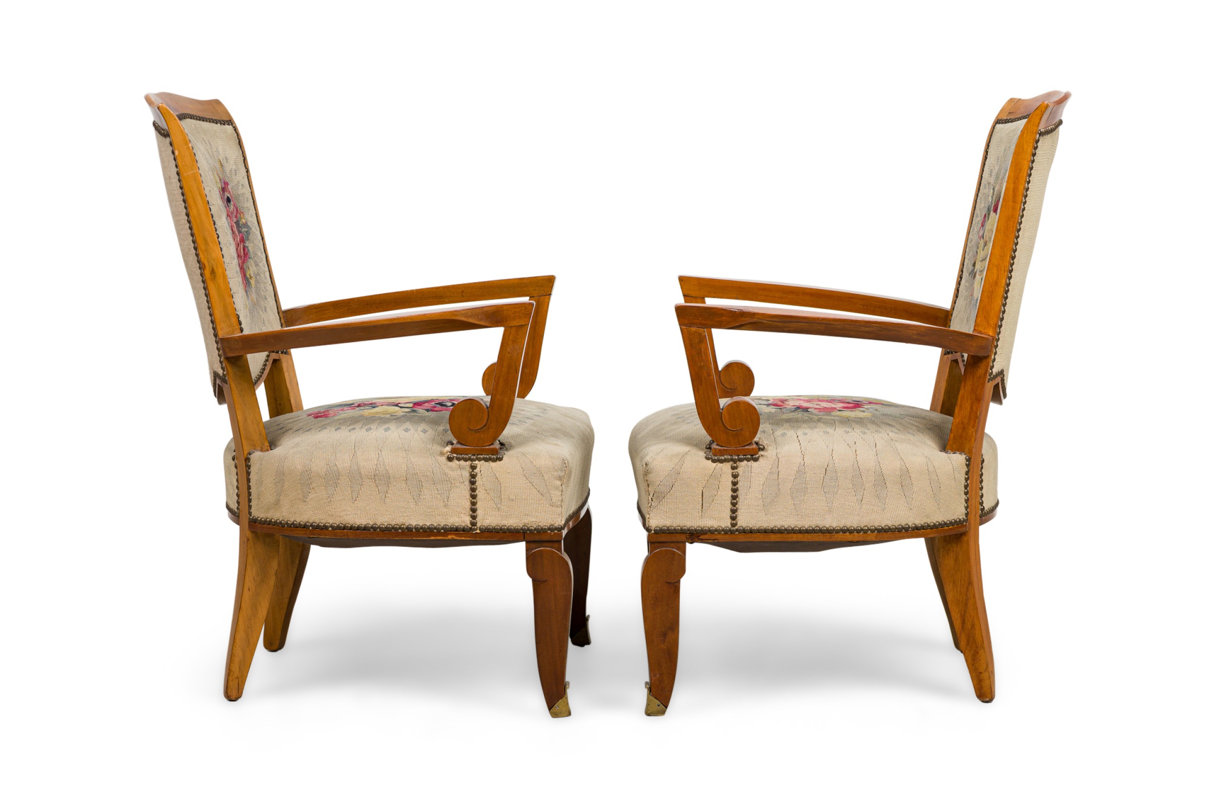 PAIR of French Art Deco mahogany open Armchairs with bronze feet and floral Aubusson upholstered seat and back. (att: JULES LELEU, Ile de France)