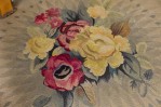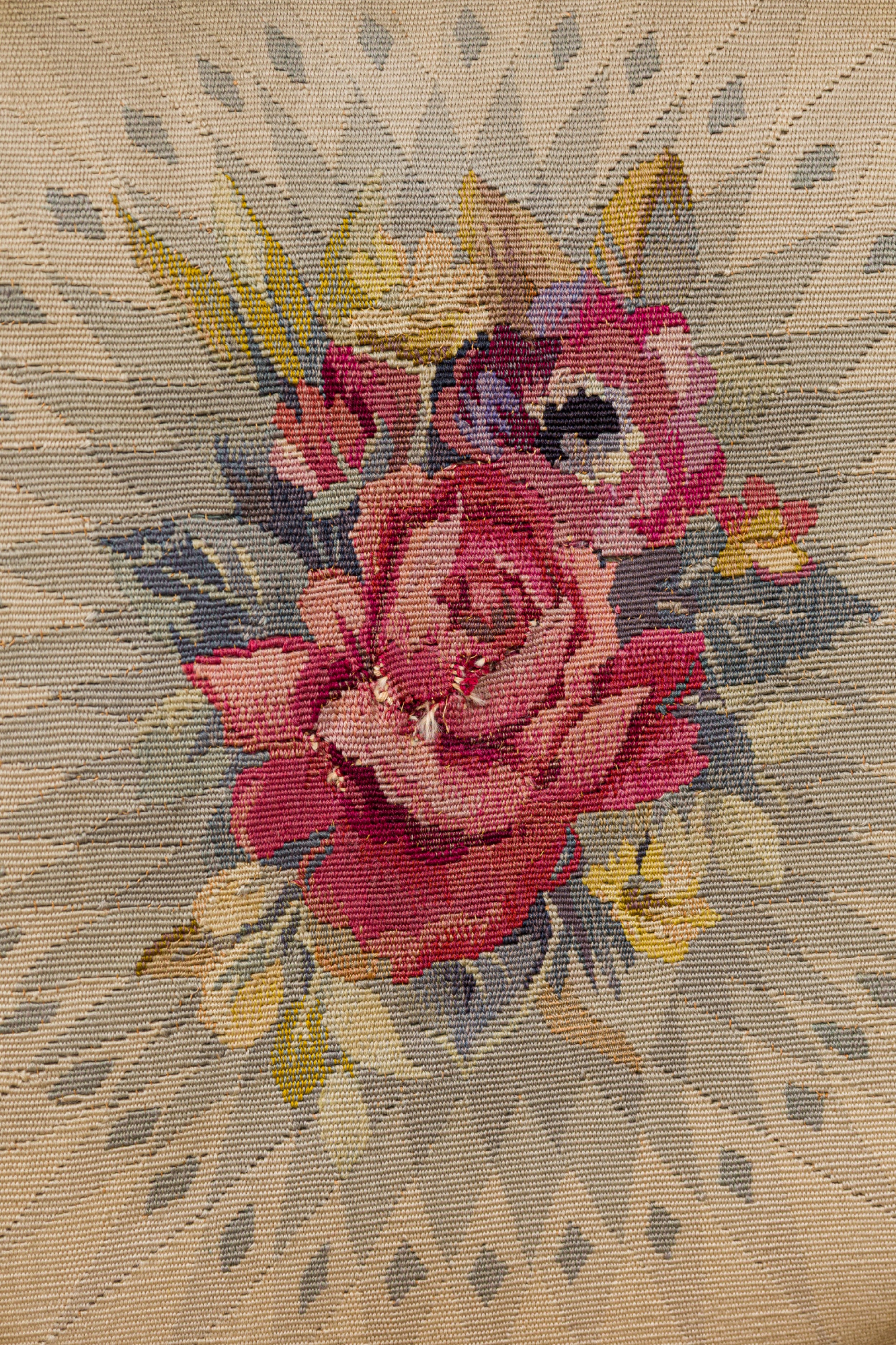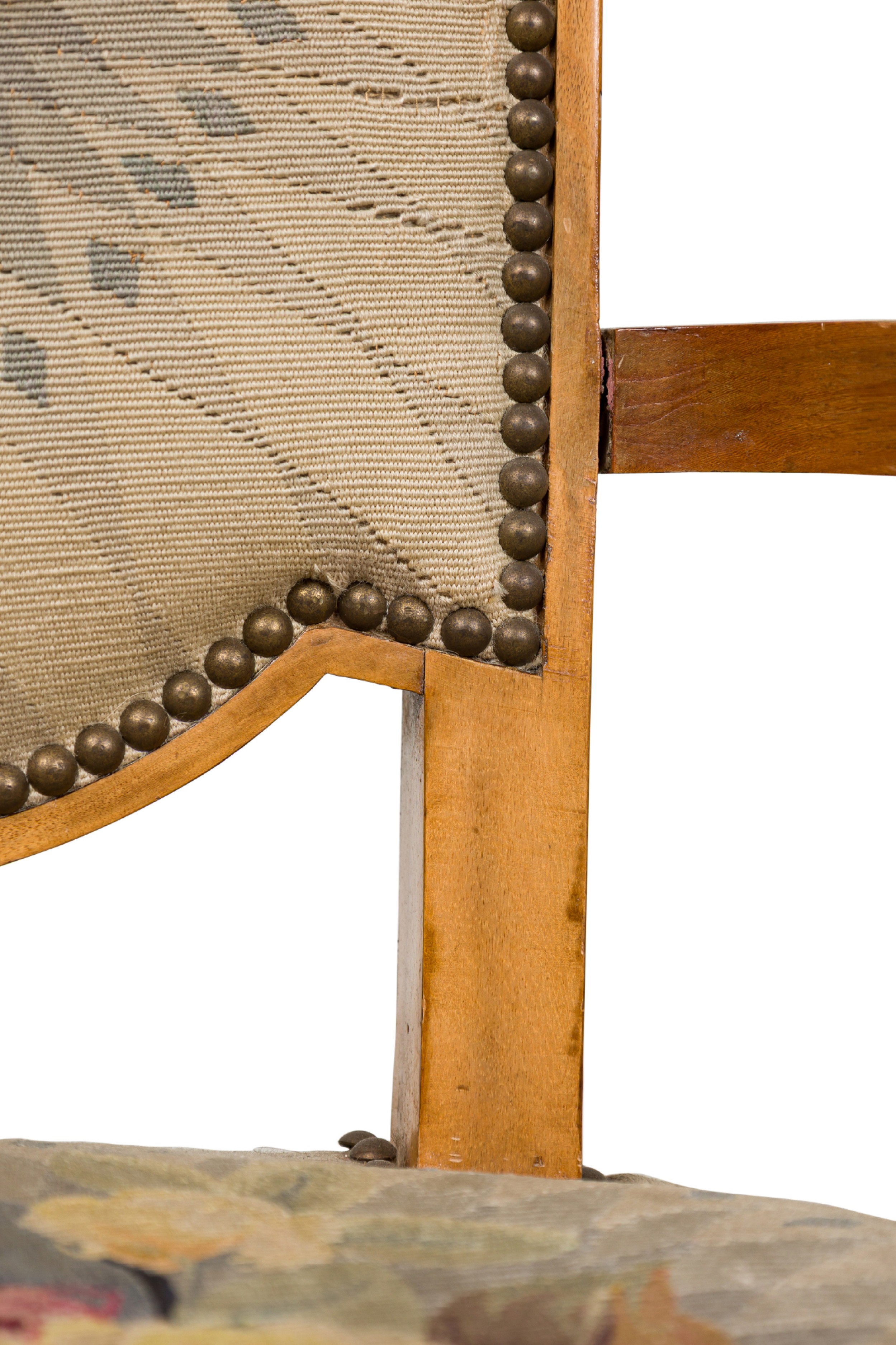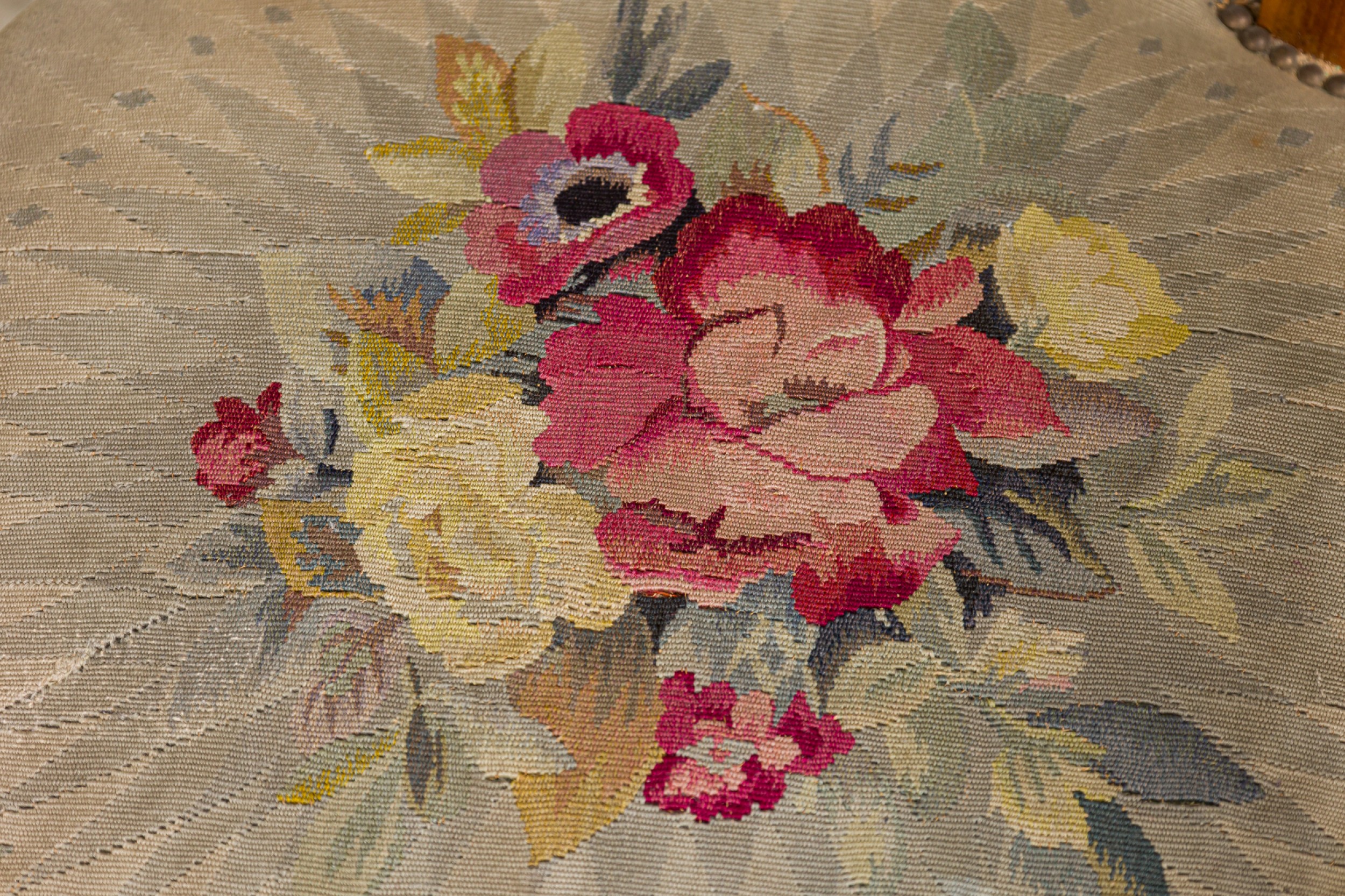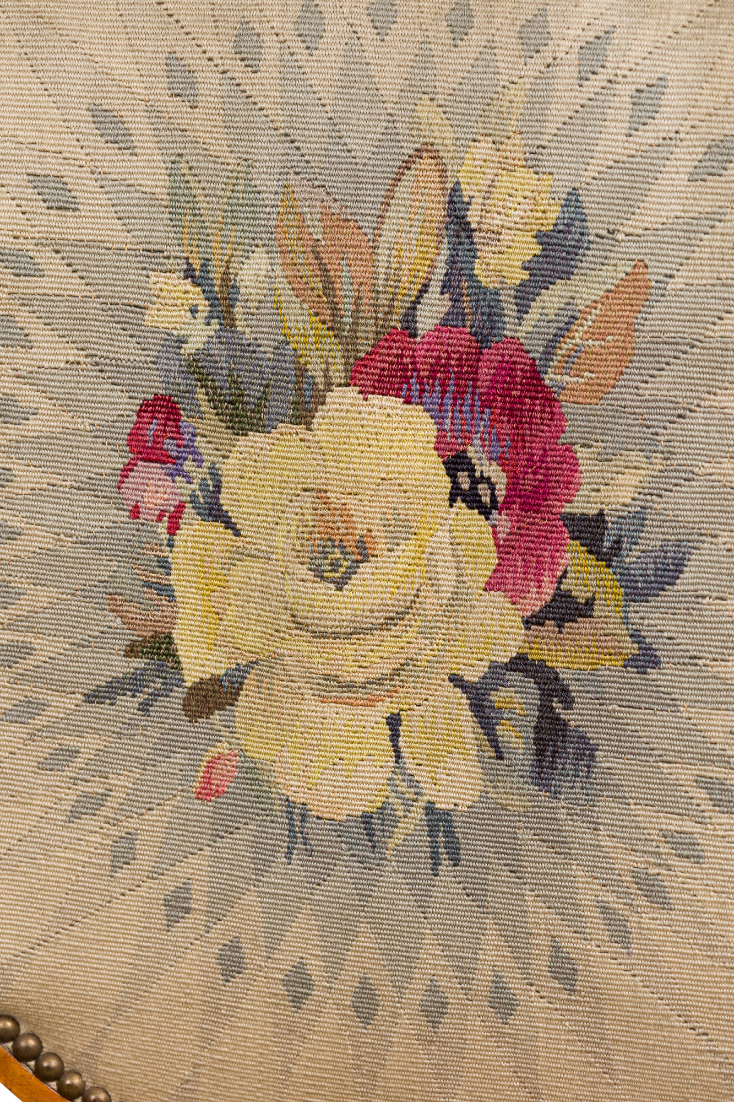 PAIR of French Art Deco mahogany open Armchairs with bronze feet and floral Aubusson upholstered seat and back. (att: JULES LELEU, Ile de France).