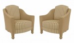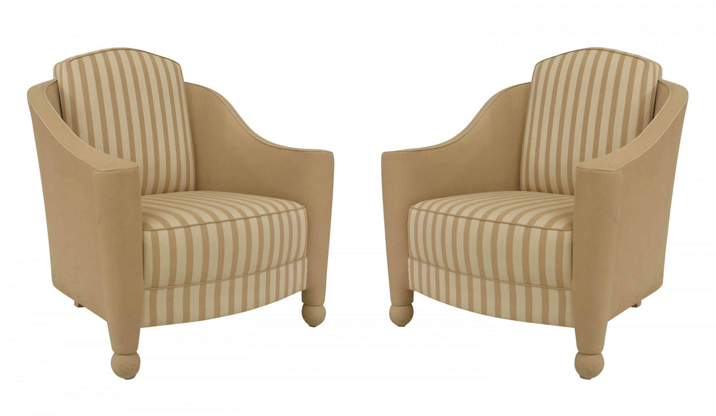 PAIR of French Art Deco-style beige linen upholstered bergeres with round back and flared arms with striped seat and back cushion (GEOFFREY BRADFIELD DESIGN) (PRICED AS PAIR).