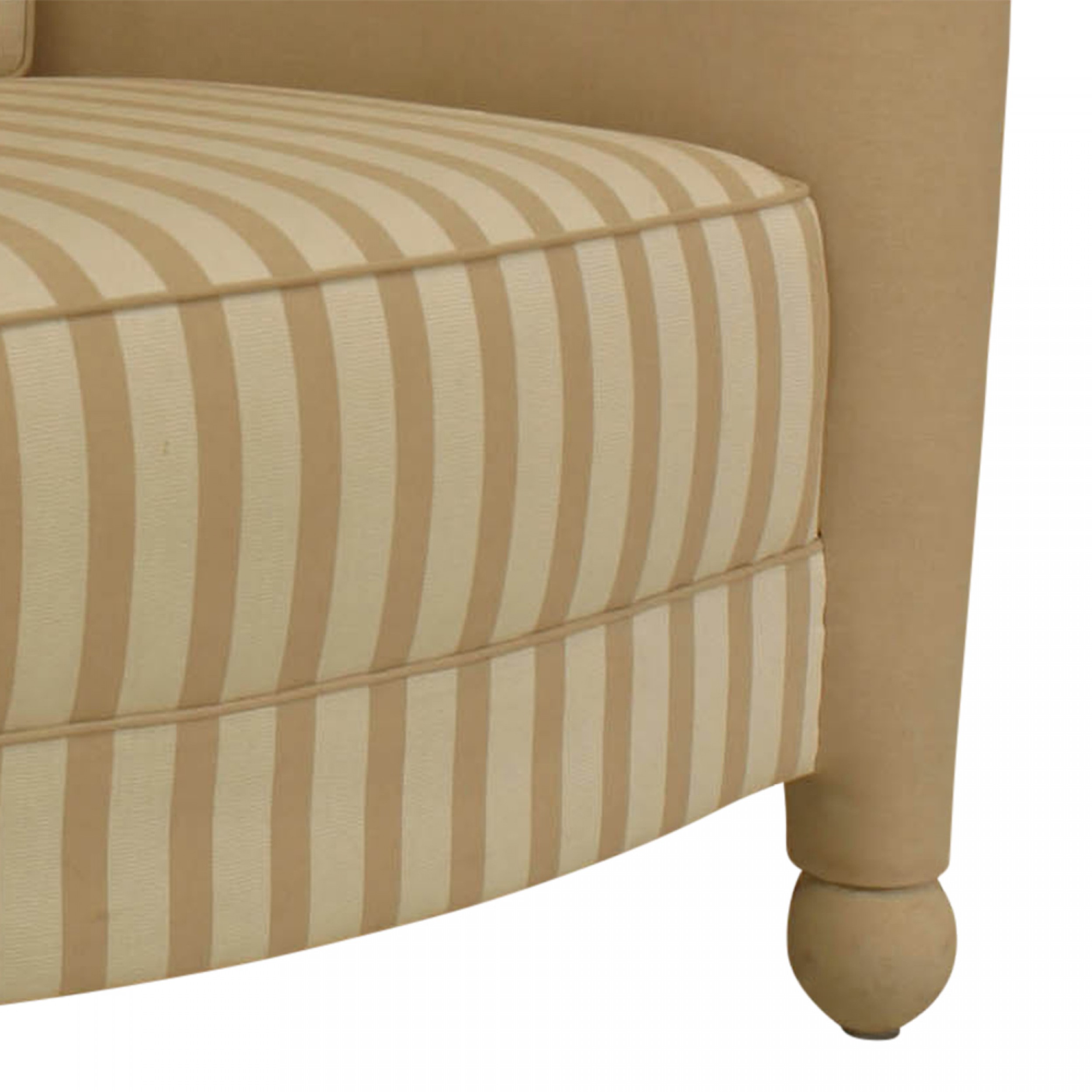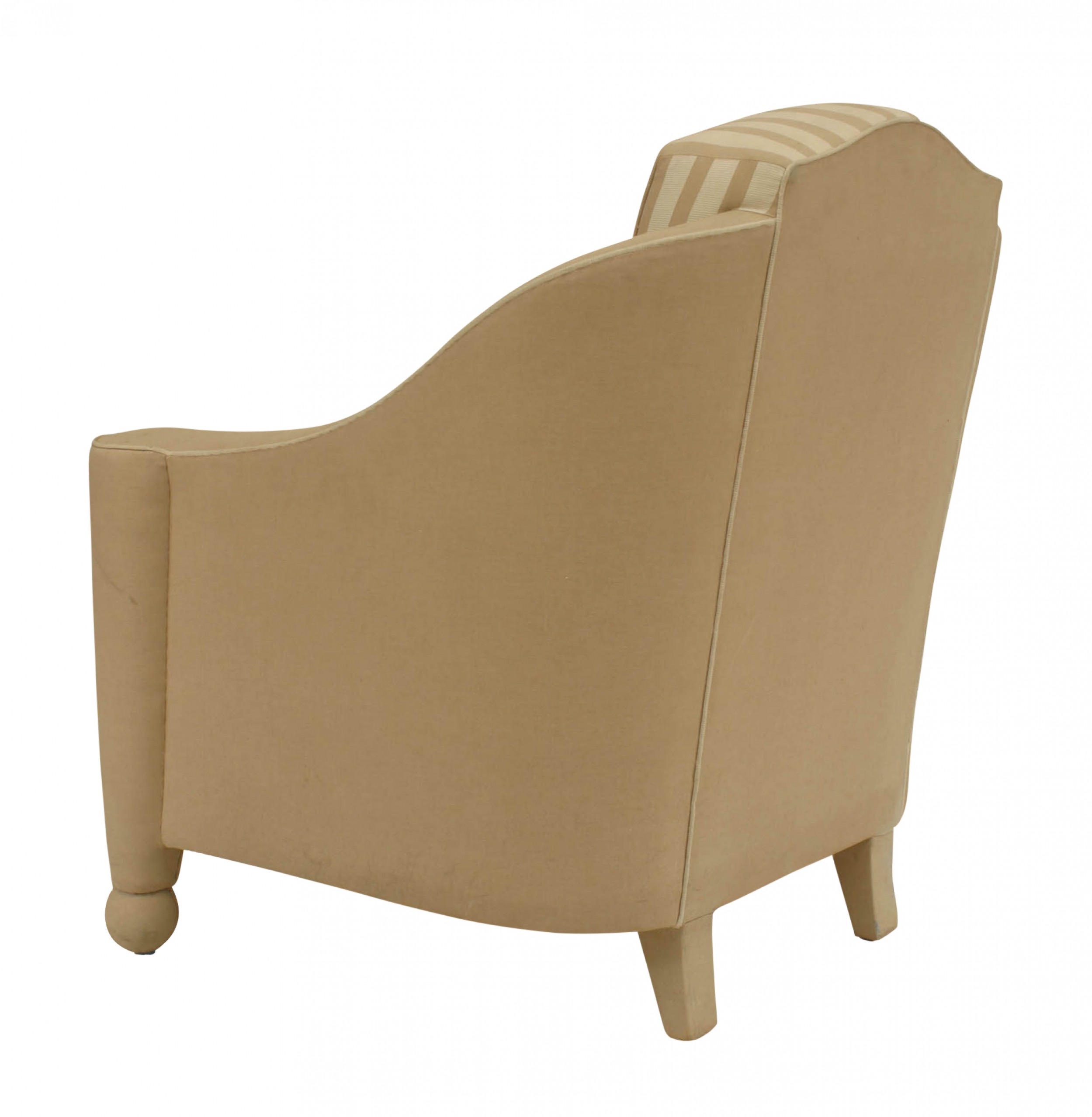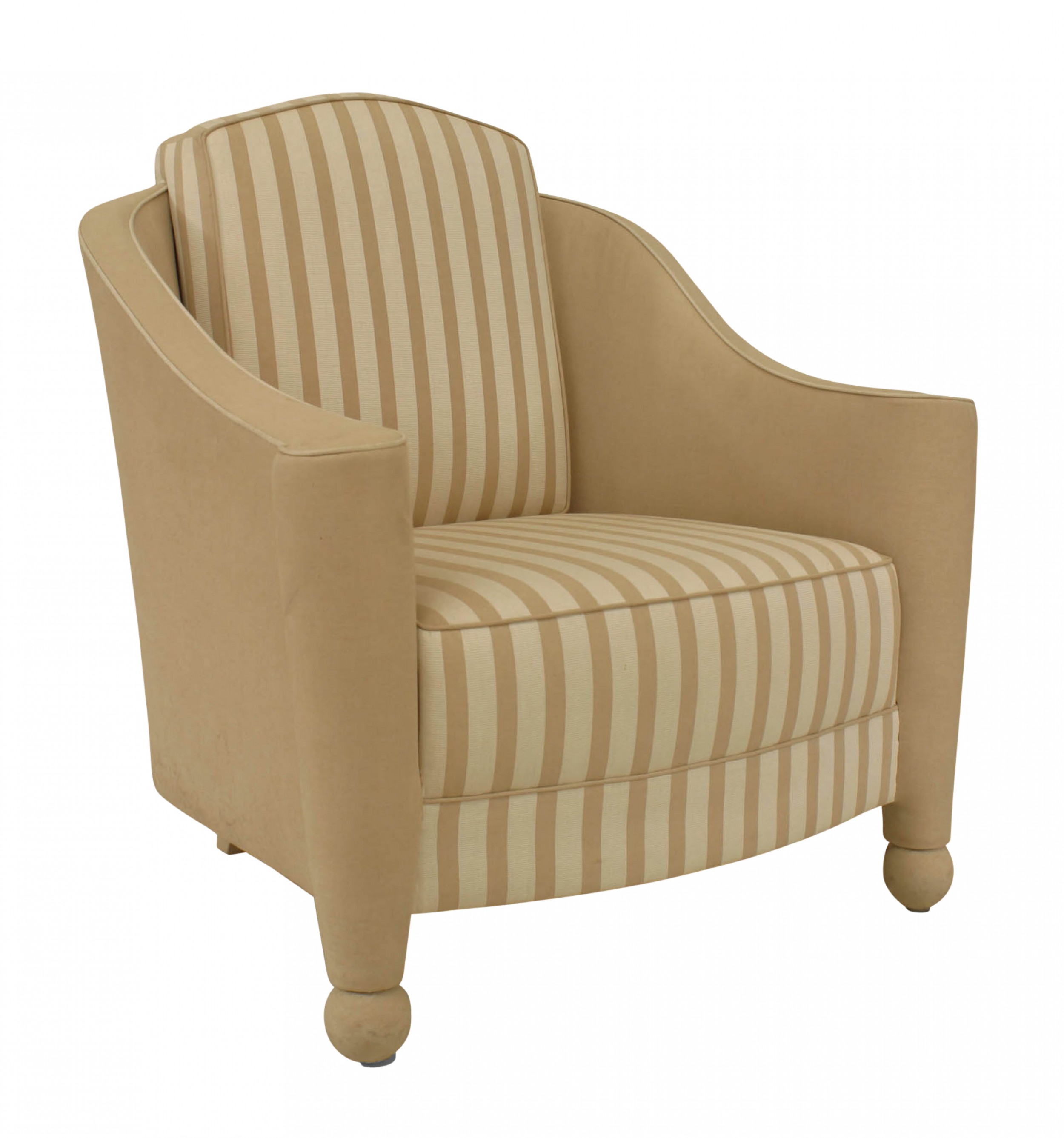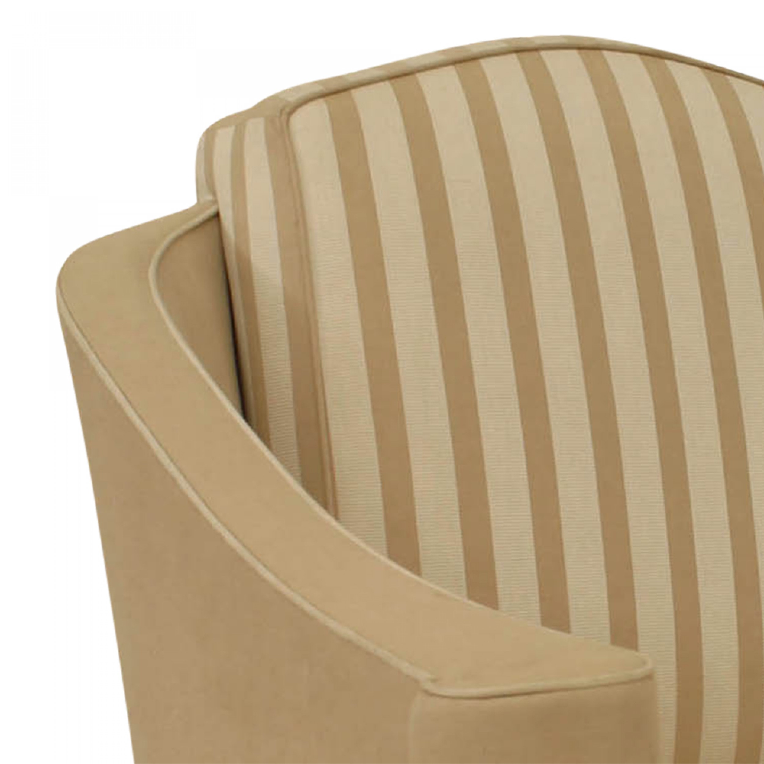 PAIR of French Art Deco-style beige linen upholstered bergeres with round back and flared arms with striped seat and back cushion (GEOFFREY BRADFIELD DESIGN) (PRICED AS PAIR)