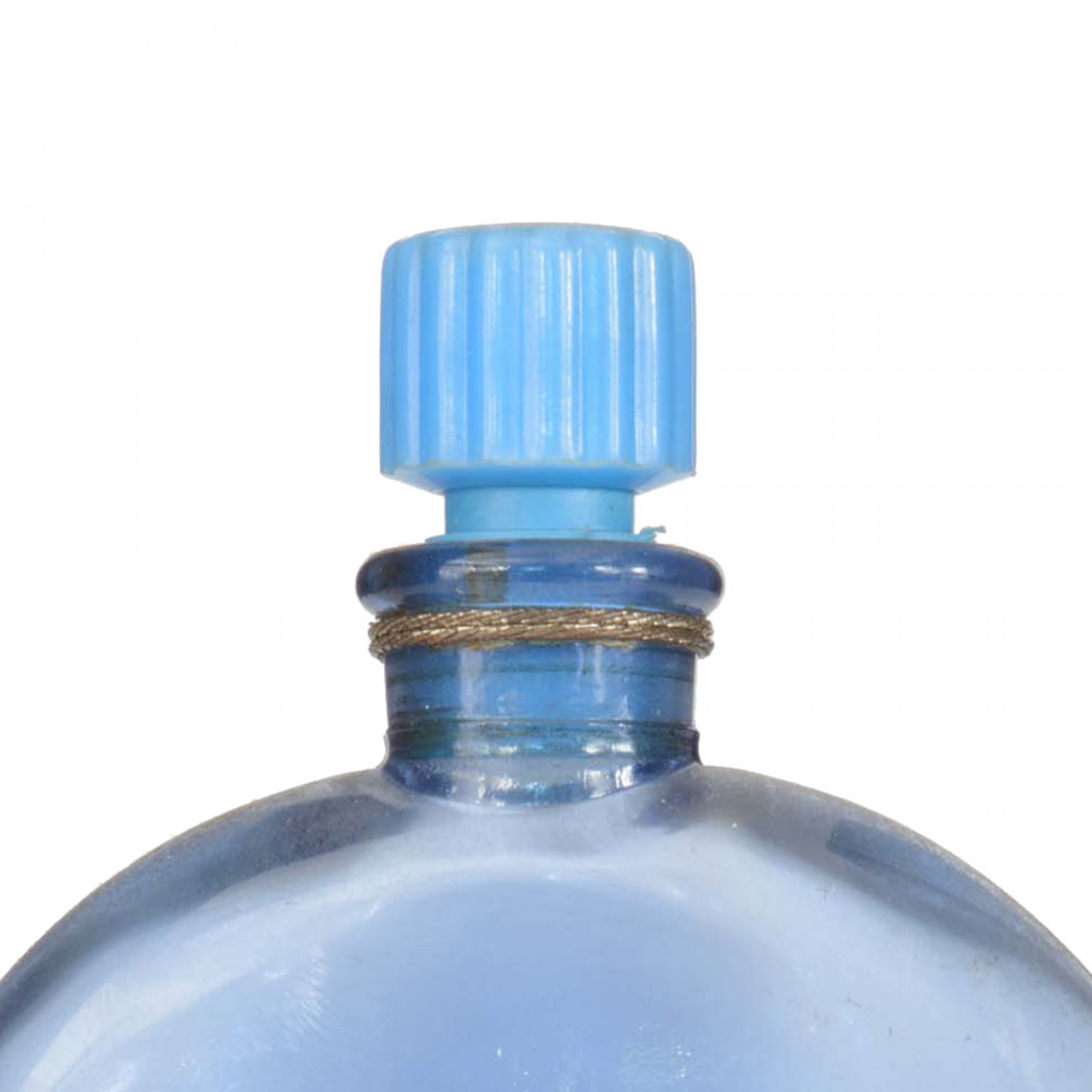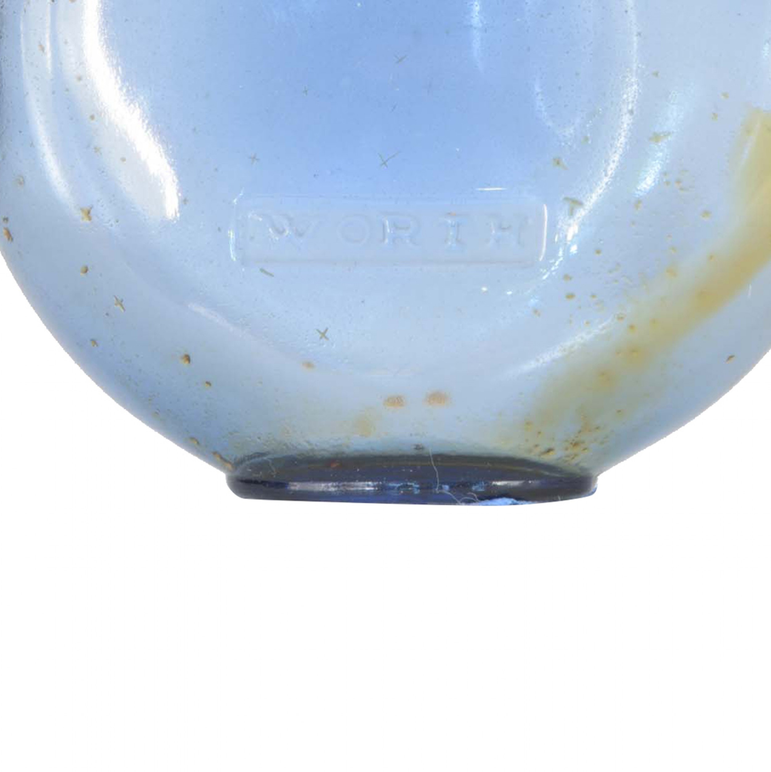 French Art Deco round flat blue-tinted glass perfume bottle with brand name "Worth" engraved on bottom, and a round ribbed turquoise plastic stopper (signed LALIQUE).
