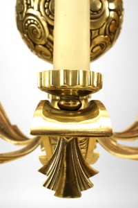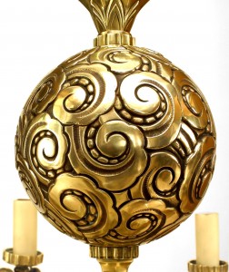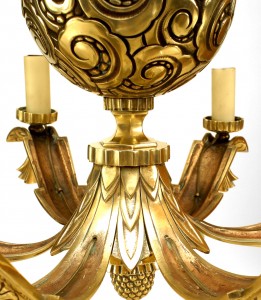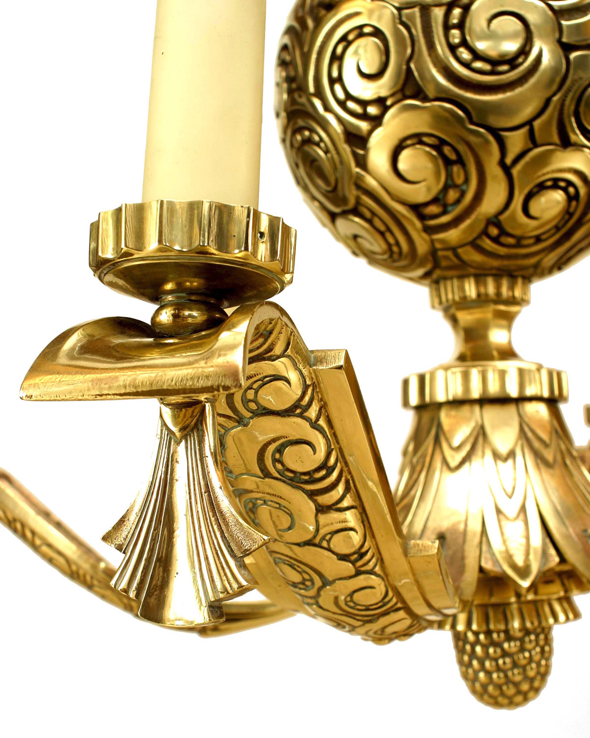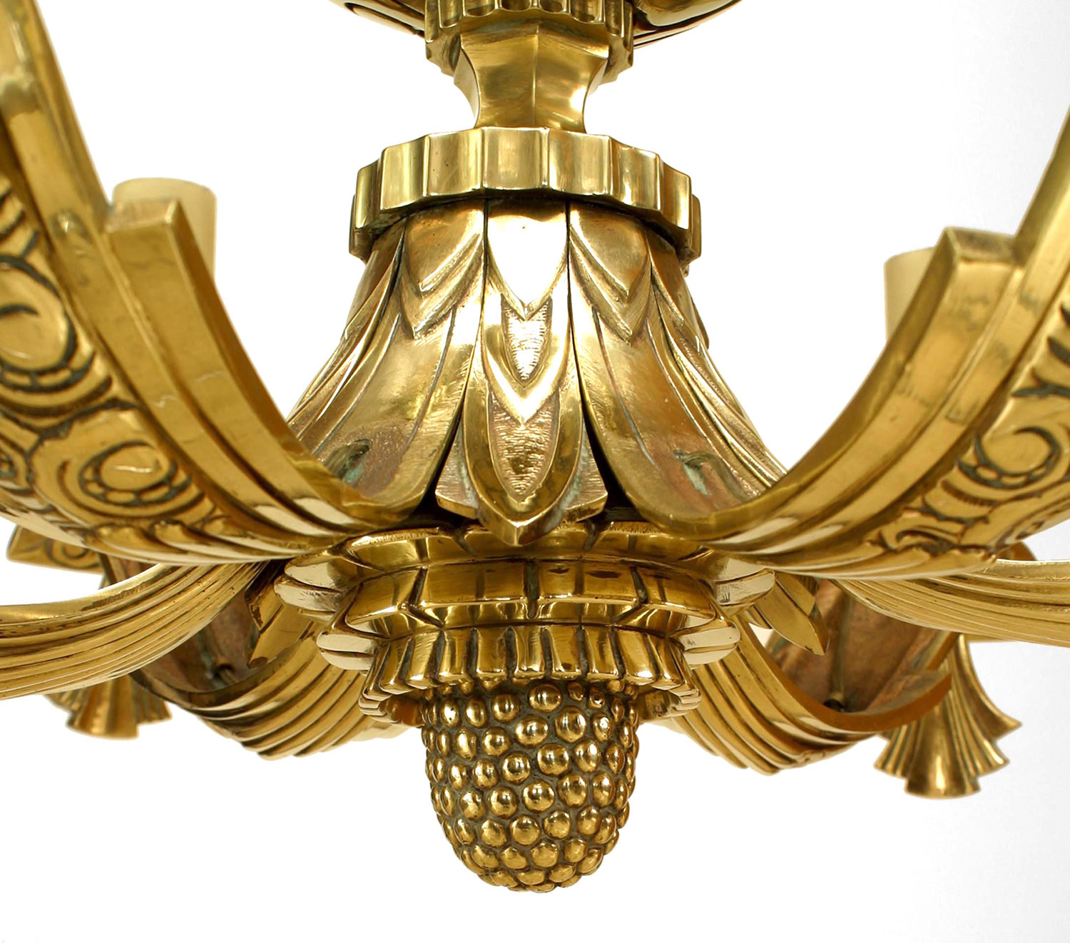 French Art Deco bronze chandelier featuring six scalloped, tassel-ended arms radiating out from a central, scroll-relief design sphere and acorn finial bottom..