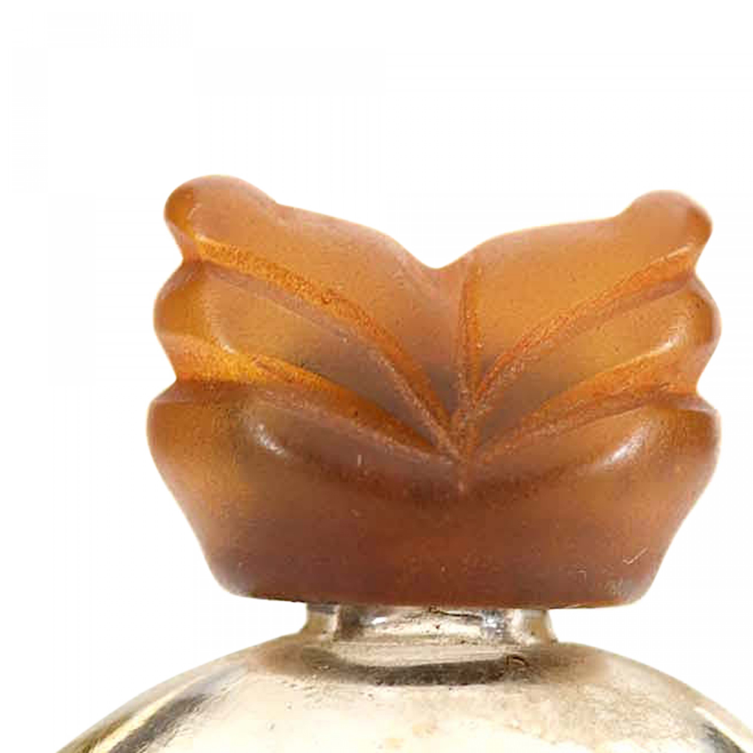 French Art Deco small clear and frosted glass perfume bottle (CHICHI by RENOIR "Ecarlette Suzy") shaped as a tilted heart on a round base, with an brown bakelite stopper and "Chichi" written in white.