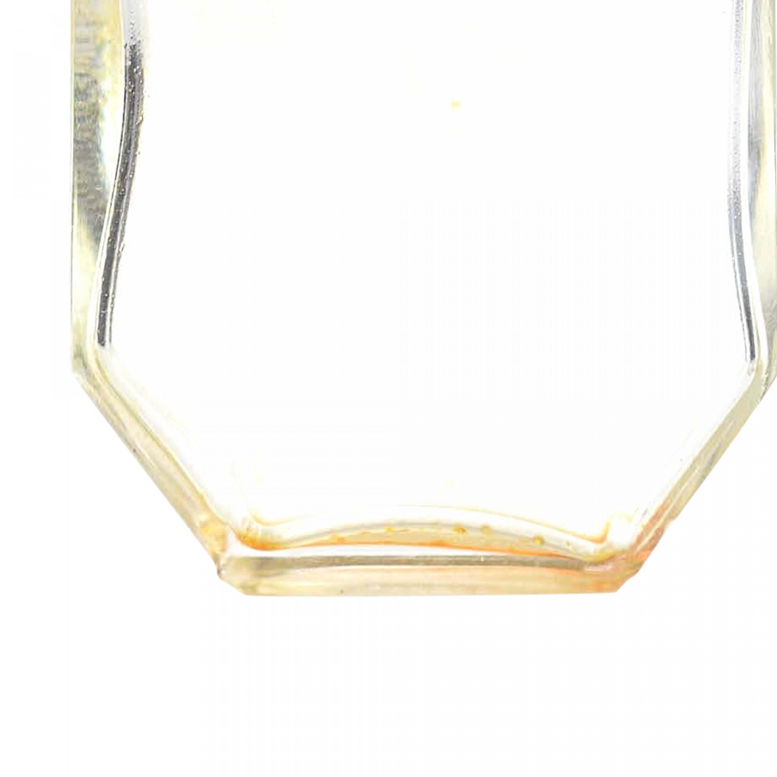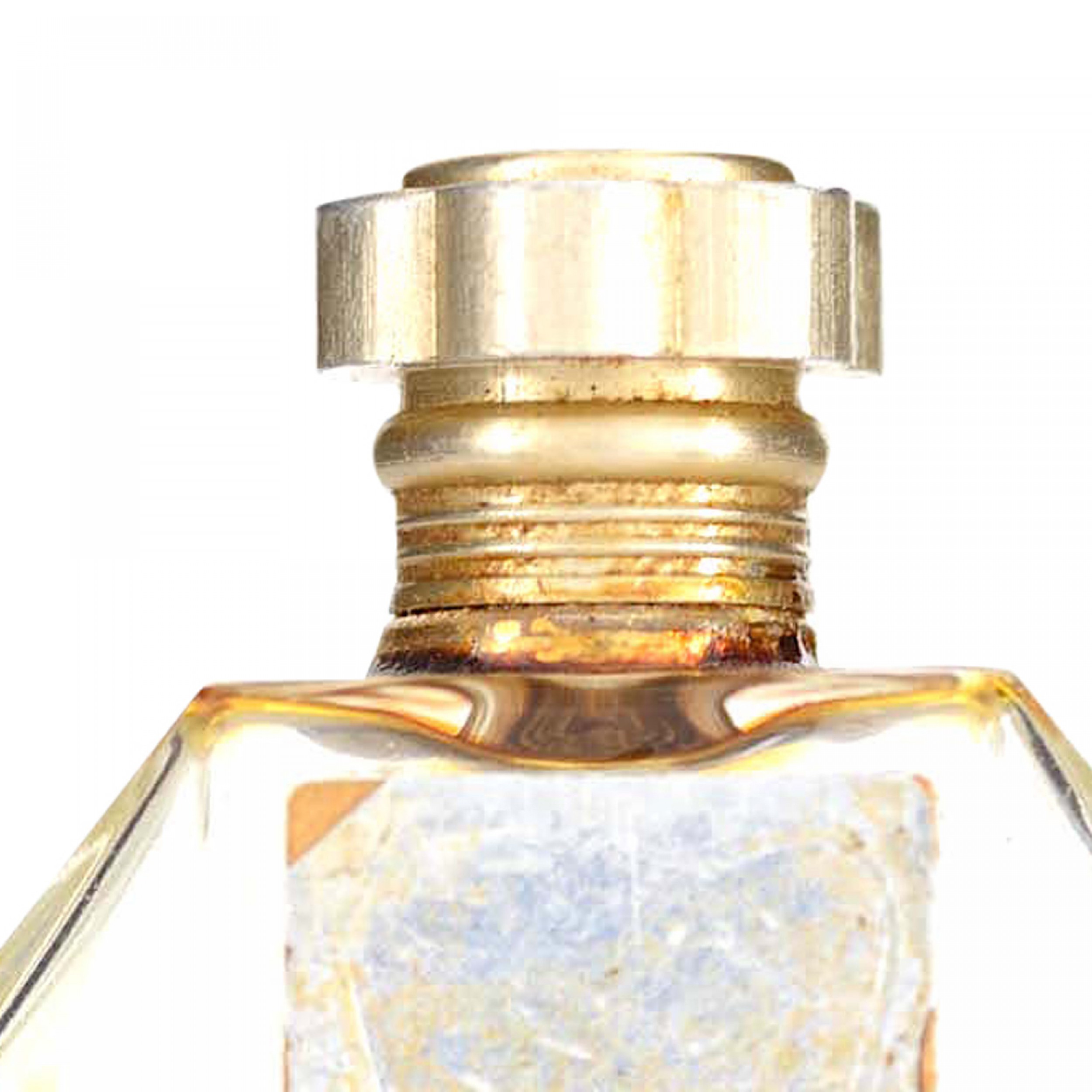 French Art Deco small faceted clear glass perfume bottle (CREPE DE CHINE by F. MILLOT) with a flower shaped gold-tone metal stopper.