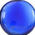 French Art Deco disc-shaped blue-tinted glass perfume bottle (DANS LA NUIT by WORTH) with brand name "Worth" engraved on bottom, and a round flat glass stopper engraved with perfume name "dans la nuit" (signed LALIQUE)