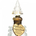 French Art Deco cone-shaped clear glass perfume bottle with horizontal ribbing, a gold heart-shaped label and a matching stopper.