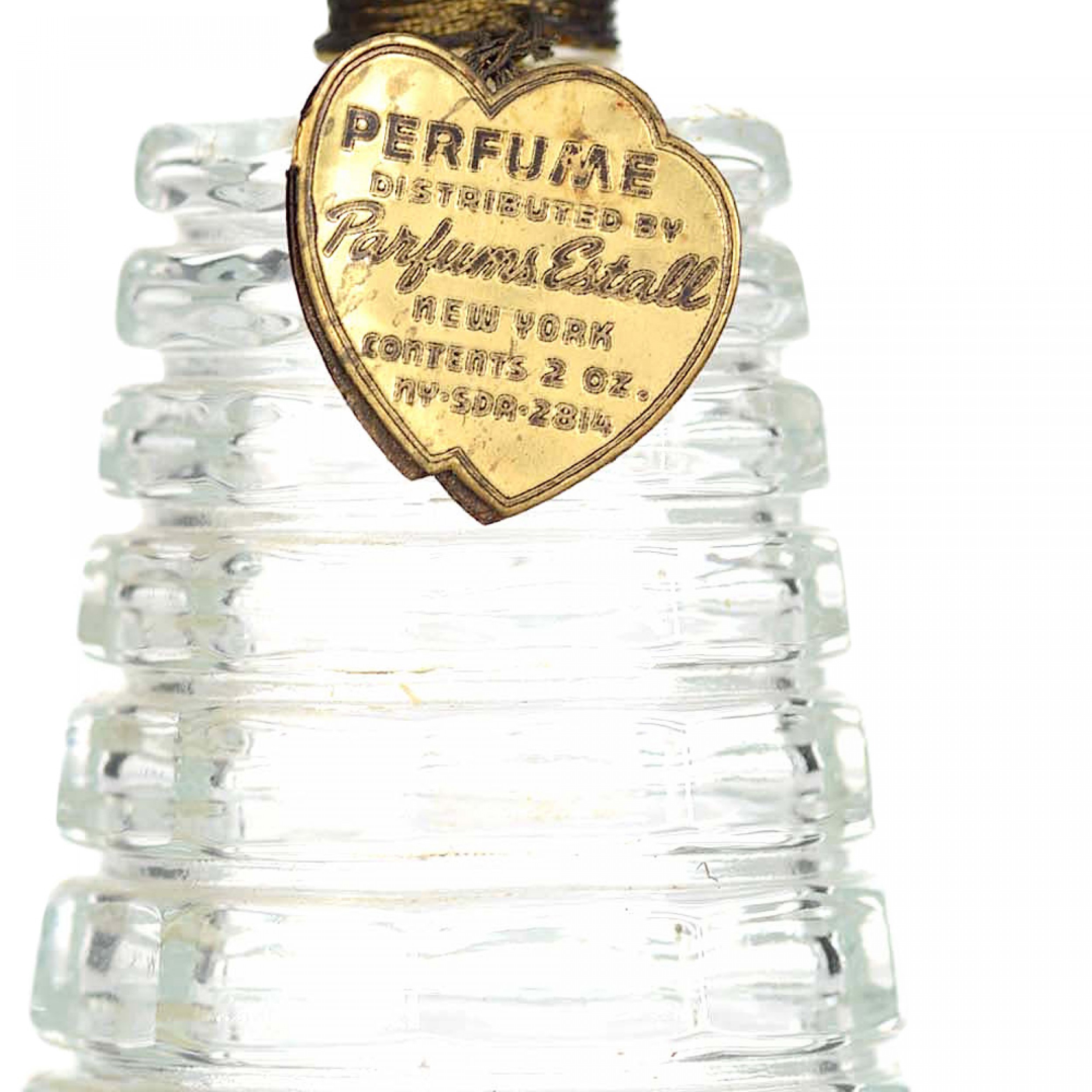 French Art Deco cone-shaped clear glass perfume bottle with horizontal ribbing, a gold heart-shaped label and a matching stopper..