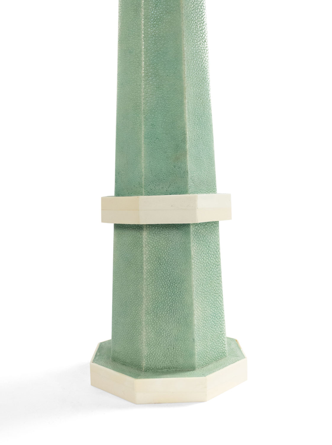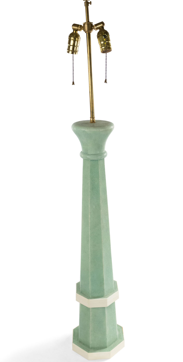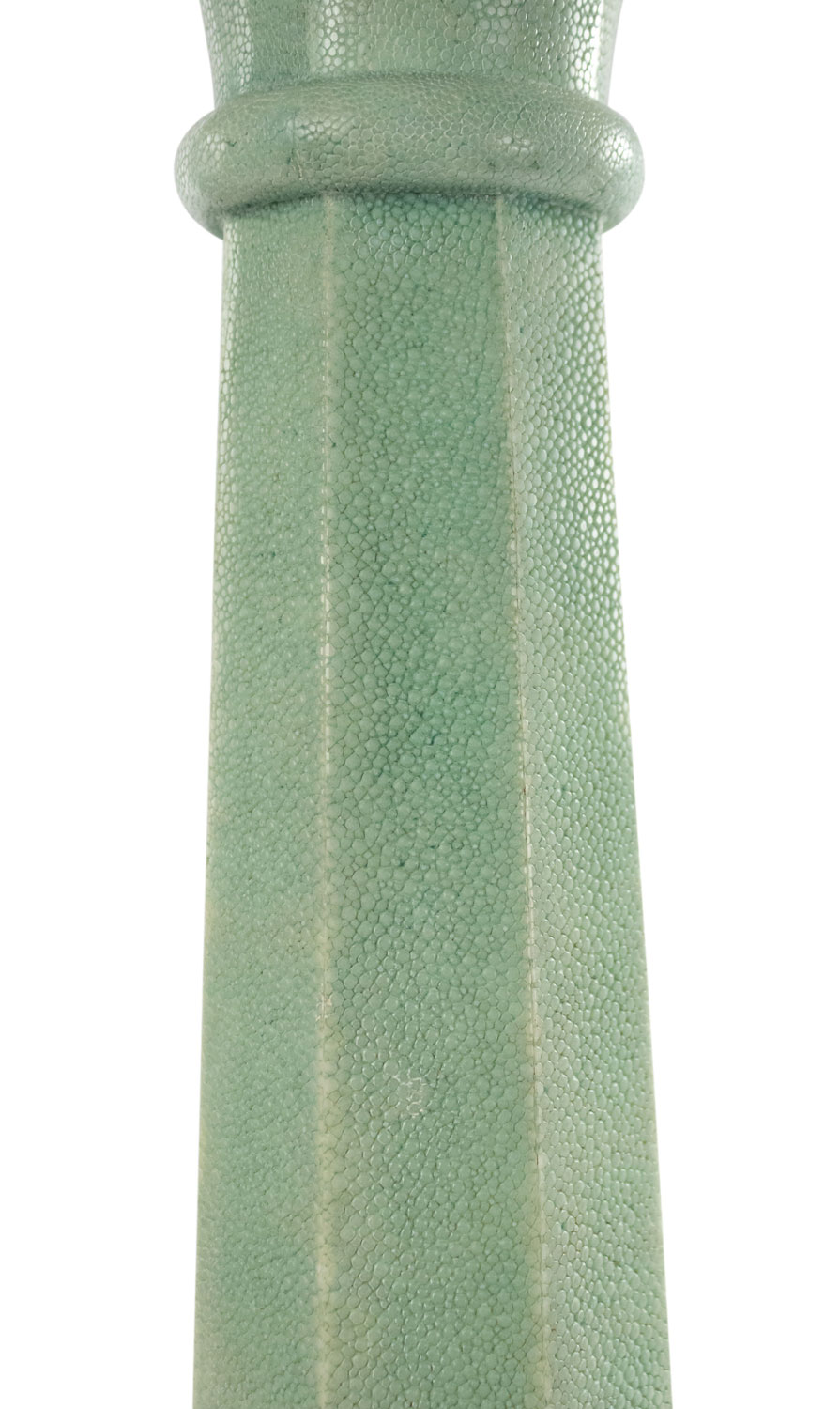 French Art Deco style green shagreen and bone inlaid trim table lamp with a tapered octagonal shape..
