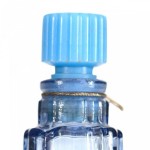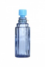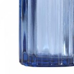 French Art Deco small cylindrical, skyscraper-shaped blue-tinted ribbed glass perfume bottle with a round ribbed turquoise plastic stopper (signed LALIQUE for Worth).