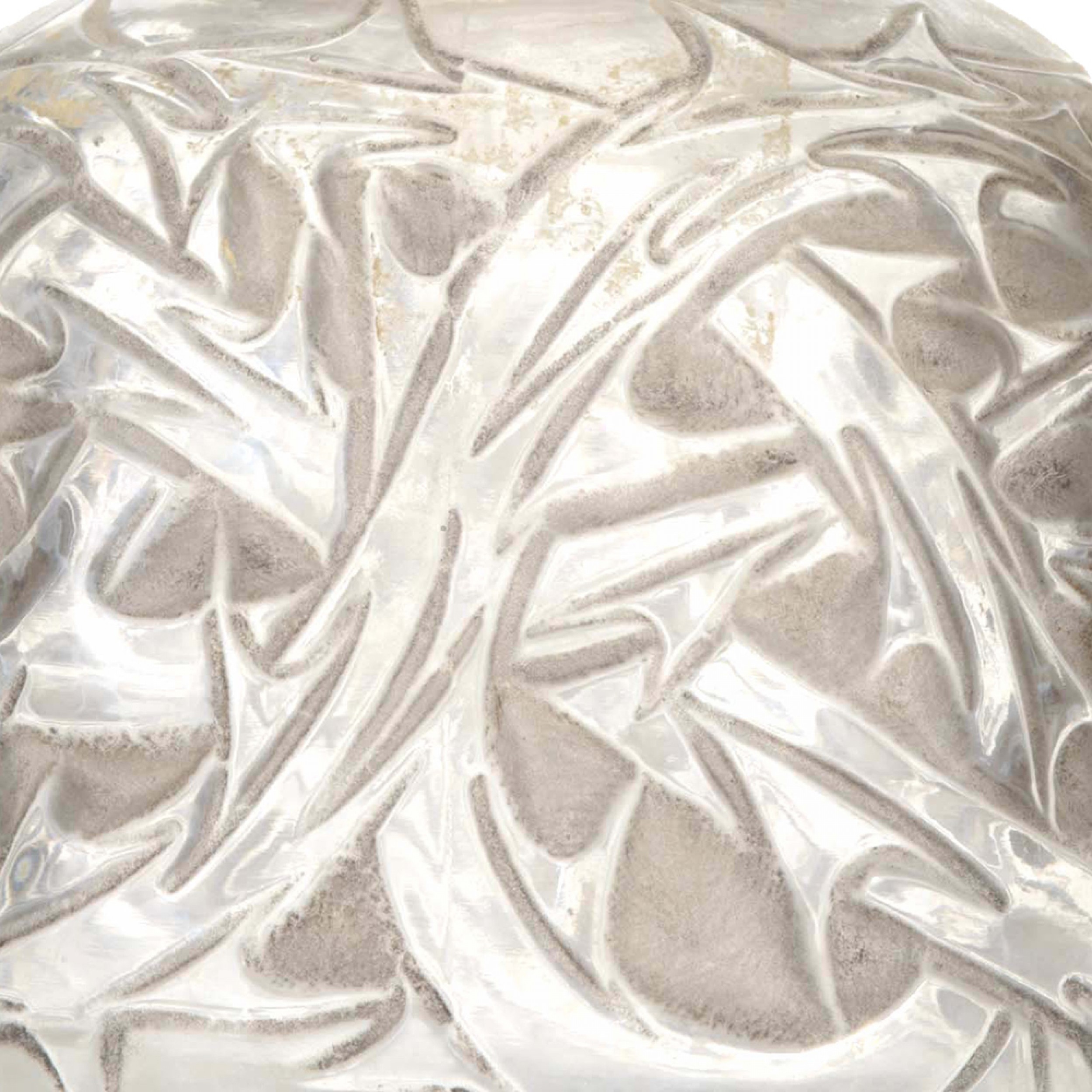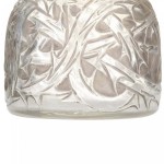 French Art Deco round glass perfume bottle with embossed decorative briar pattern and gray staining, with a matching dome-shaped stopper (signed LALIQUE)