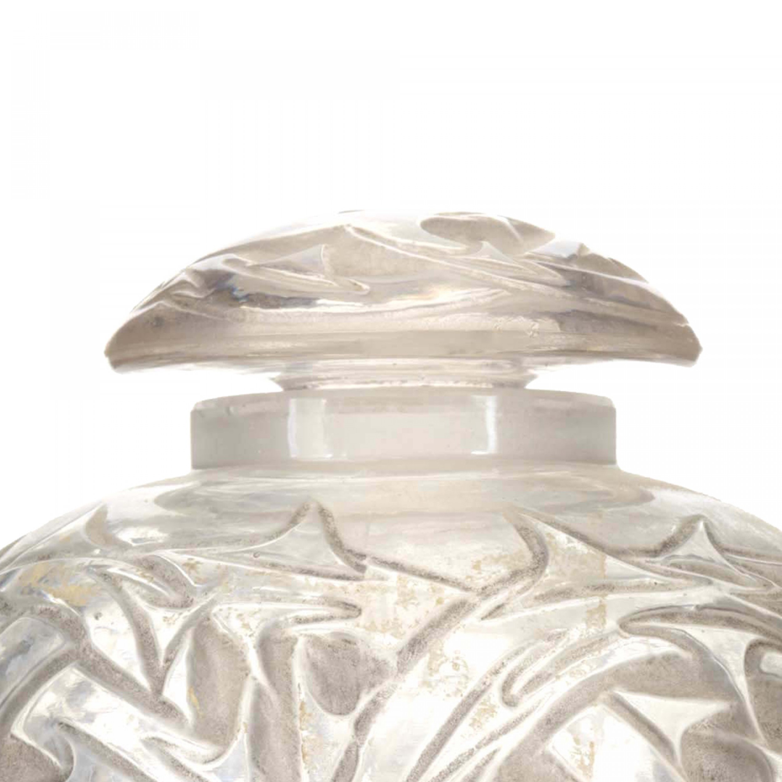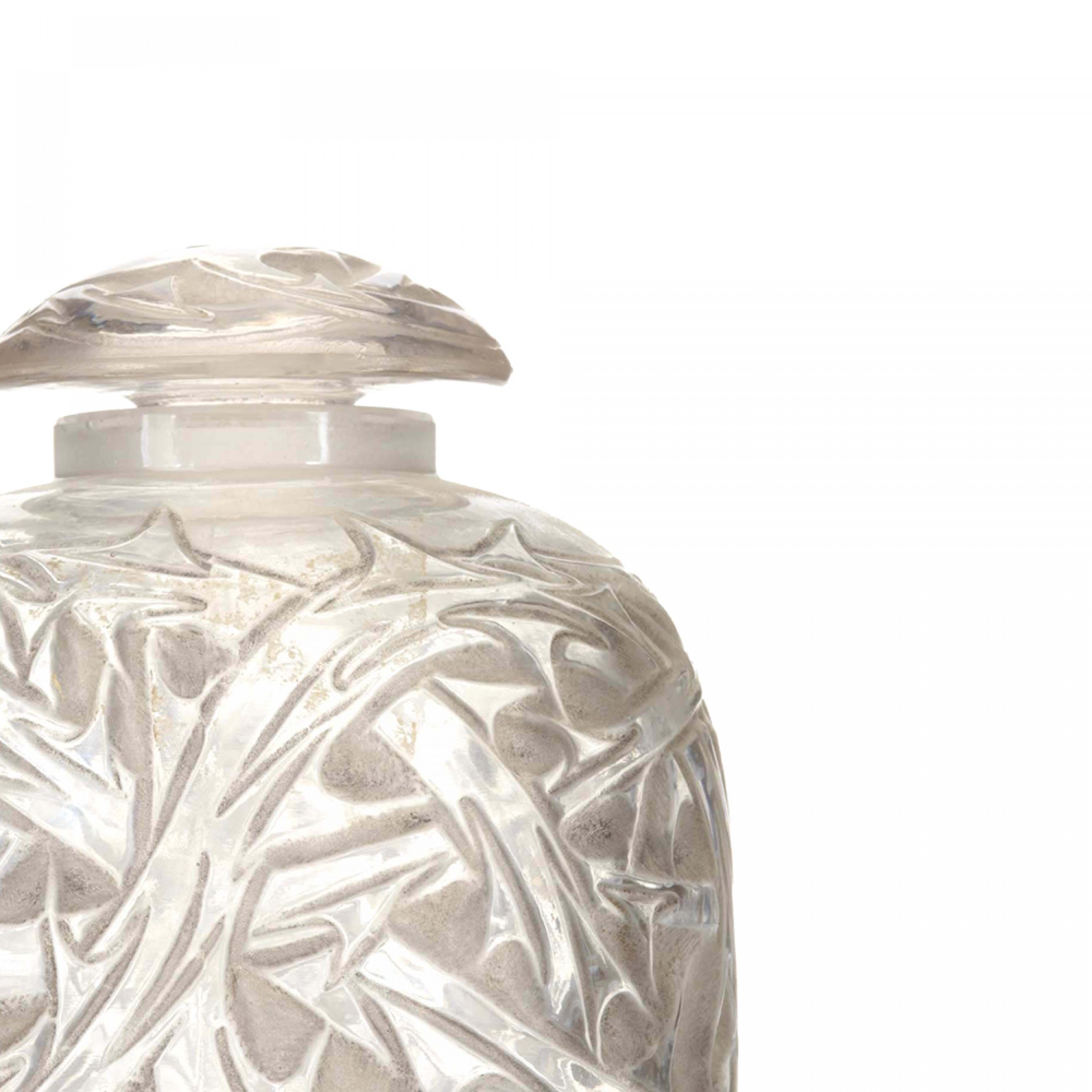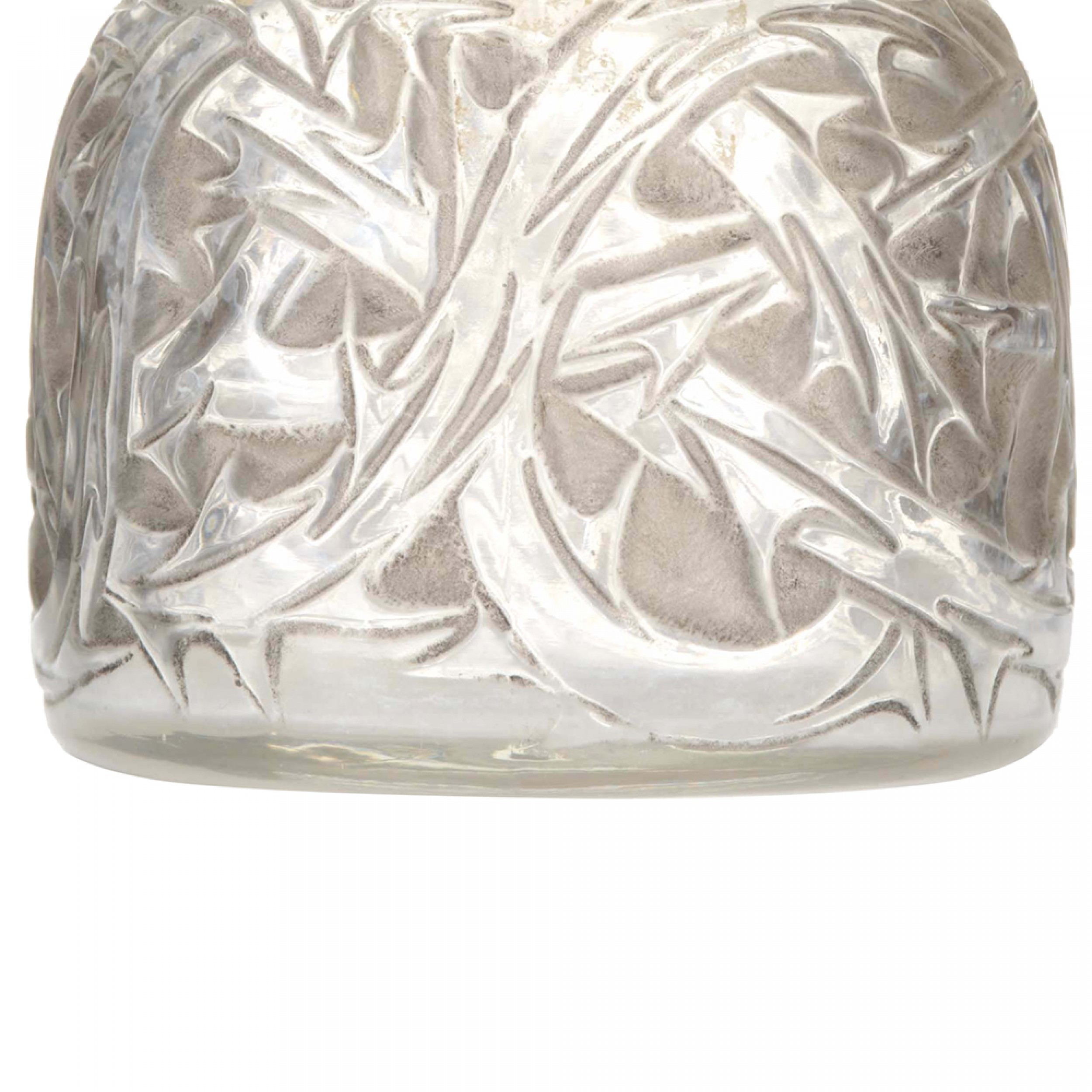 French Art Deco round glass perfume bottle with embossed decorative briar pattern and gray staining, with a matching dome-shaped stopper (signed LALIQUE).