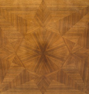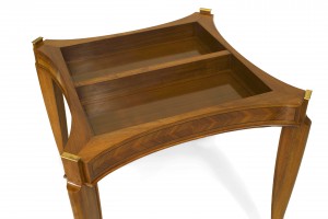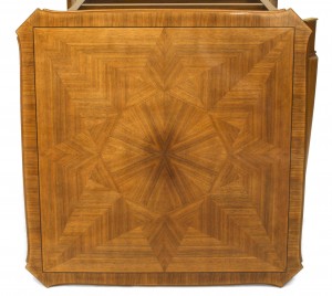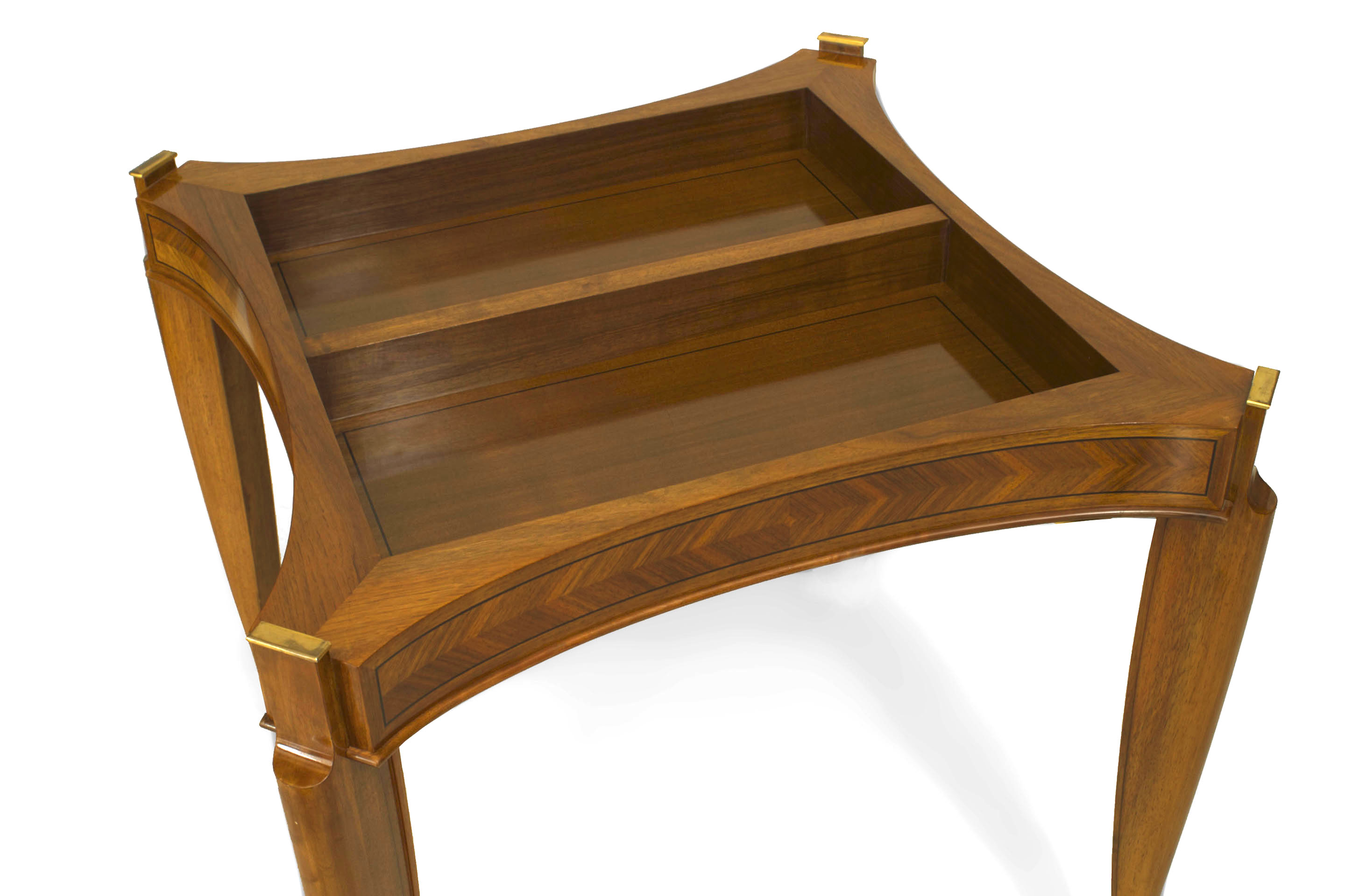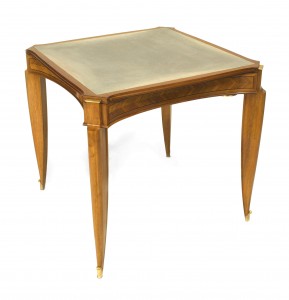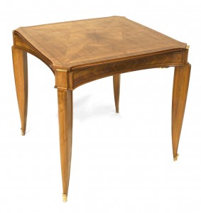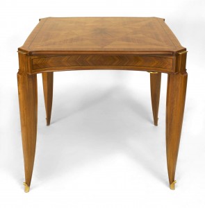 French Art Deco light mahogany square game table with a removable parquetry top & ebonized banded inlay trim over a concave apron with bronze trim & sabot. (JEAN PASCAUD) (Related item: 060628)