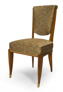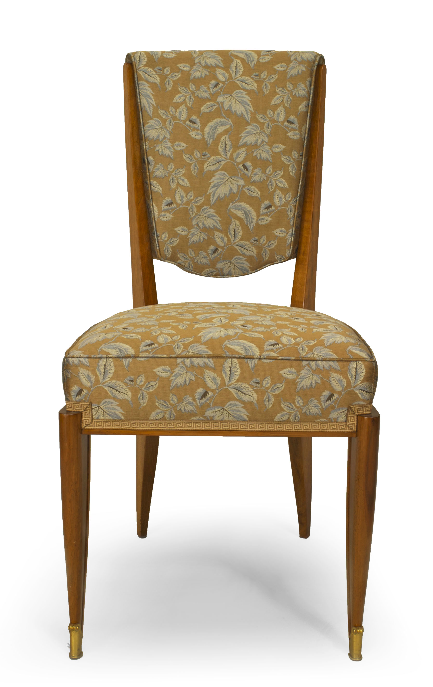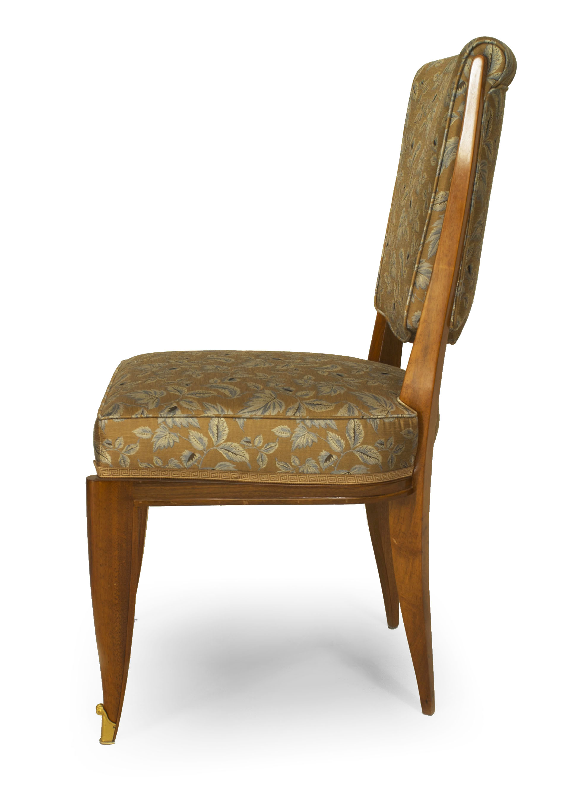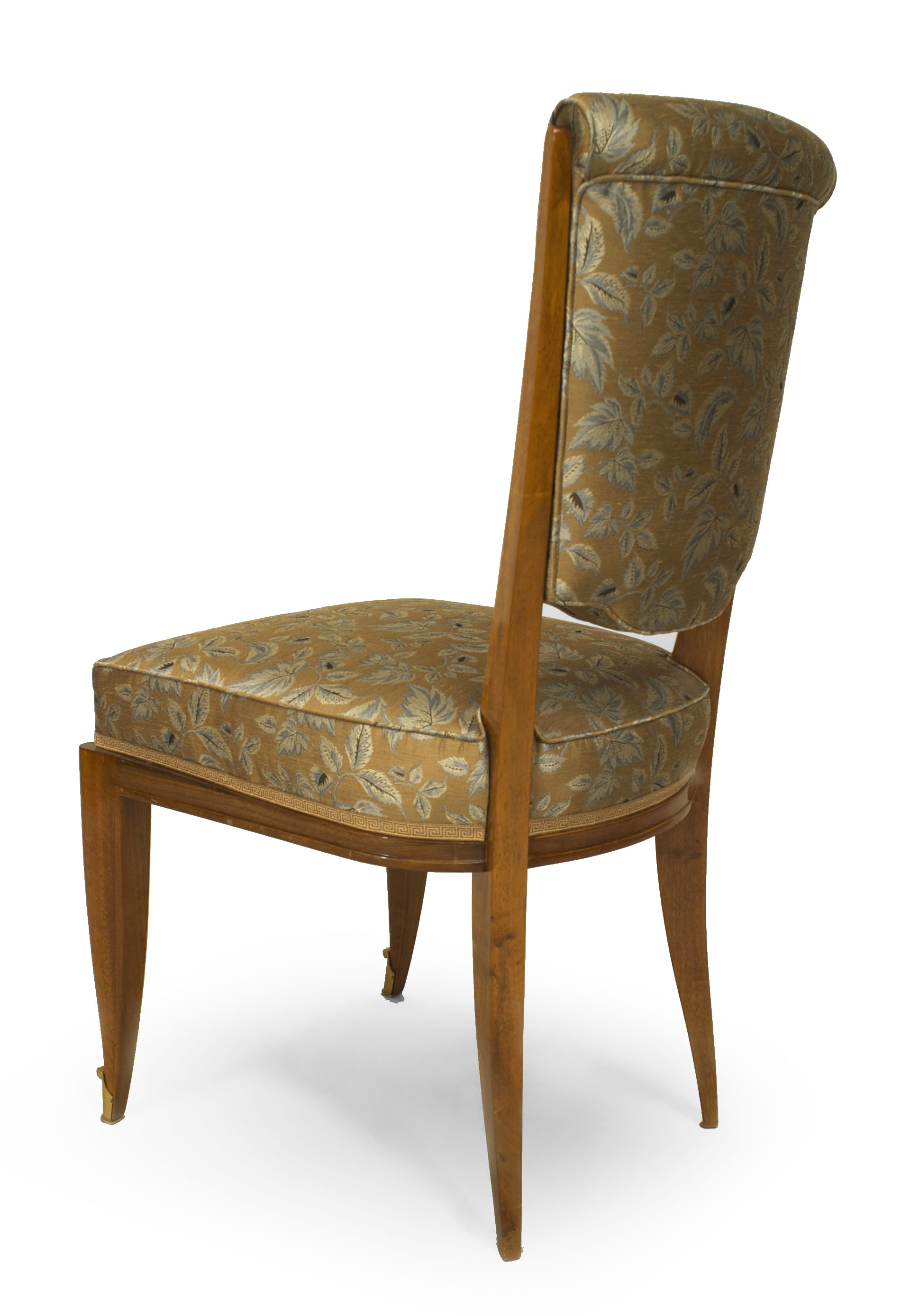 SET of 4 French Art Deco light mahogany side chairs with shaped back and upholstered seat and back with bronze sabot. (JEAN PASCAUD) (Matching game table #060627).
