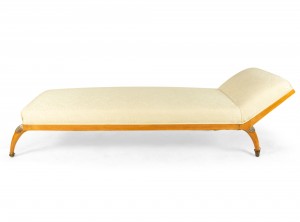 French Art Deco maple recamier with fluted silver gilt trim and beige circle upholstery