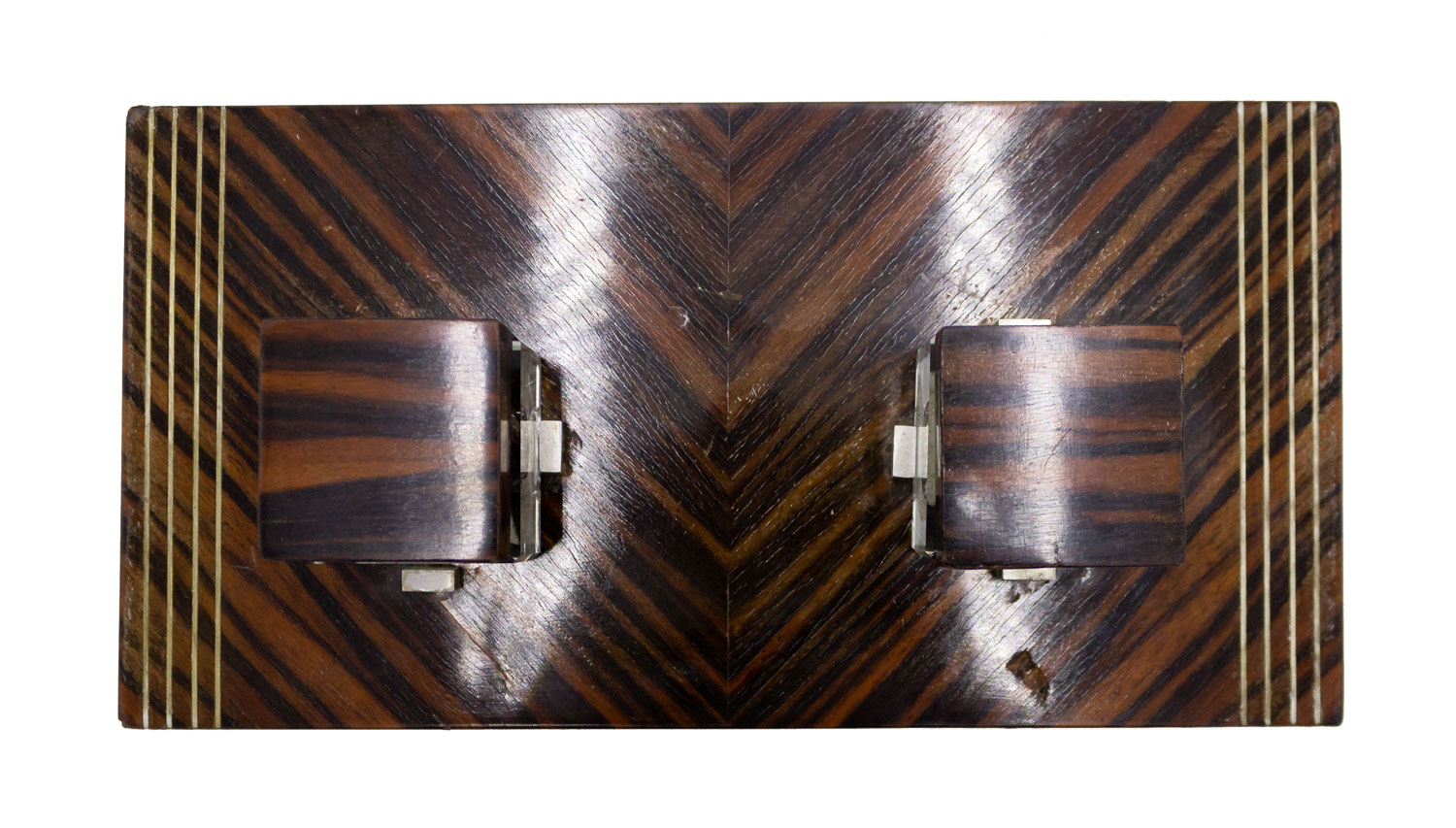 French Art Deco palisander and pewter inlaid inkwell with 2 crystal wells..