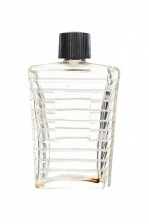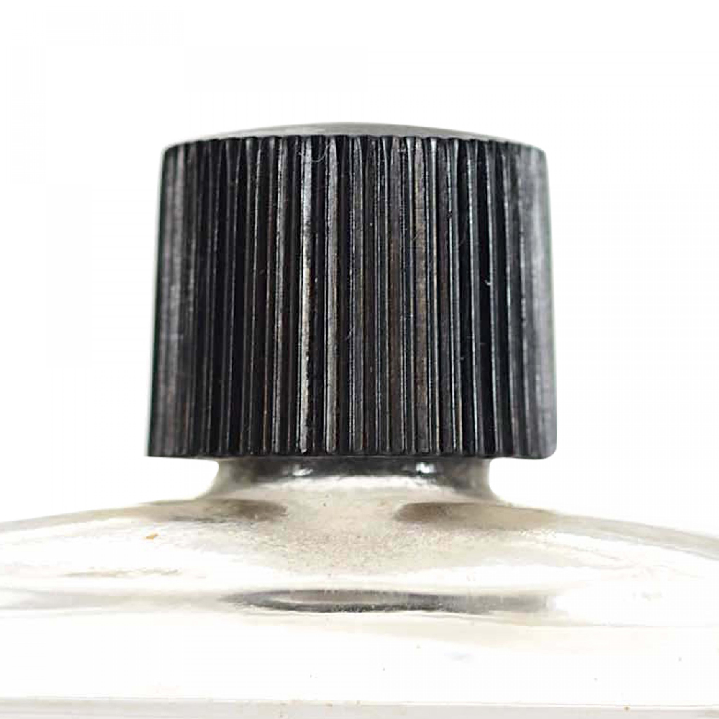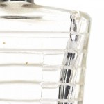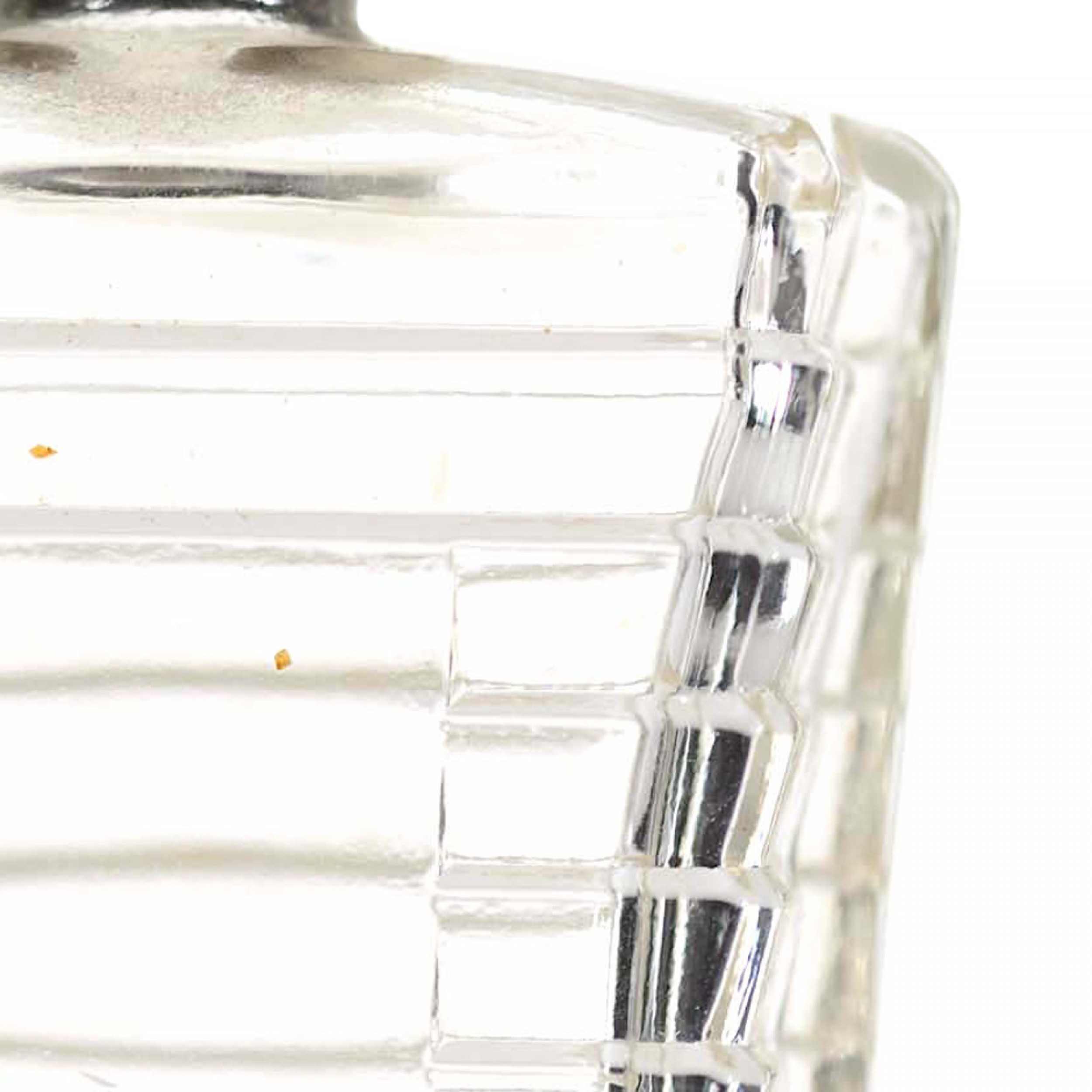 French Art Deco tapered rectangular clear glass perfume bottle with horizontal ribbing and a black plastic twist-off stopper..