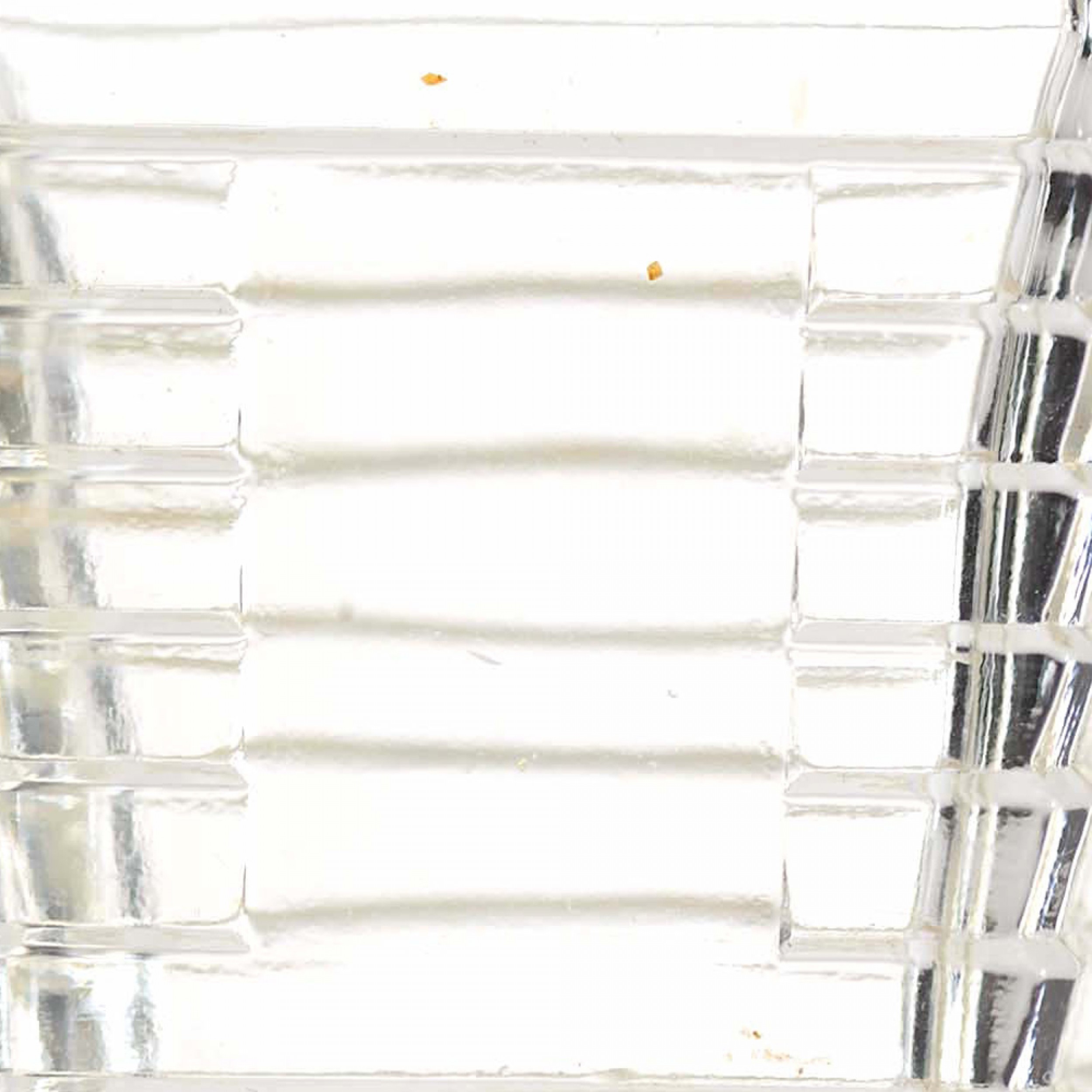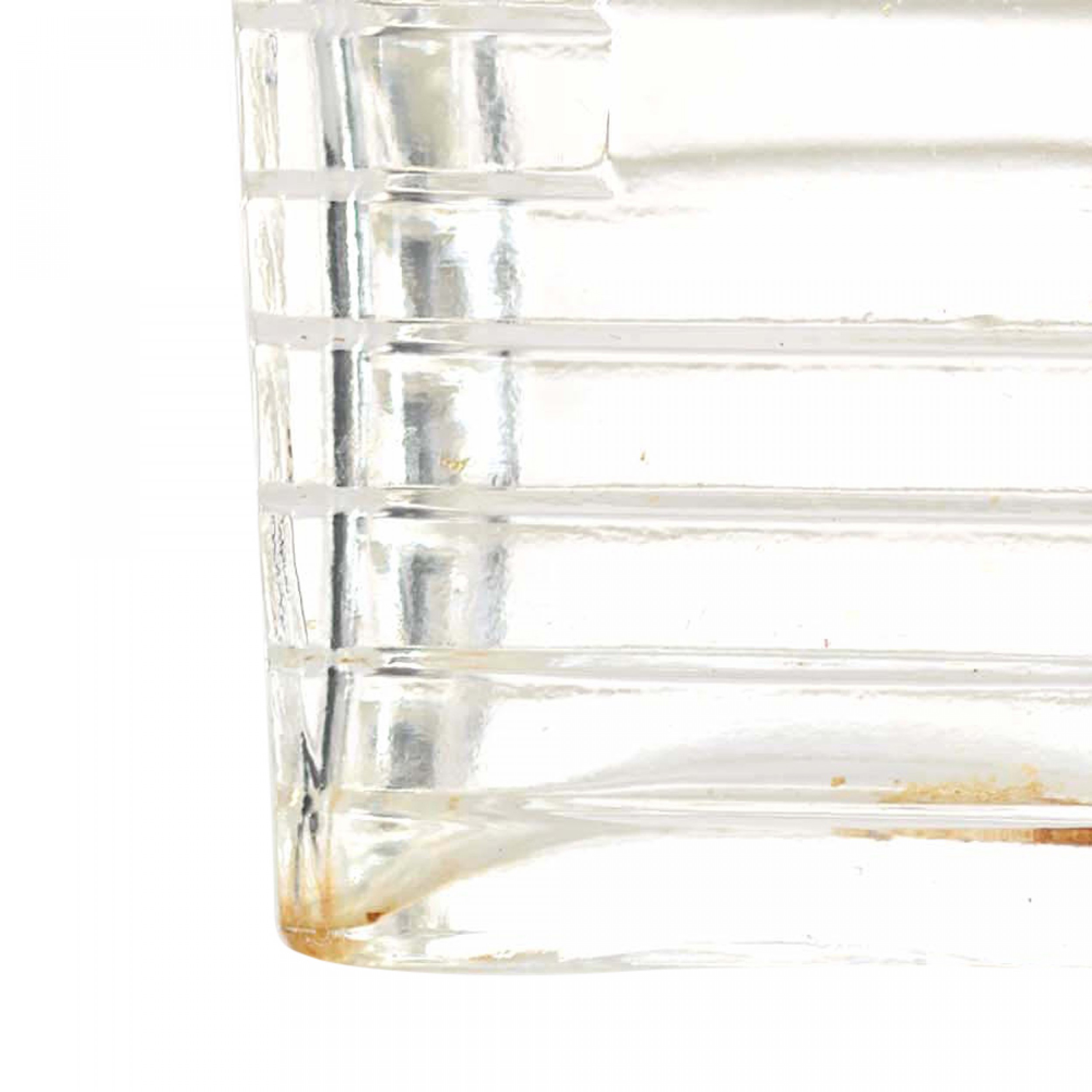 French Art Deco tapered rectangular clear glass perfume bottle with horizontal ribbing and a black plastic twist-off stopper.