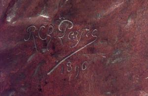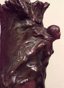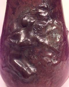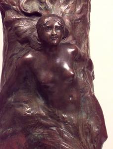 French Art Nouveau floor vase with relief of nude women having a tapered cylindrical shape (signed: R C E PEYRE 1896).