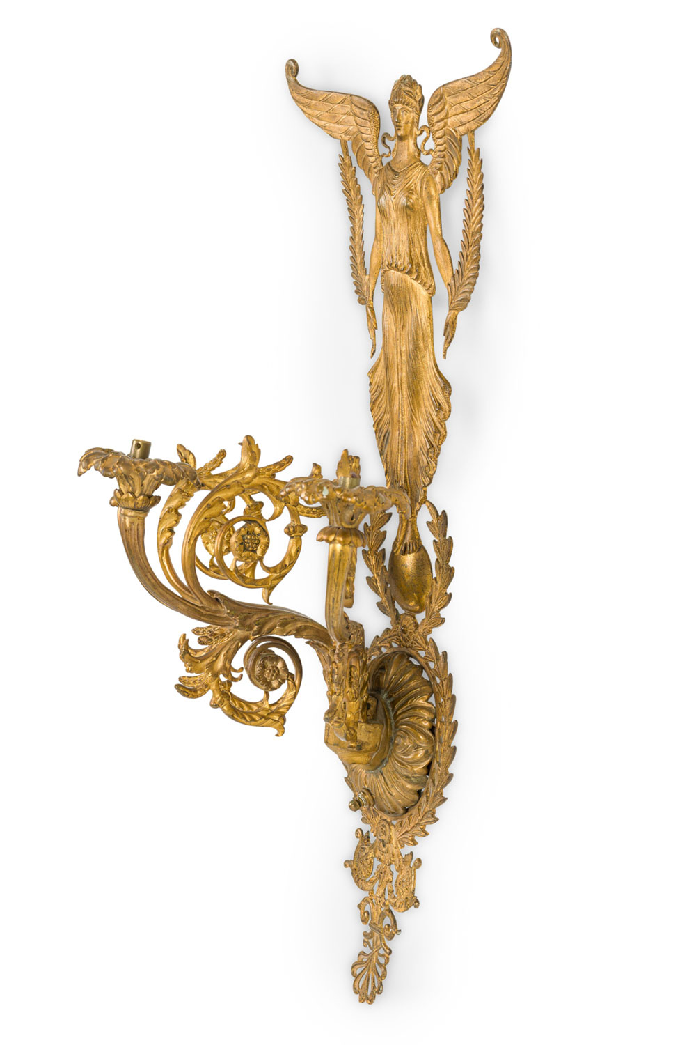 French Empire 3-arm gilt bronze wall sconce with a winged figure holding 2 laural branches (can be electrified)