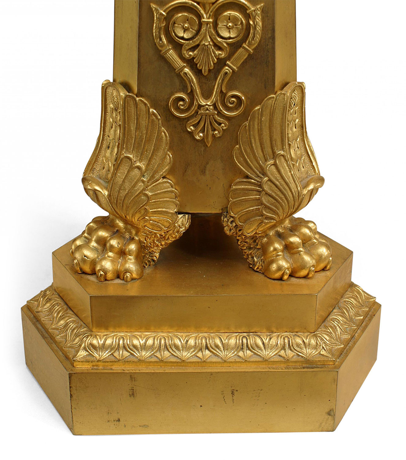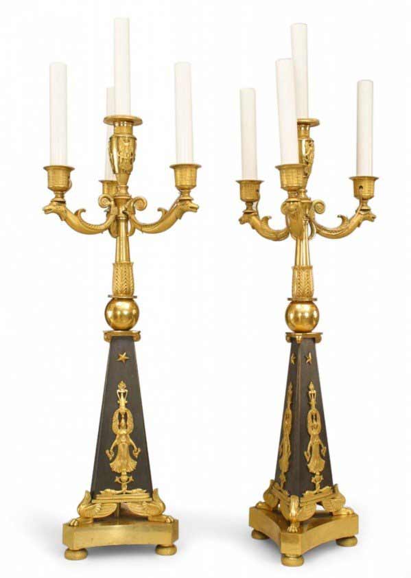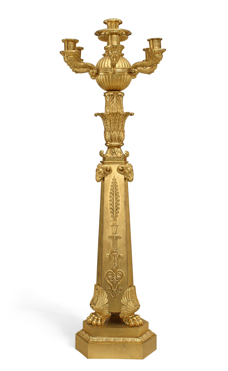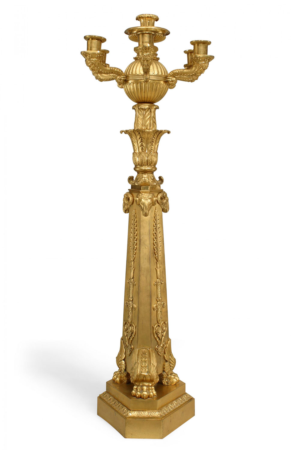 PAIR of French Empire bronze dore 6 arm candelabras with 3 ram heads and 3 claw feet supported on a 6 sided triangular base. (PRICED AS PAIR).
