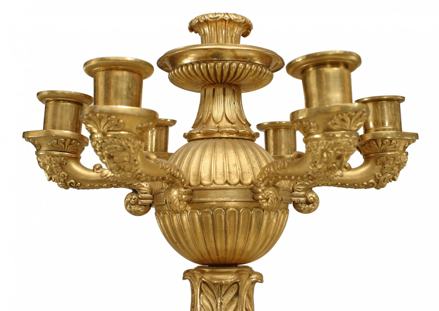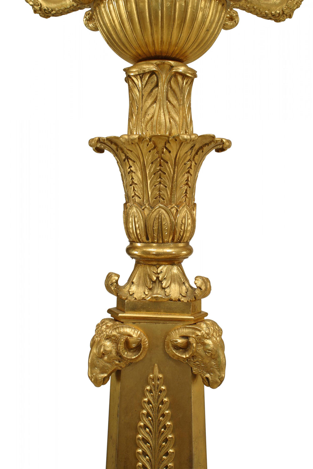 PAIR of French Empire bronze dore 6 arm candelabras with 3 ram heads and 3 claw feet supported on a 6 sided triangular base. (PRICED AS PAIR)