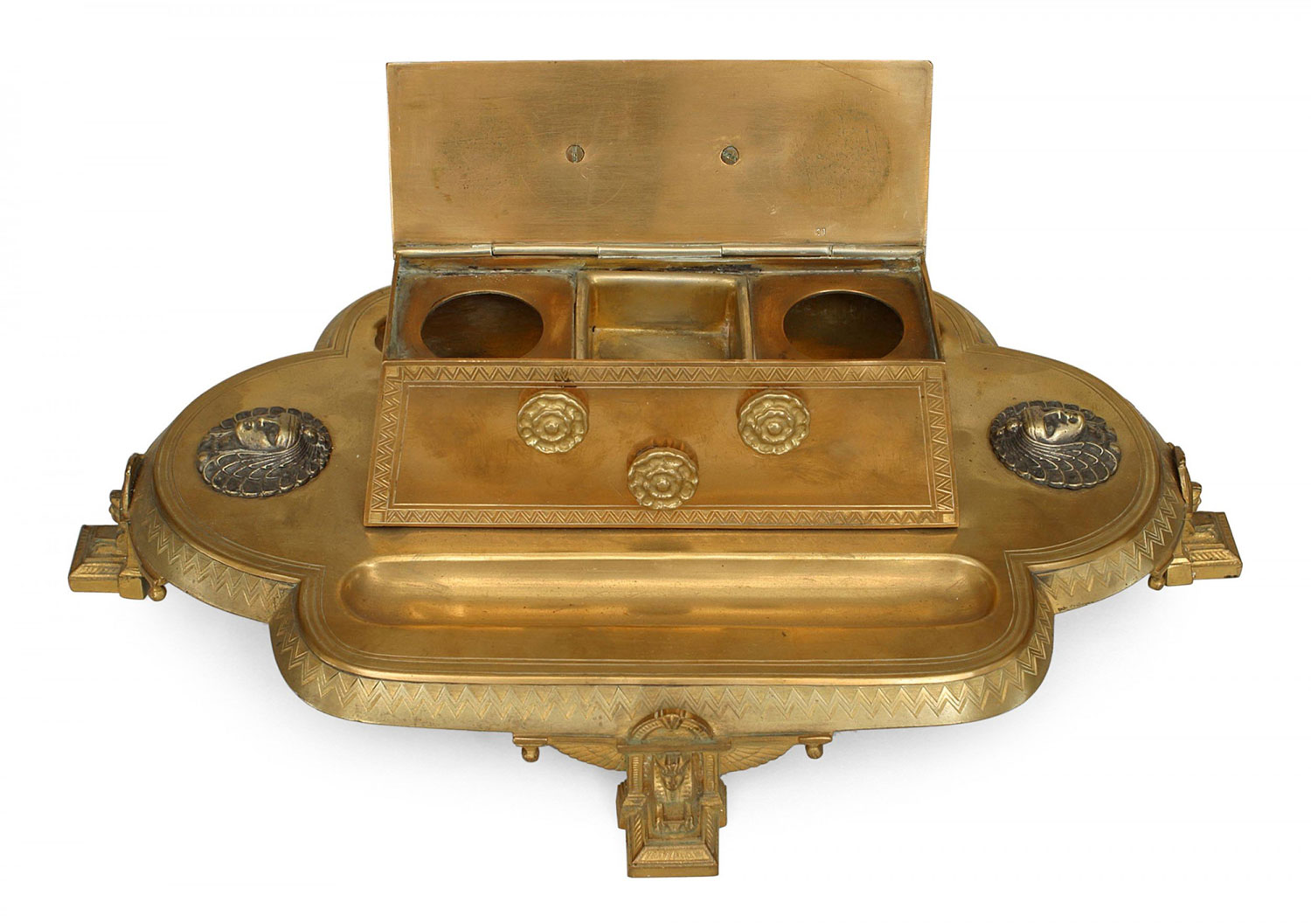 French Empire-style (19th Century) bronze inkwell with silver Egyptian motifs and sphinx top.