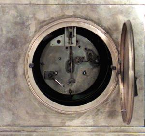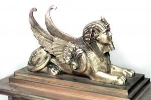 French Empire-style (19th Century) bronze dore mantel clock with claw feet and a sphinx on top. (Related item: 032442) (Not working).