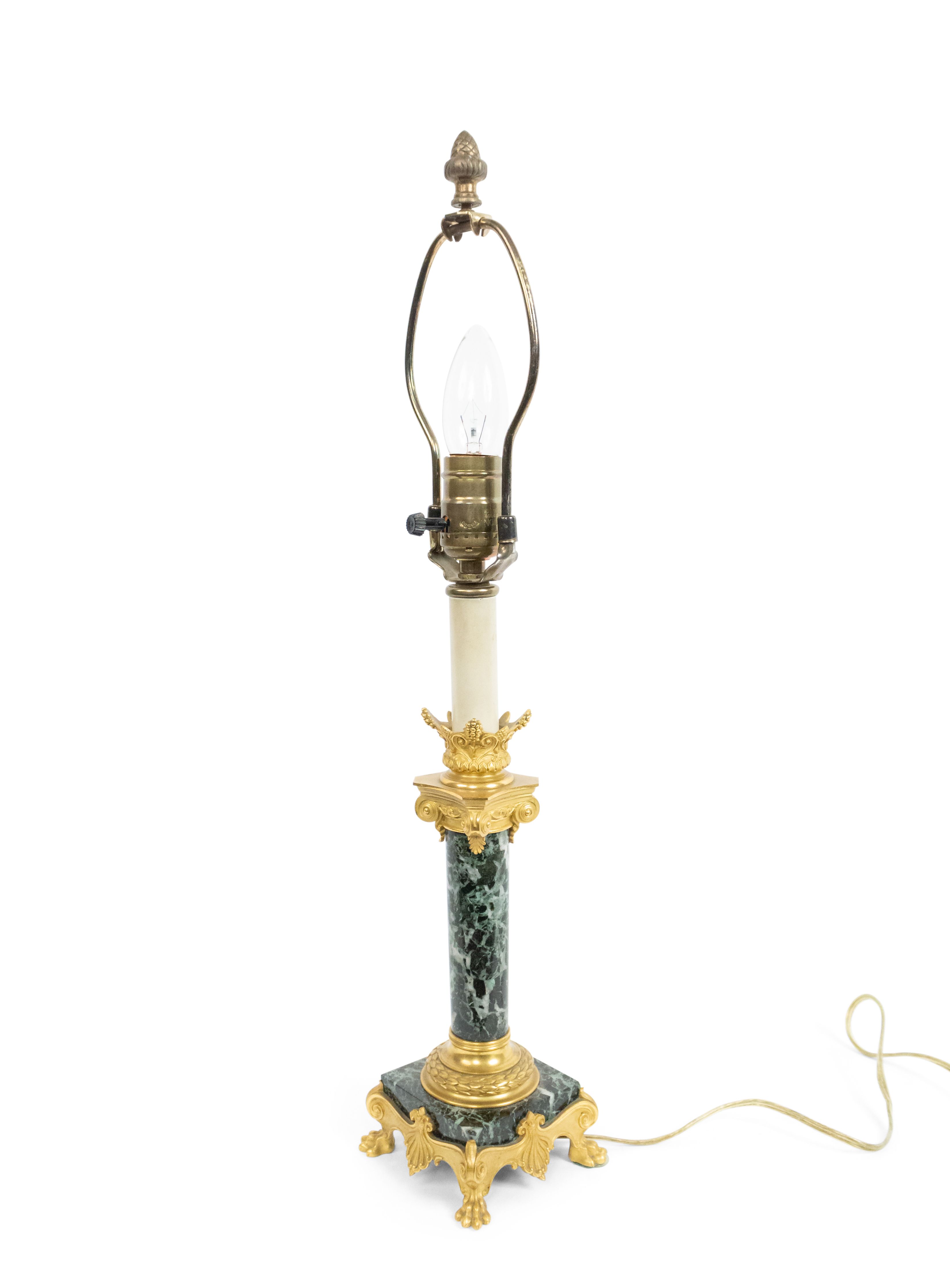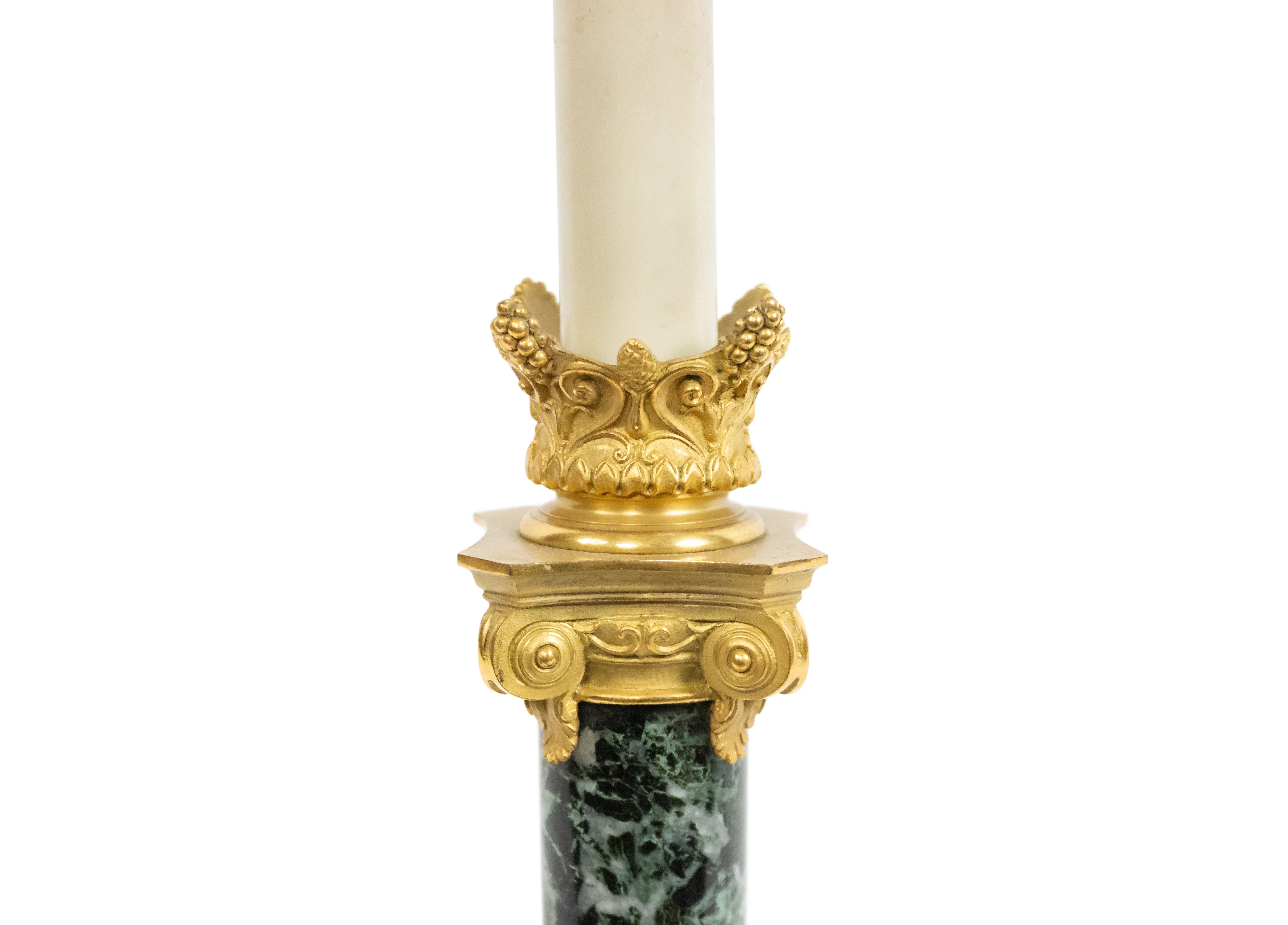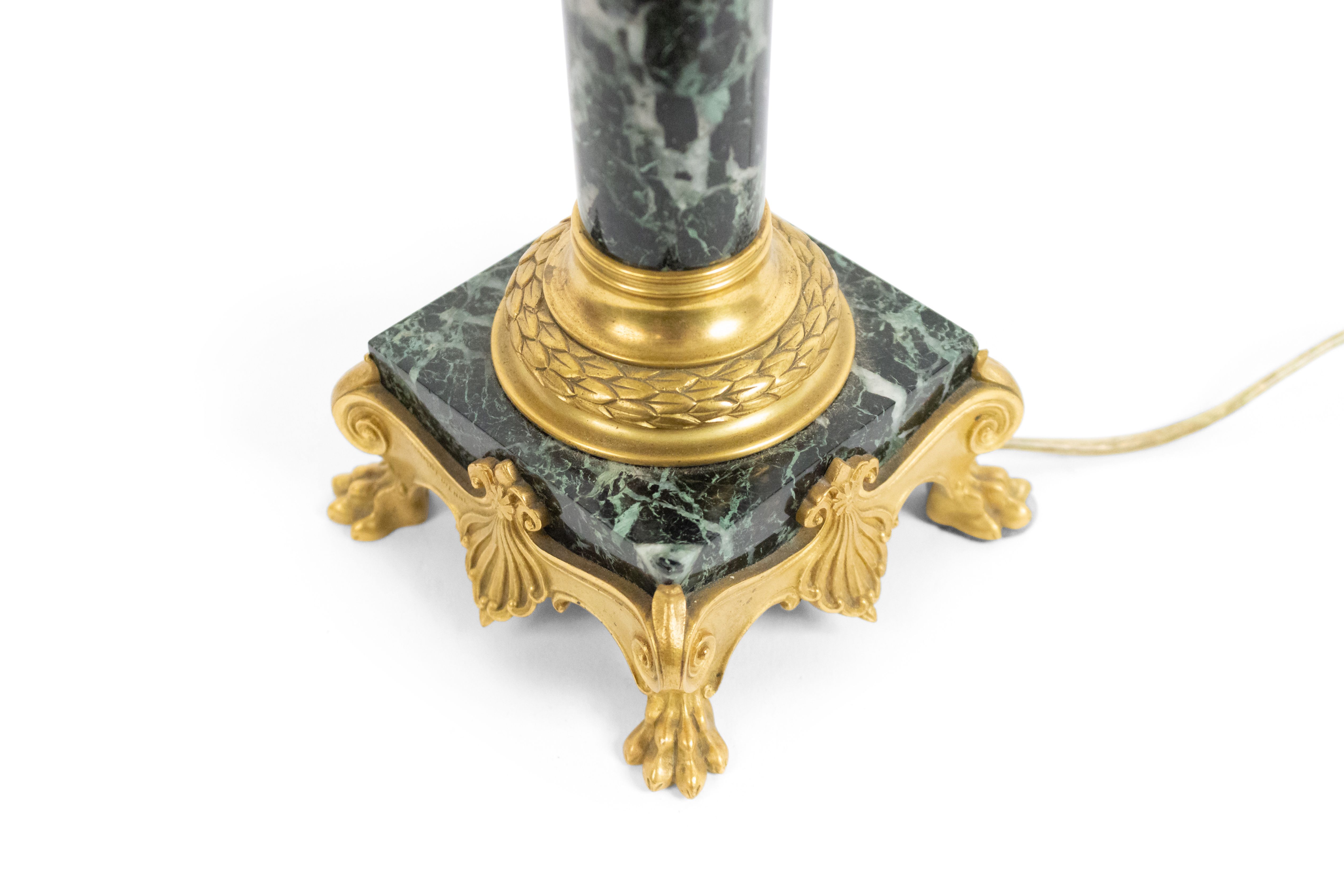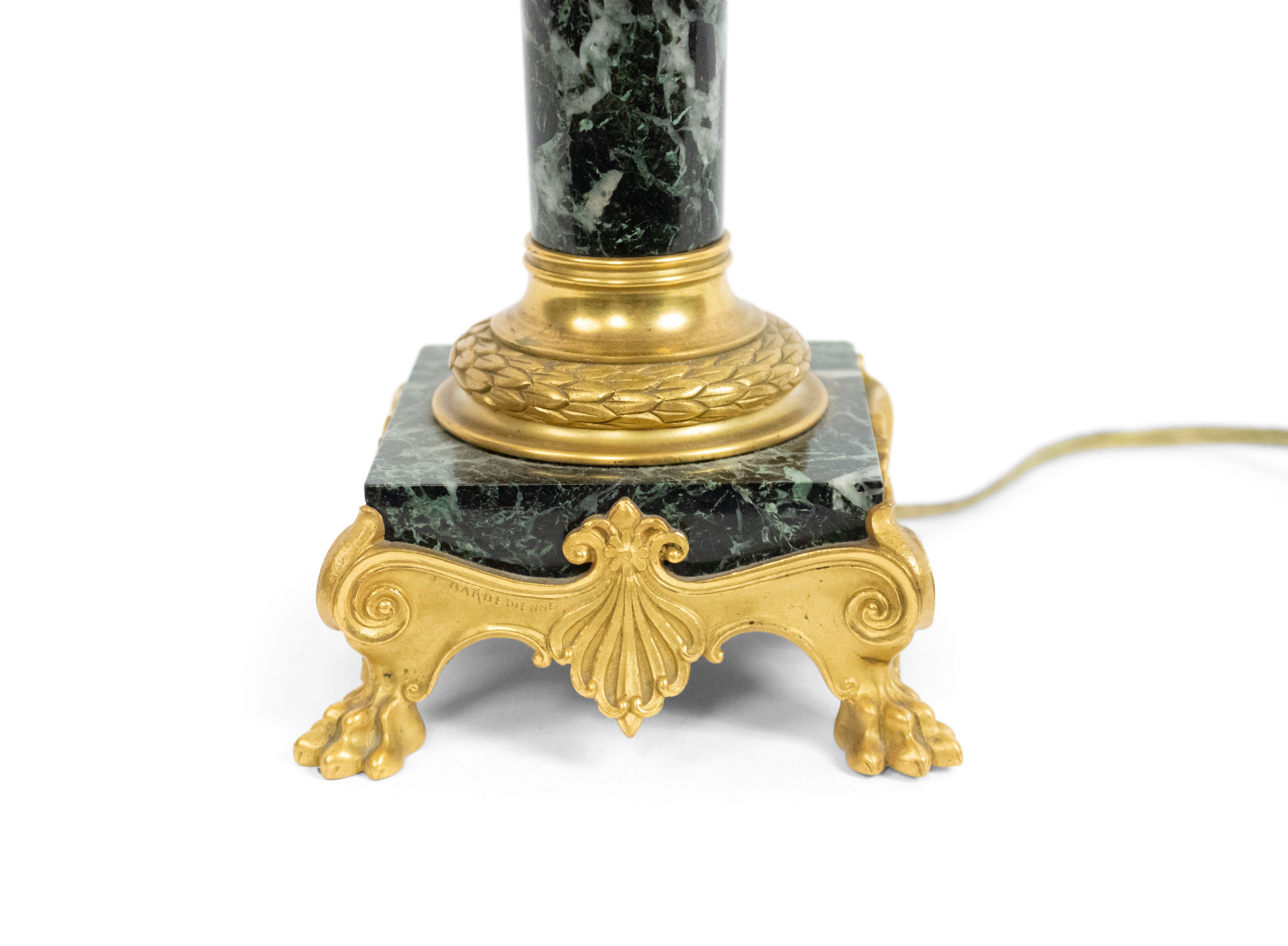 PAIR of French Empire style (19th Century) green marble column candlestick lamps with bronze dore trimmed capital and square base (signed F. BARBEDIENNE) (PRICED AS PAIR).