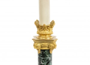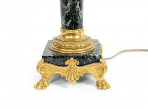 PAIR of French Empire style (19th Century) green marble column candlestick lamps with bronze dore trimmed capital and square base (signed F. BARBEDIENNE) (PRICED AS PAIR)..